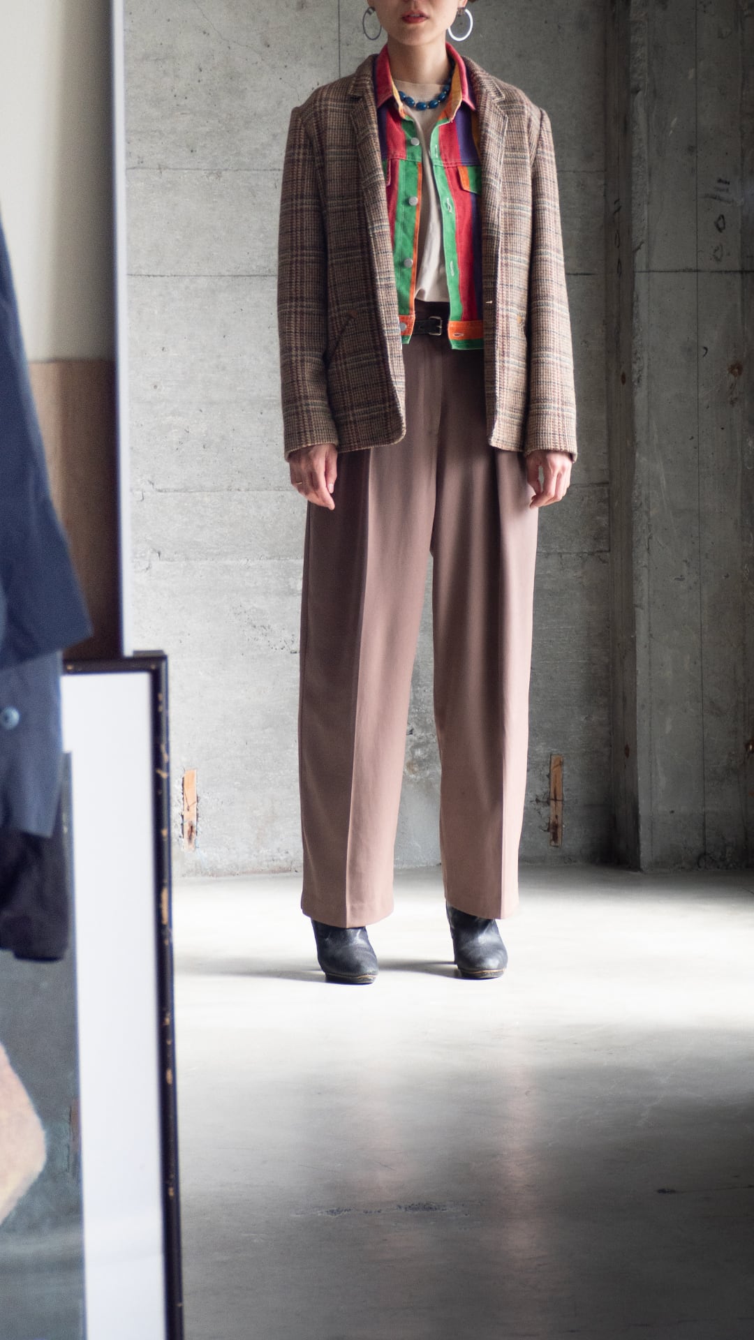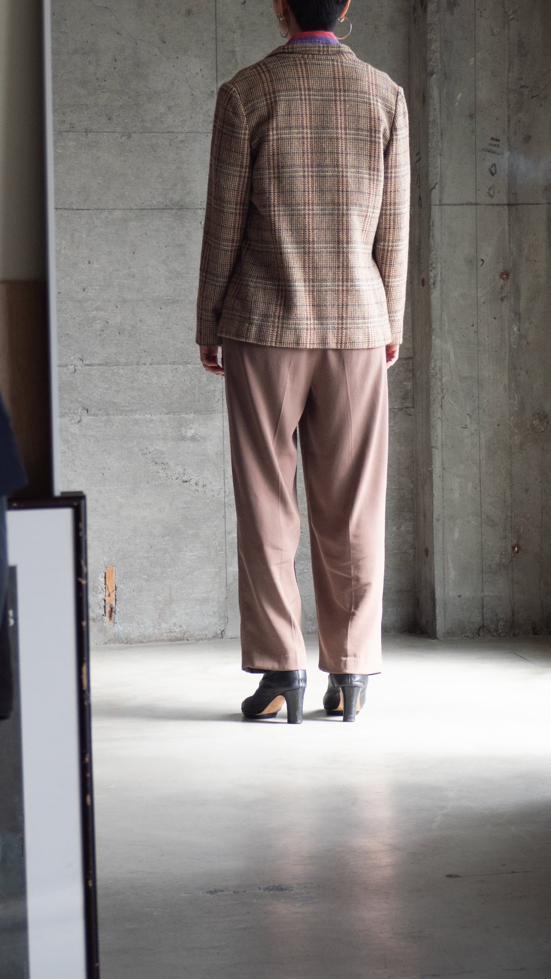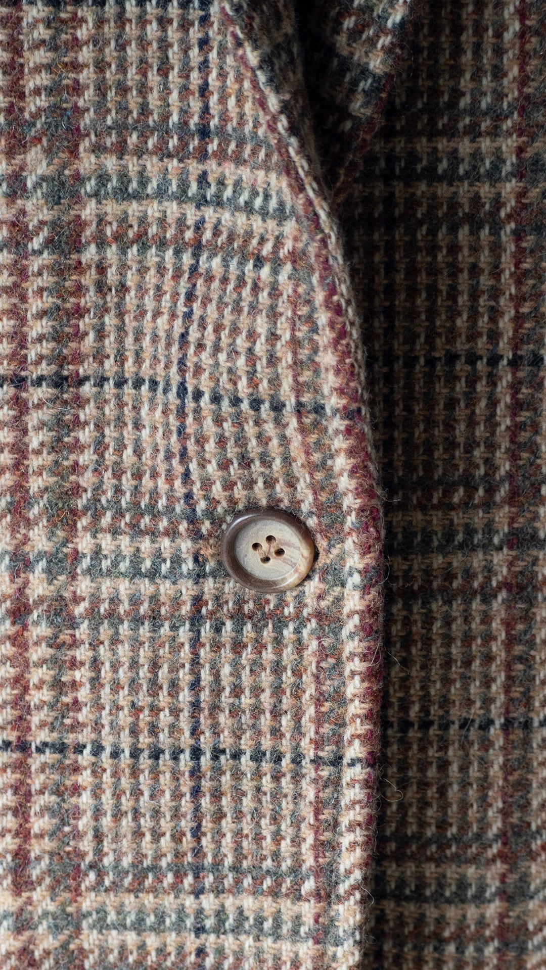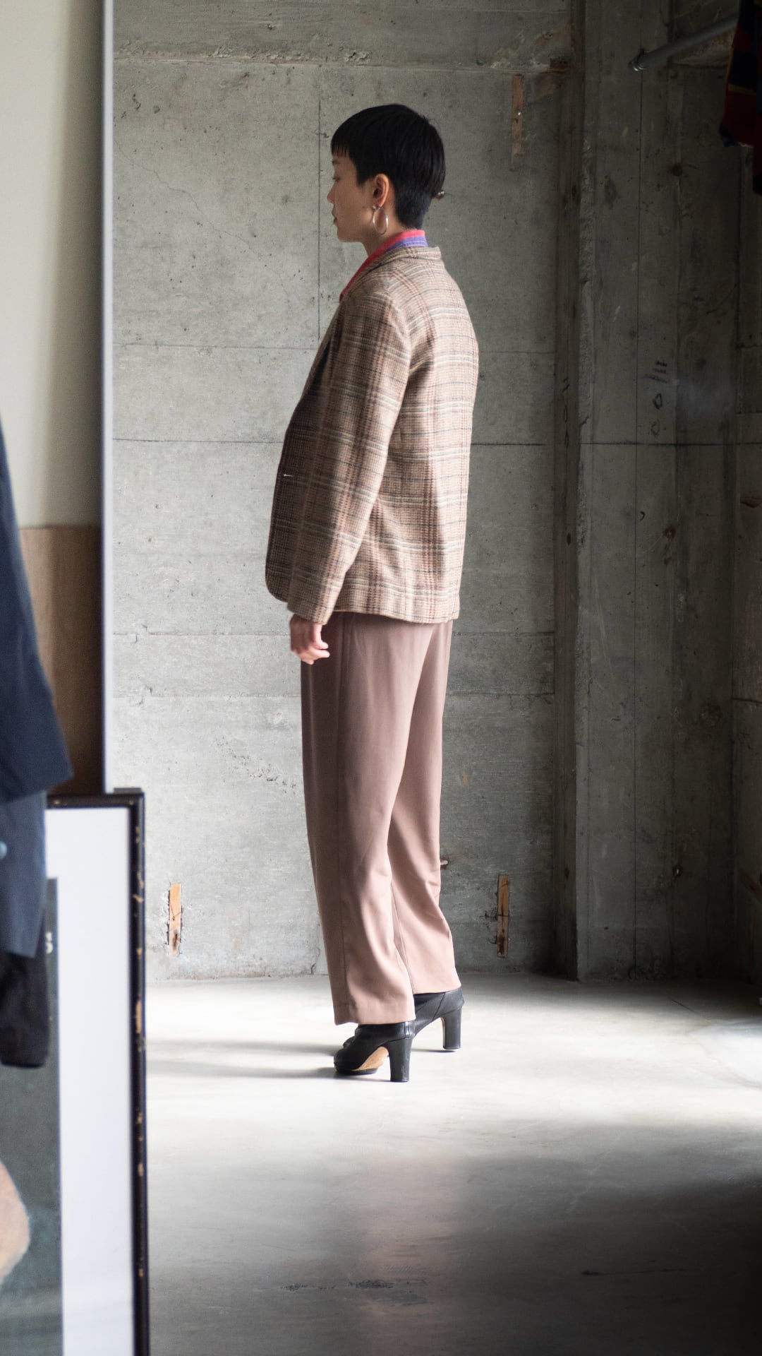 今回の一着は、ウール70%ナイロン30%の紡毛ツイードを用いたラペルジャケット。ボディは一つボタンで深めの前合わせになります。