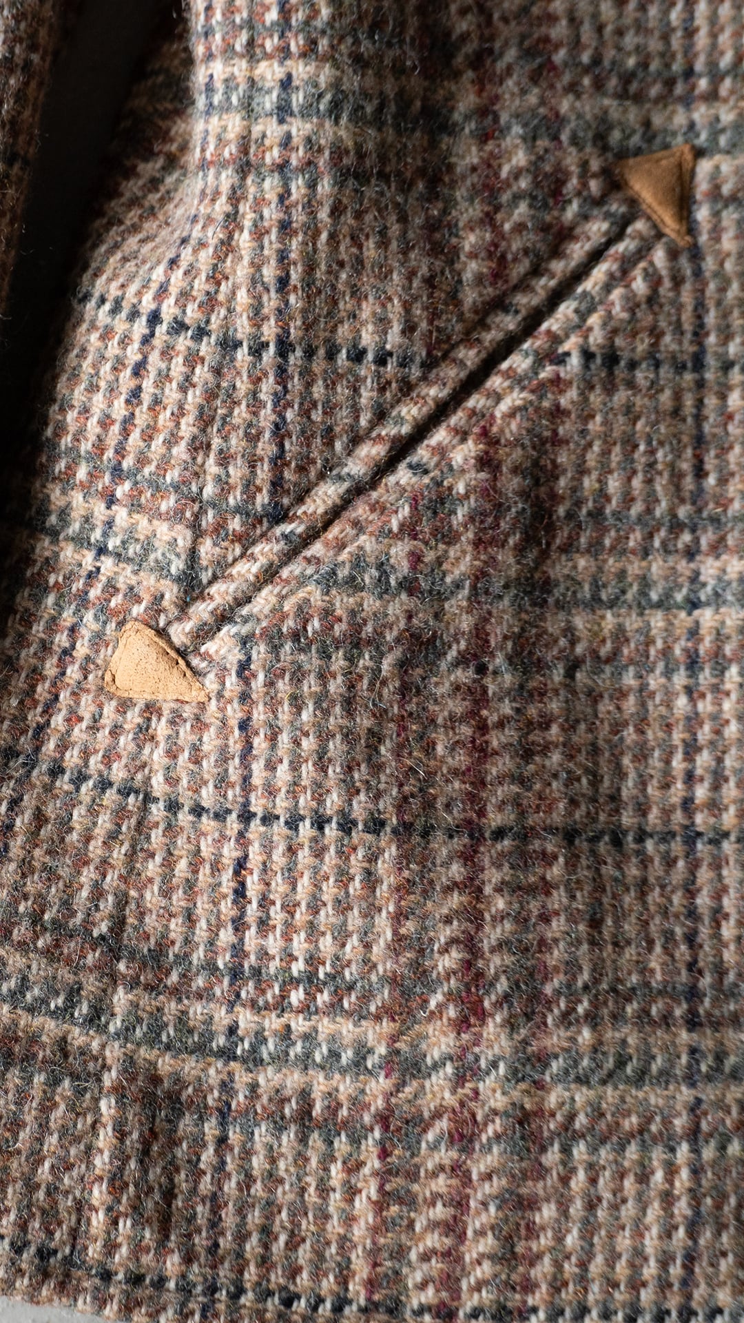 両腰のポケットは両玉縁でその端々にはレザーで三角留めがなされています。アメリカンクラシックウェアではマッキノーコートやハンティングジャケットなどに用いられる三角留め+レザーという仕様ですが、普遍的なオールド仕様を落とし込んだ丁寧な作りに感銘、クールさを感じます。