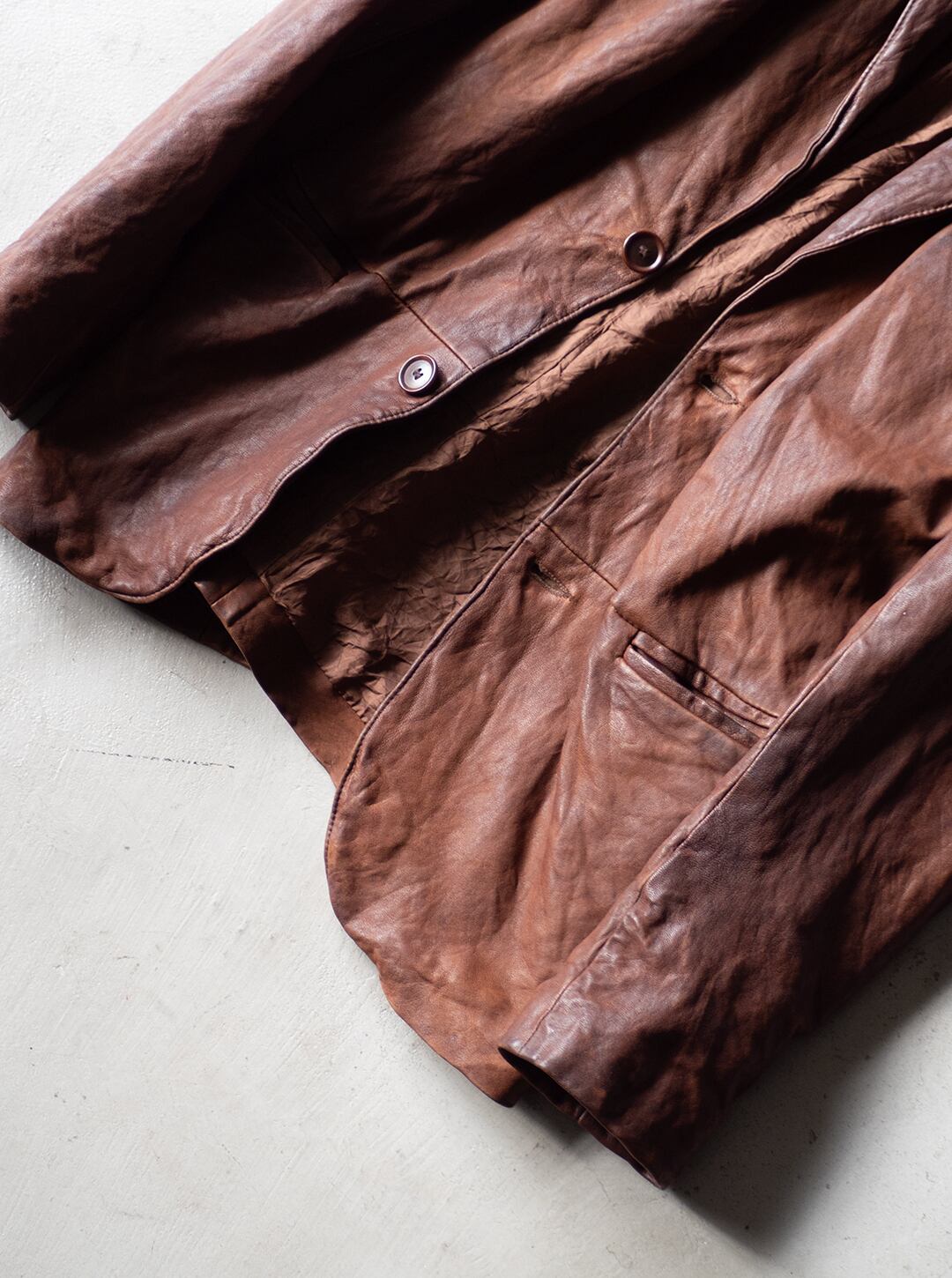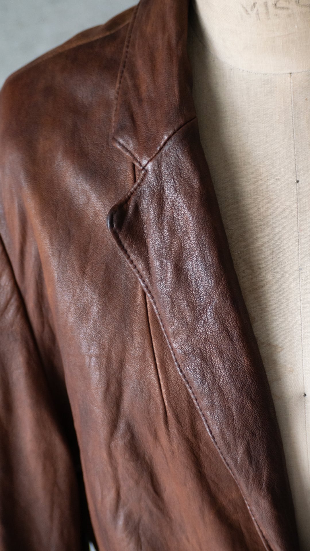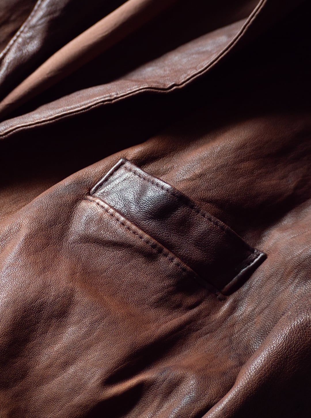 裏地付きのラペルジャケットですが、芯材が弱く、レザーの動きがダイレクトのジャケットに響き、襟や袖口、裾、ボタンホール周りなど、凹凸とドレープ、シワのある立体的な表情にとても魅力があります。