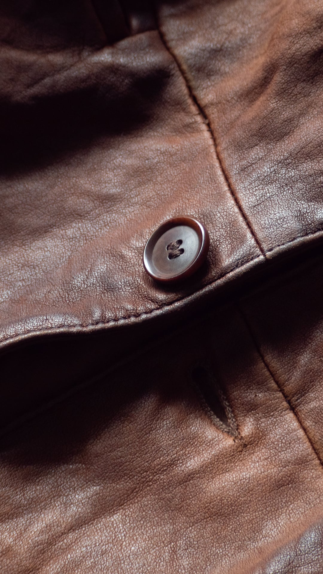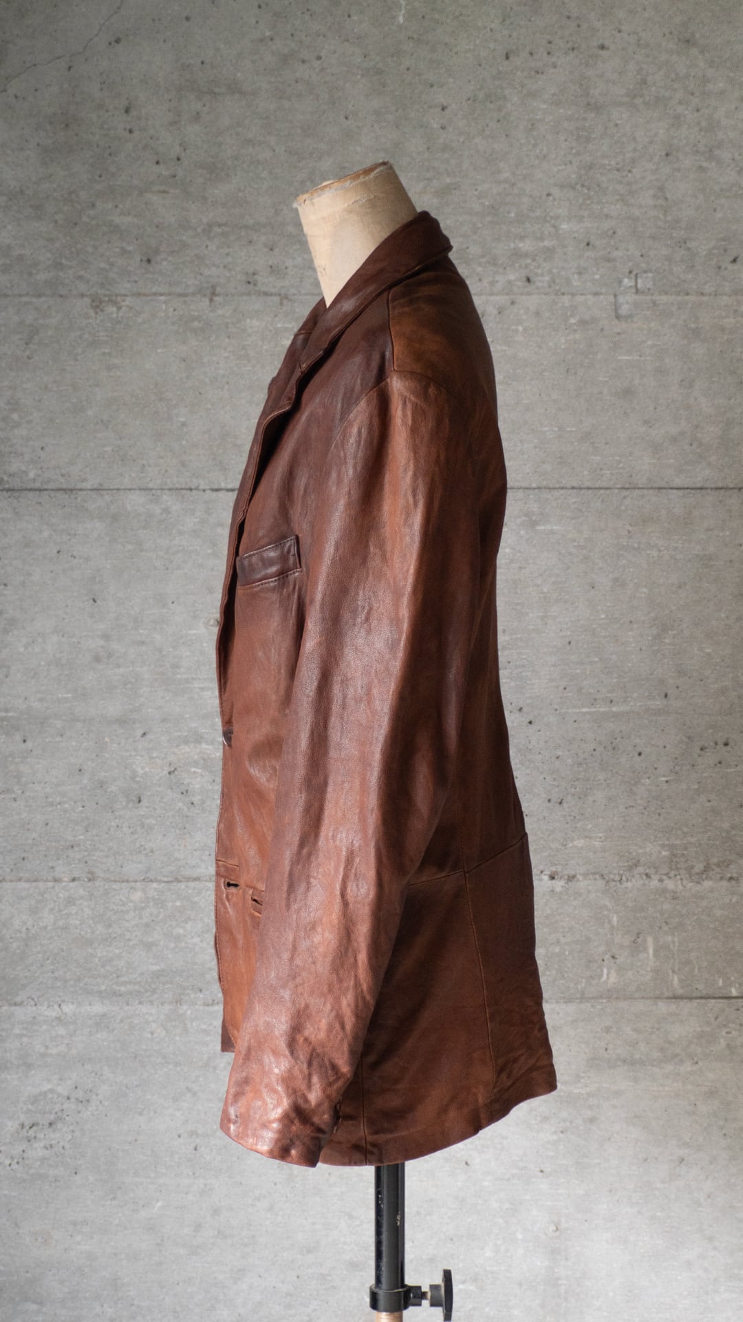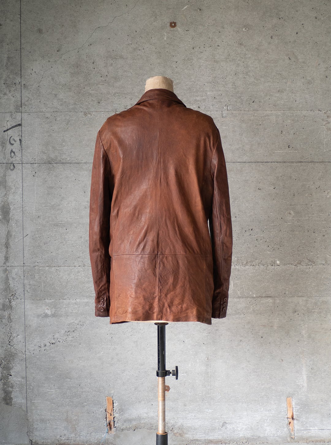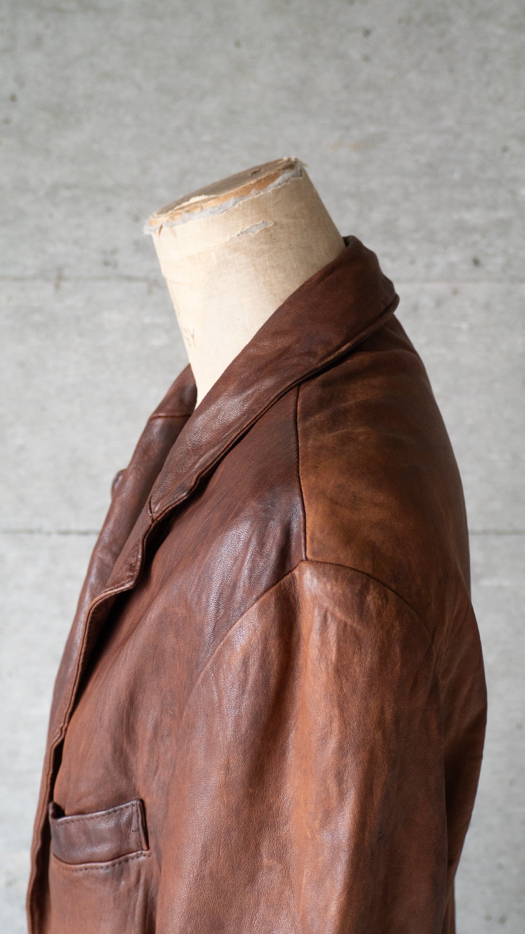 裏地付きのラペルジャケットですが、芯材が弱く、レザーの動きがダイレクトのジャケットに響き、襟や袖口、裾、ボタンホール周りなど、凹凸とドレープ、シワのある立体的な表情にとても魅力があります。