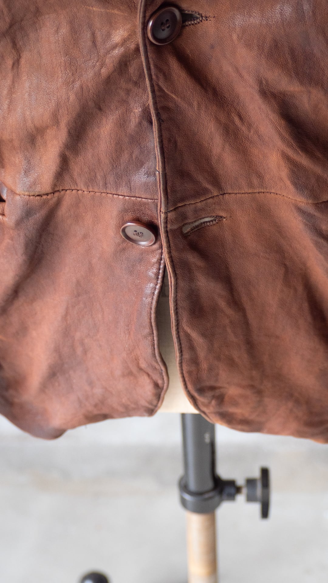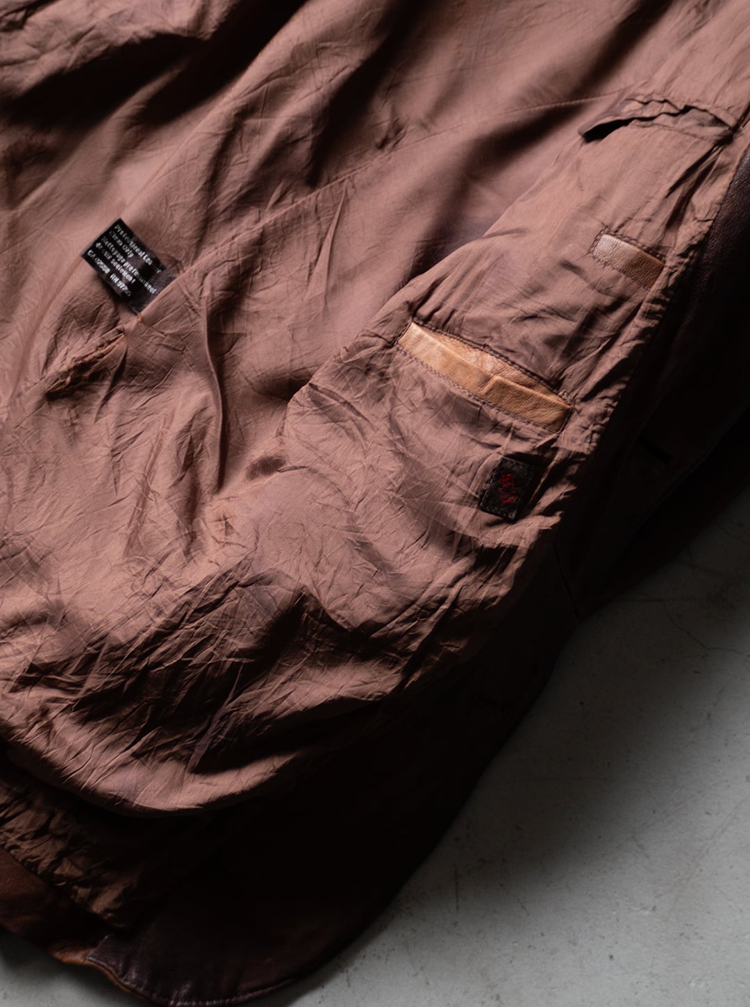 裏地に破れが数ヶ所(首元裏側タグ付近に2ヶ所、左脇腹あたりに2ヶ所)ございます。レザーがとても柔らかく着用する方によって伸びが予想され、以後も破れが進行する可能性があると判断したため、裏地の修繕(ミシンステッチで縫い合わせる)はあえて行っていません。場所的に、着用時に支障がなく、また外見的な意匠にも問題ない為、そのように判断しております。