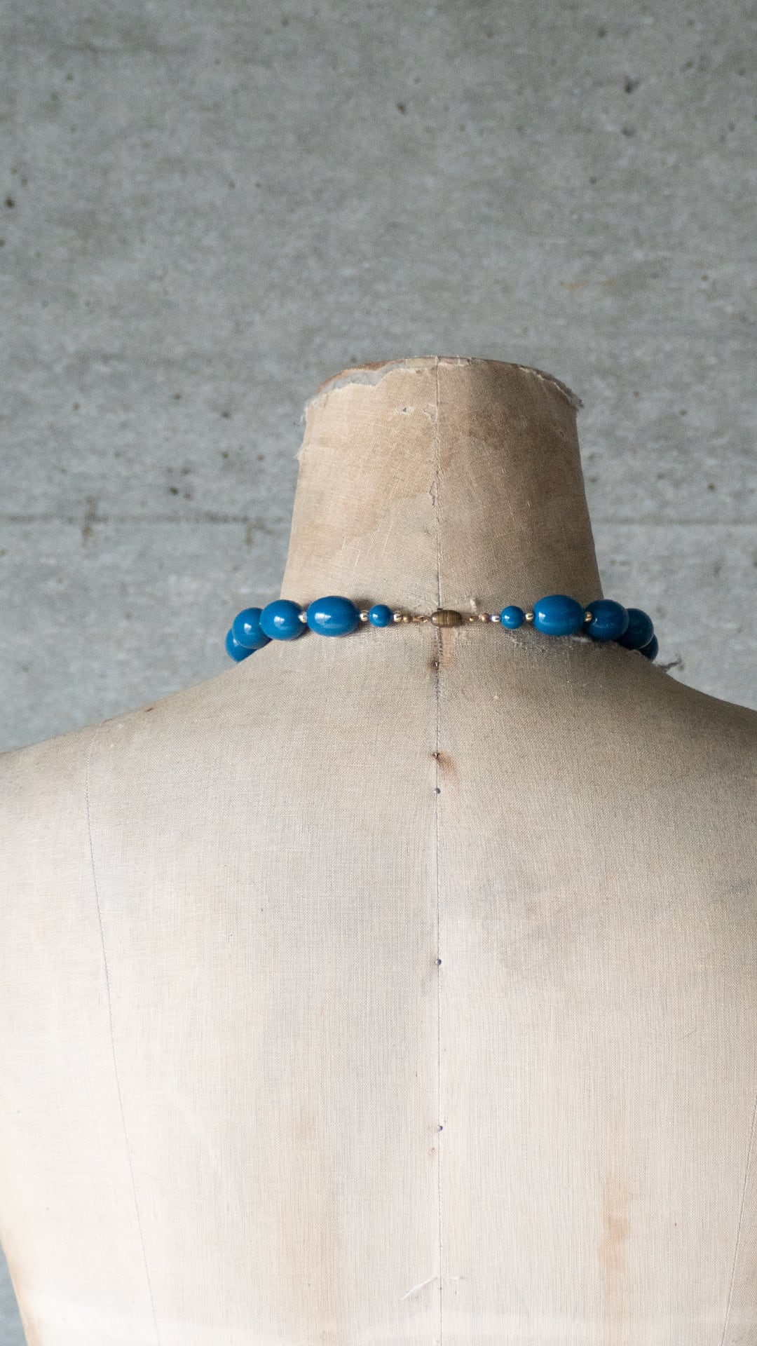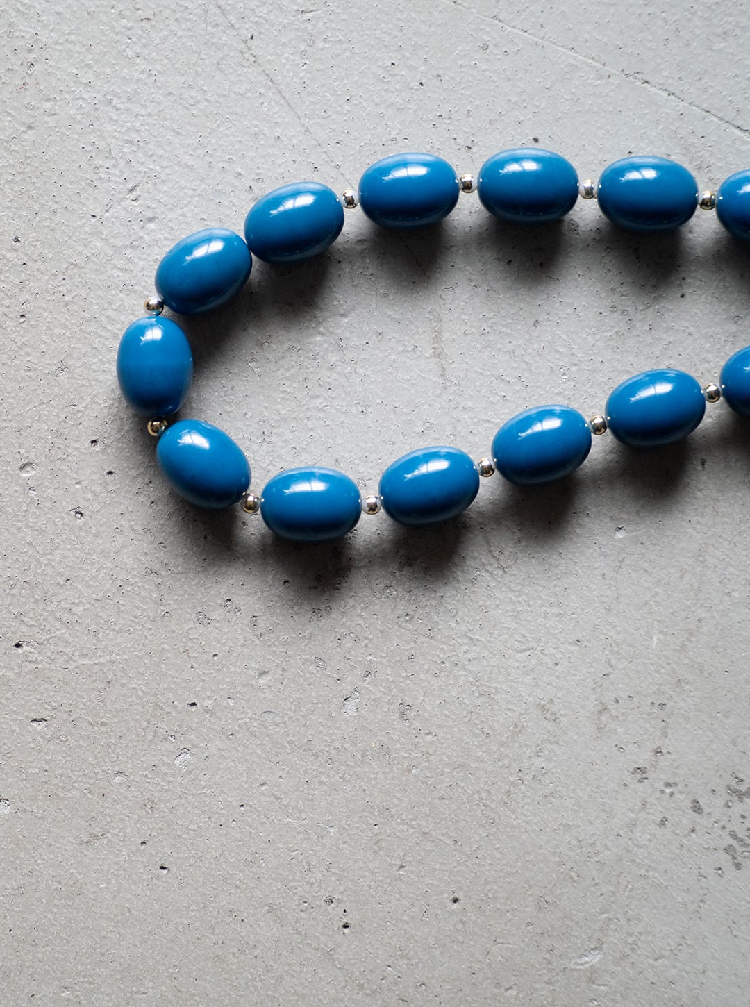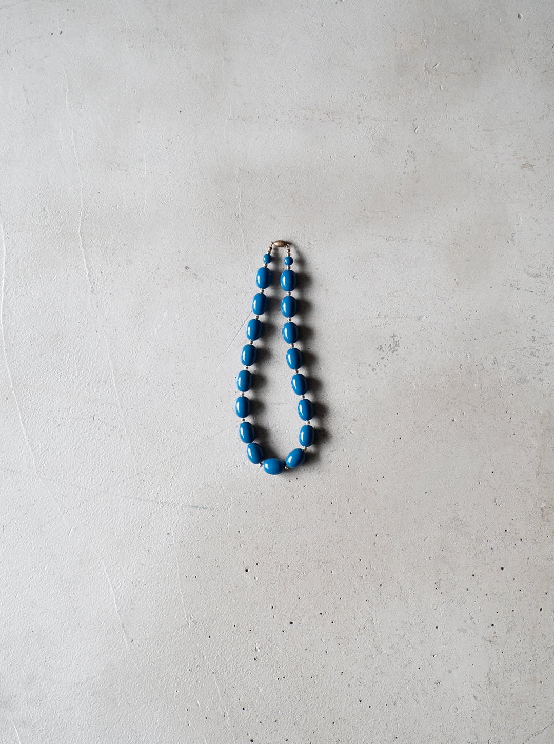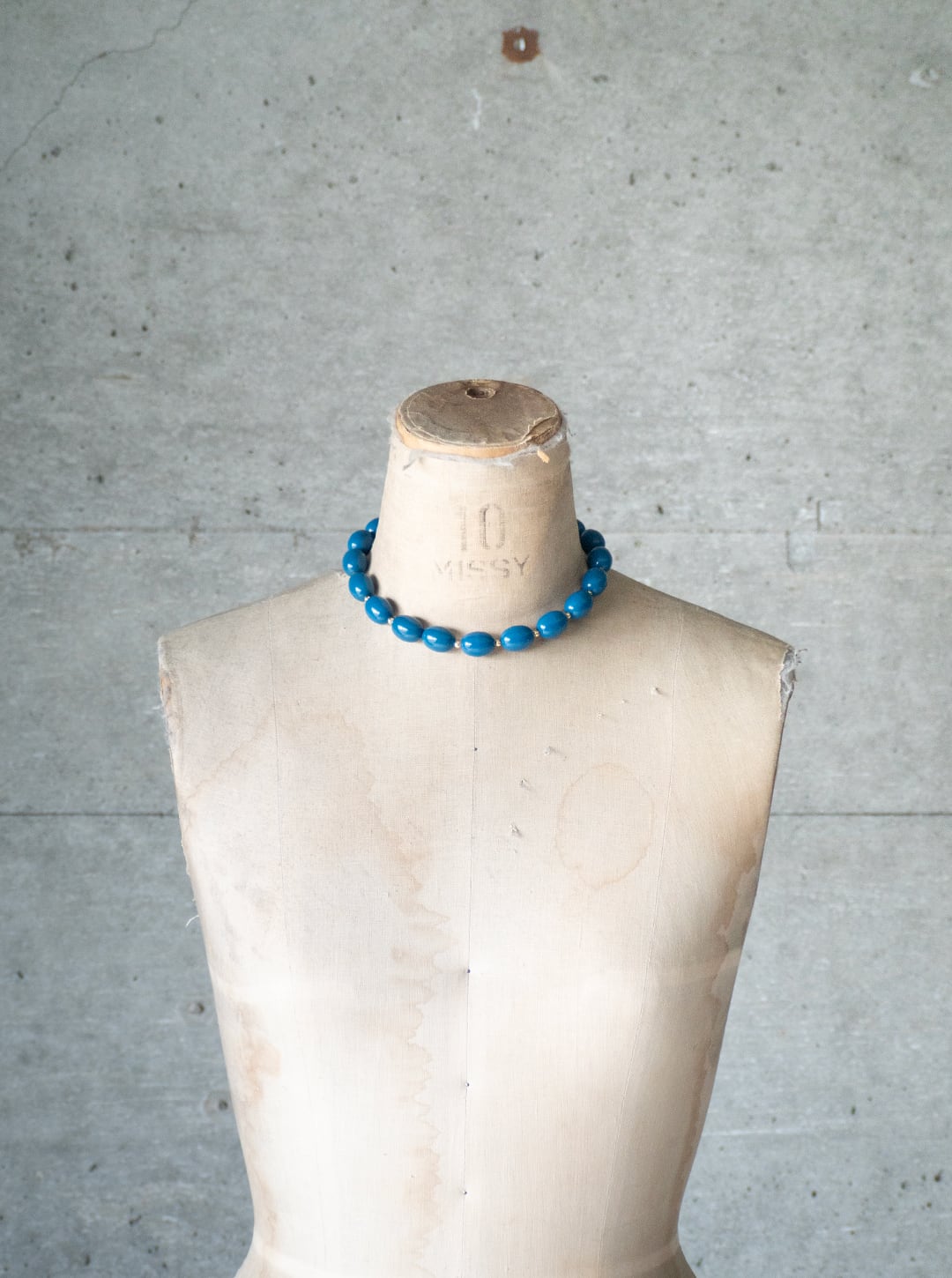青く、やや鈍い彩度のビーズを連ねたネックレスです。
