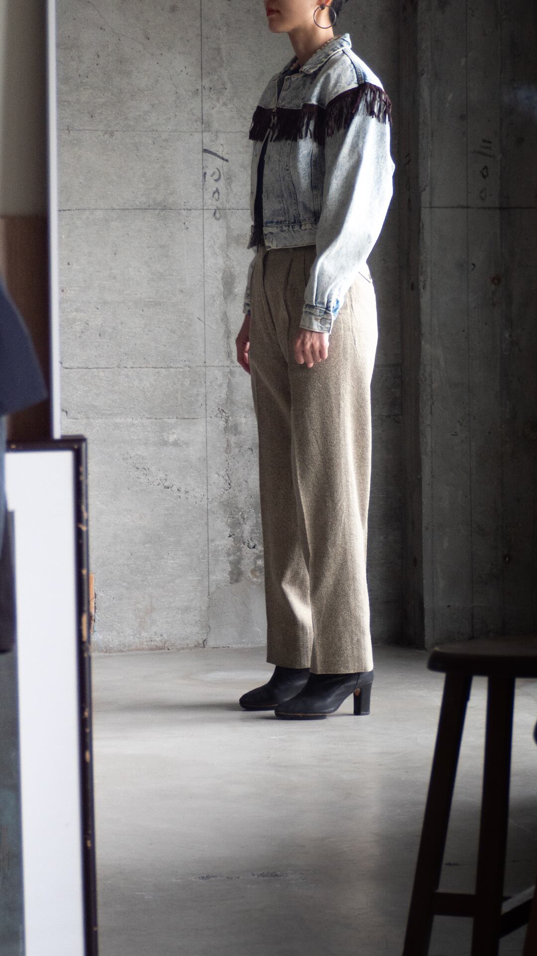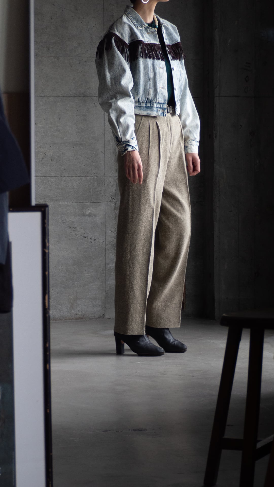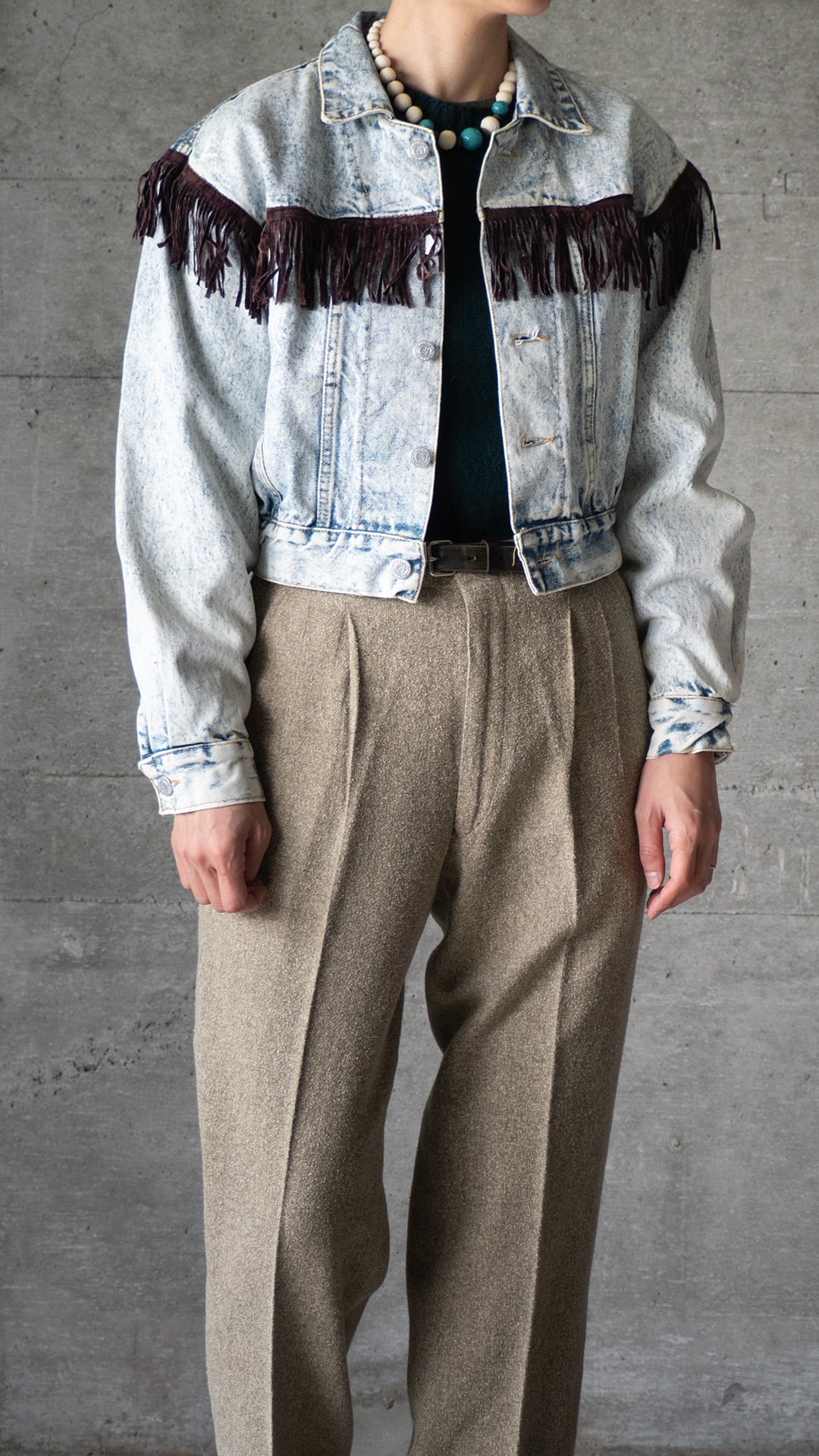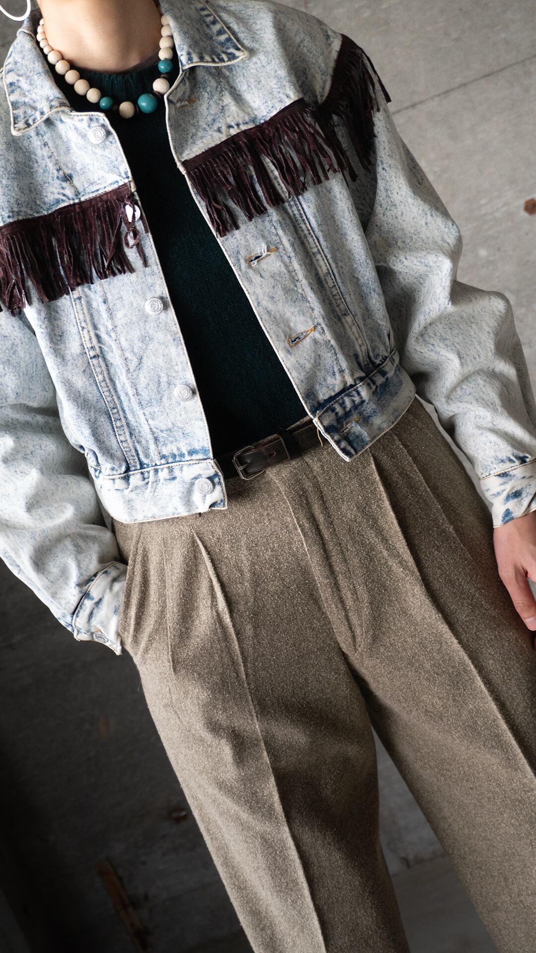 胸の切り替え、肩の切り替え位置にあしらわれたフリンジは、カウボーイやアメリカン・ウエスタンスタイルに由来。本来は雨水を逃がしたり、衣服のほつれを防ぐ実用的な目的でしたが、現代になるにつれ、ボヘミアンやフォークロアなファッションのアクセントへとなっていきます。