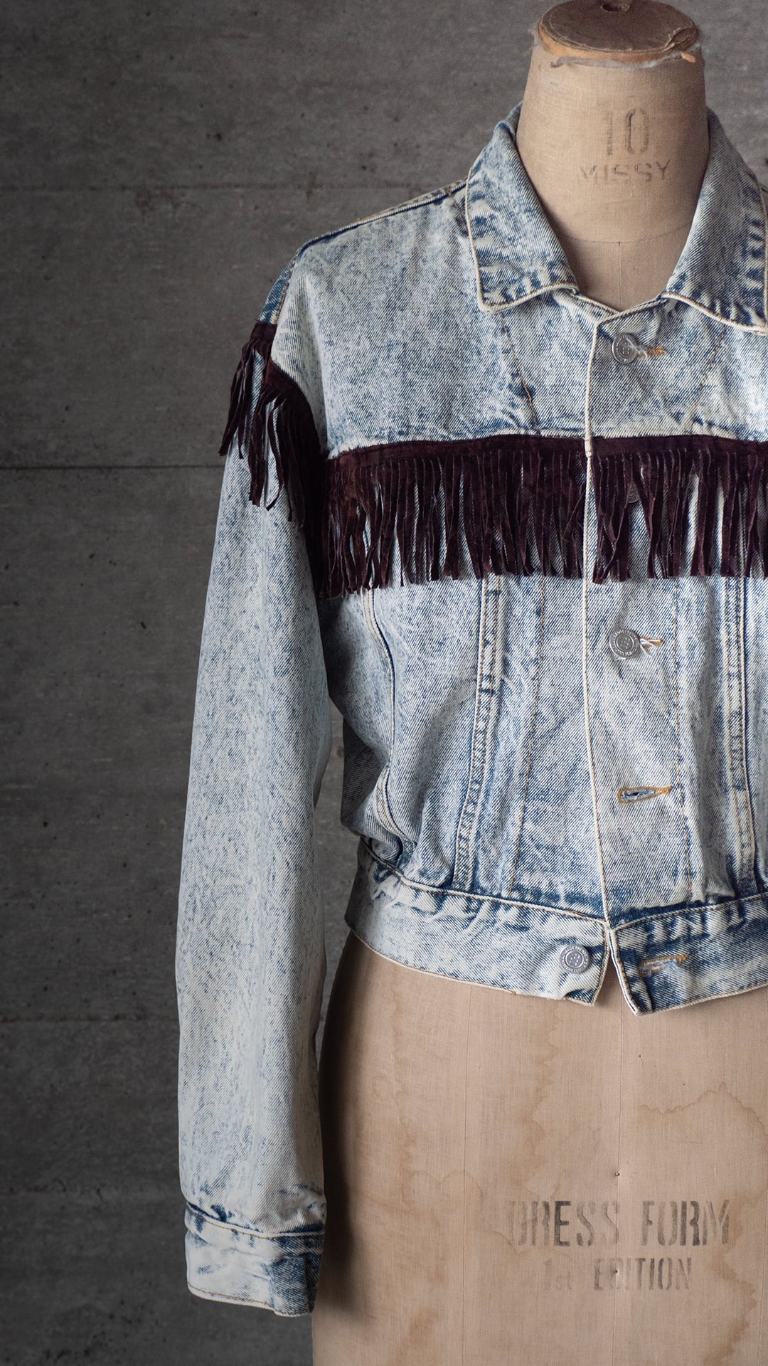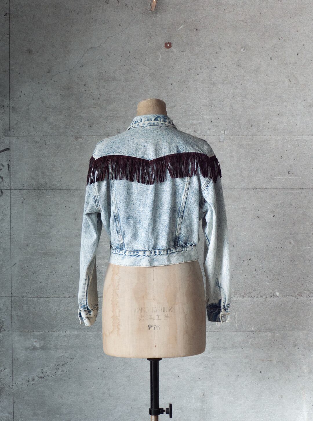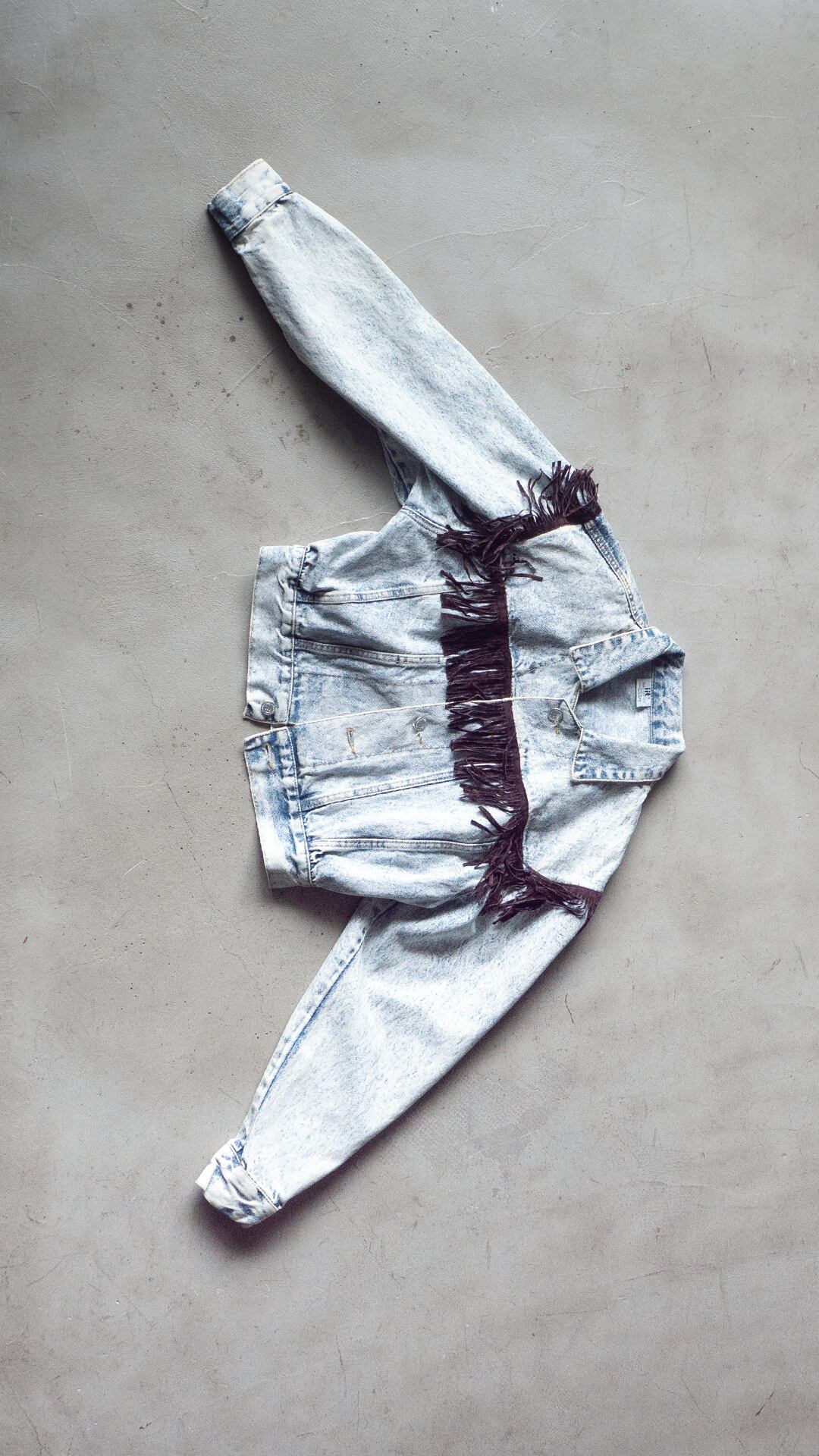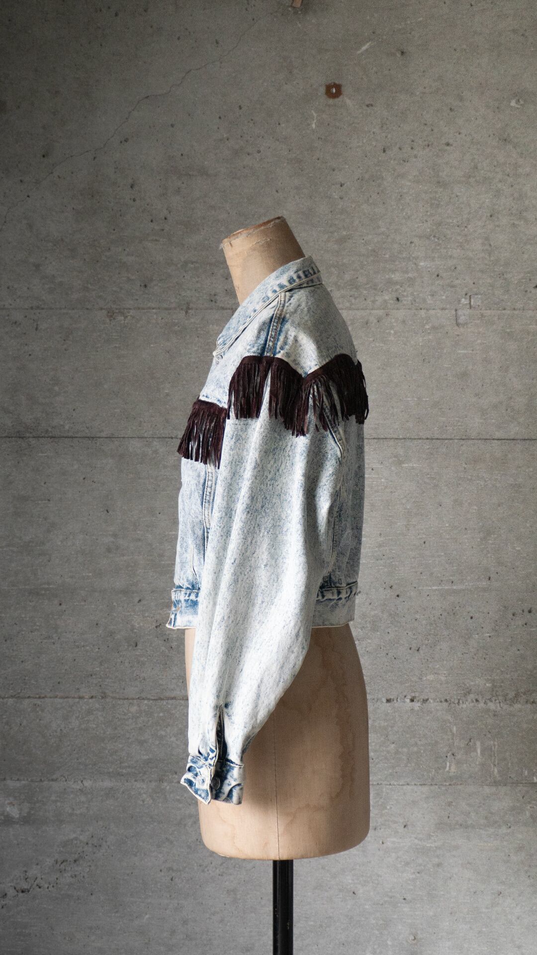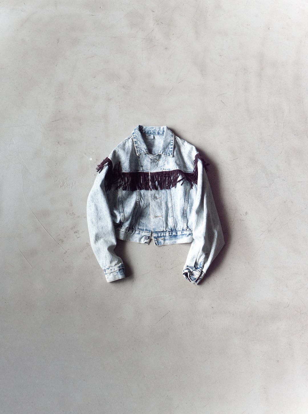 過度に色落ちを施したケミカルウォッシュ加工のフリンジ付きジャケットです。