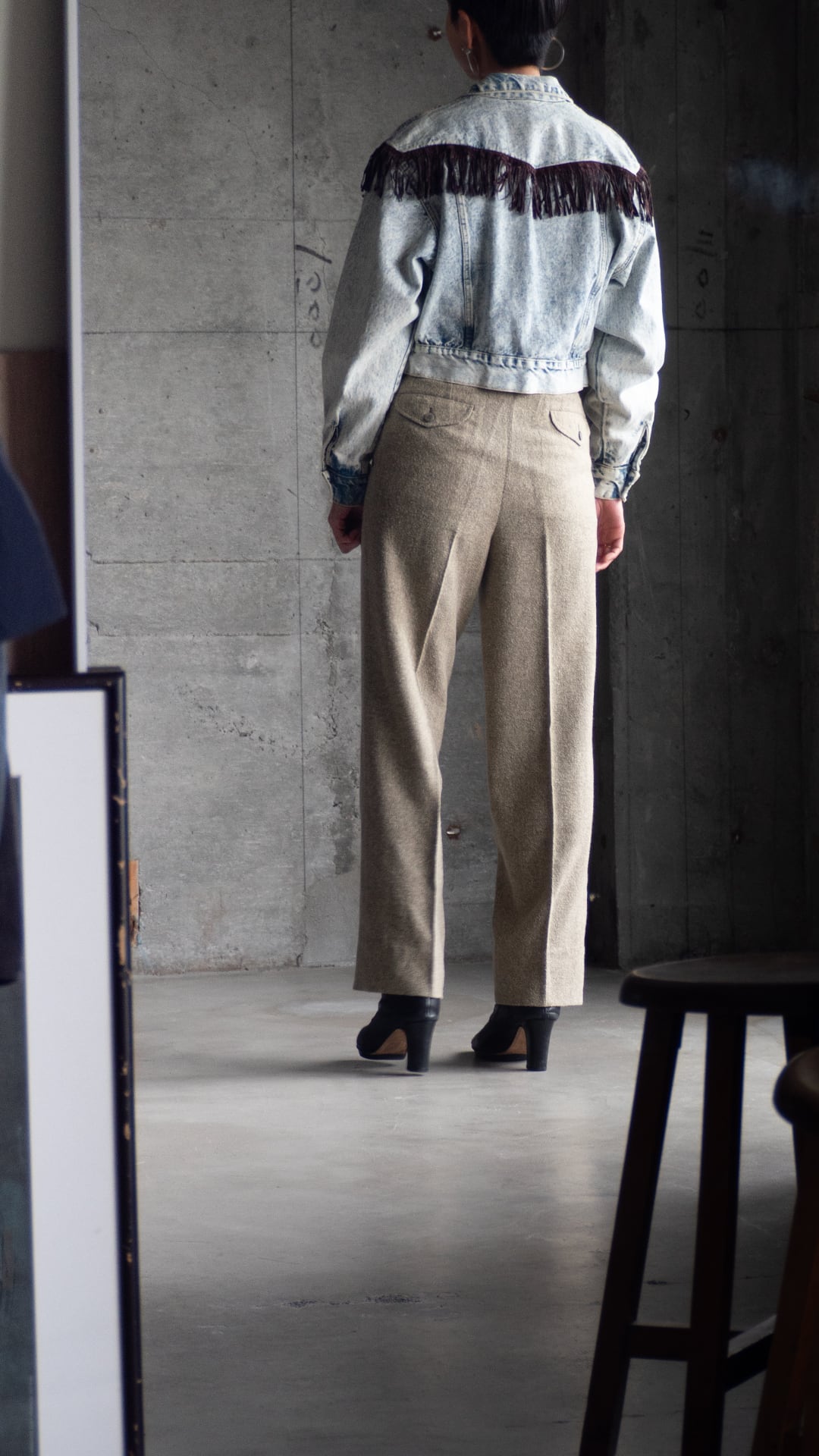 今回のジャケットは、ウエスタンモチーフのデザインを取り入れた一着。フリンジは茶色いベルベットを断ち切った房になります。