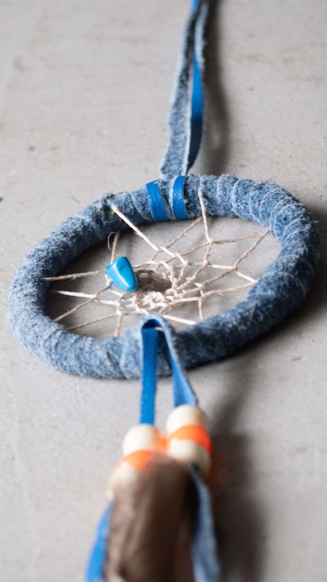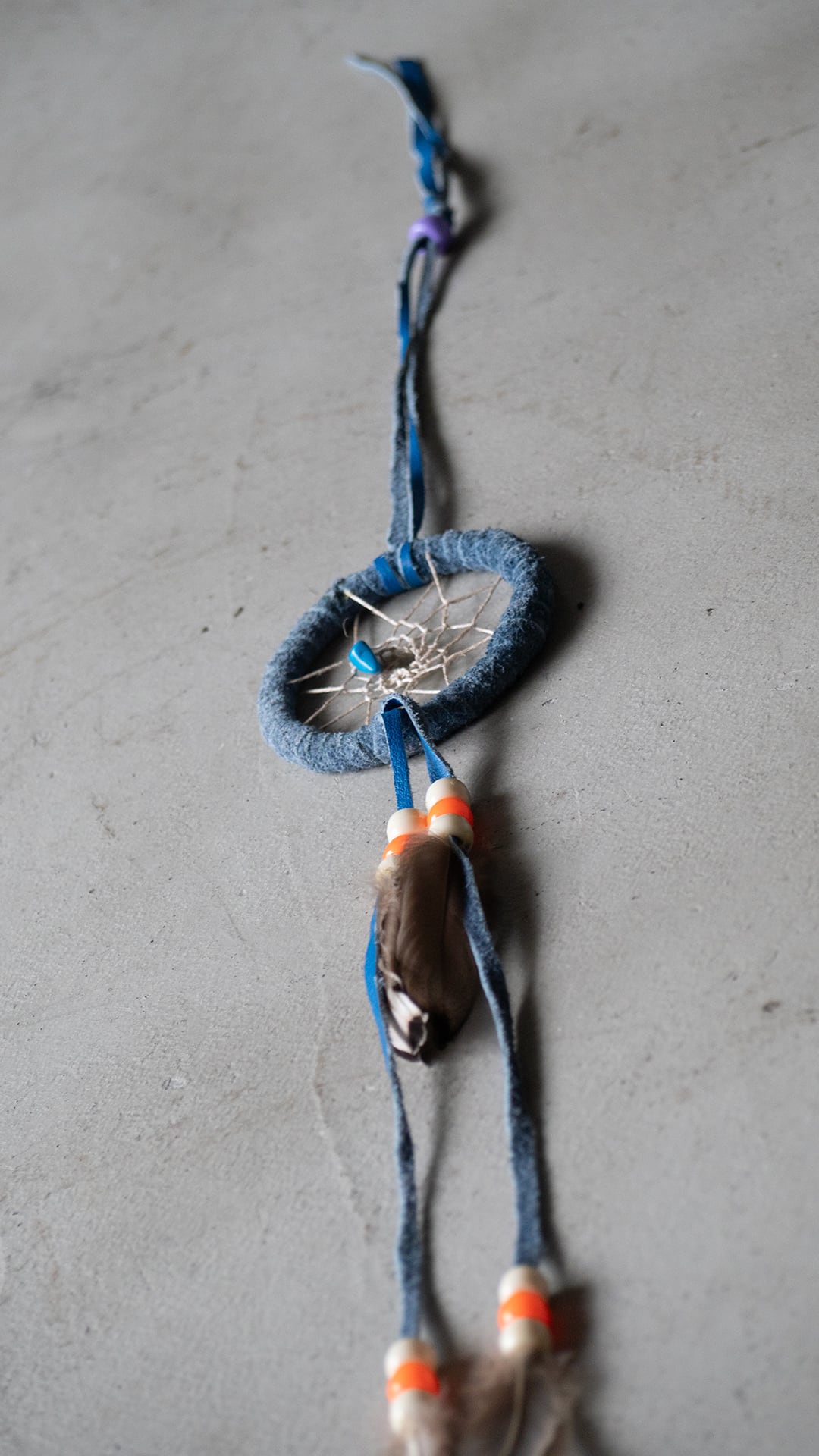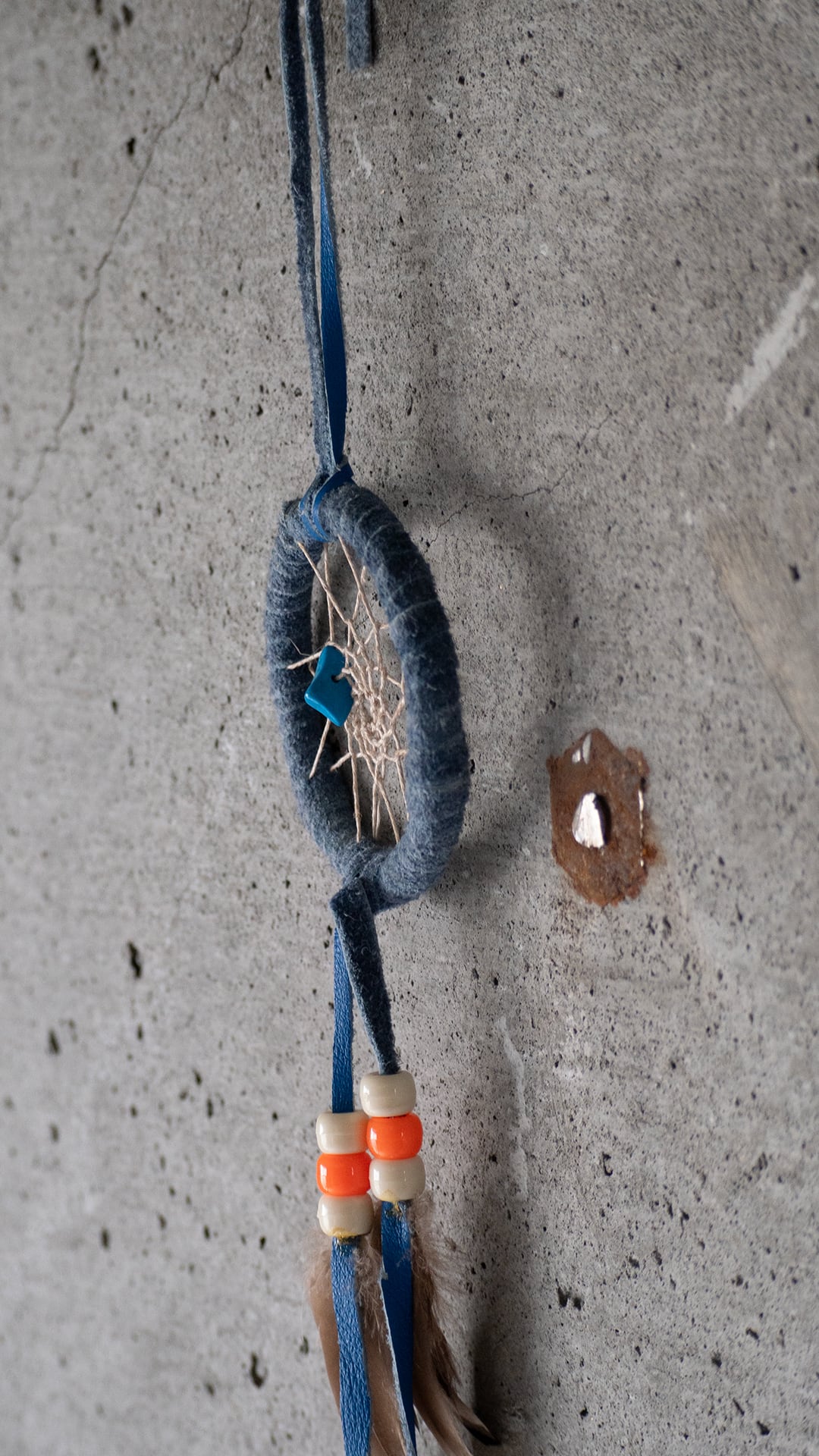 ブルーの天然皮革、羽、コットン糸、ビーズを用いてハンドメイドされた、ドリームキャッチャーです。
