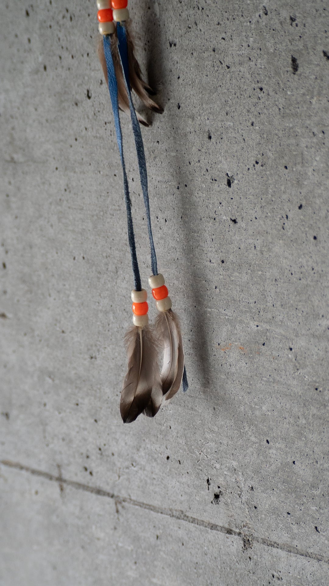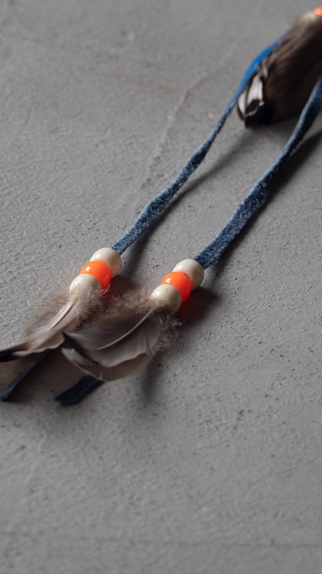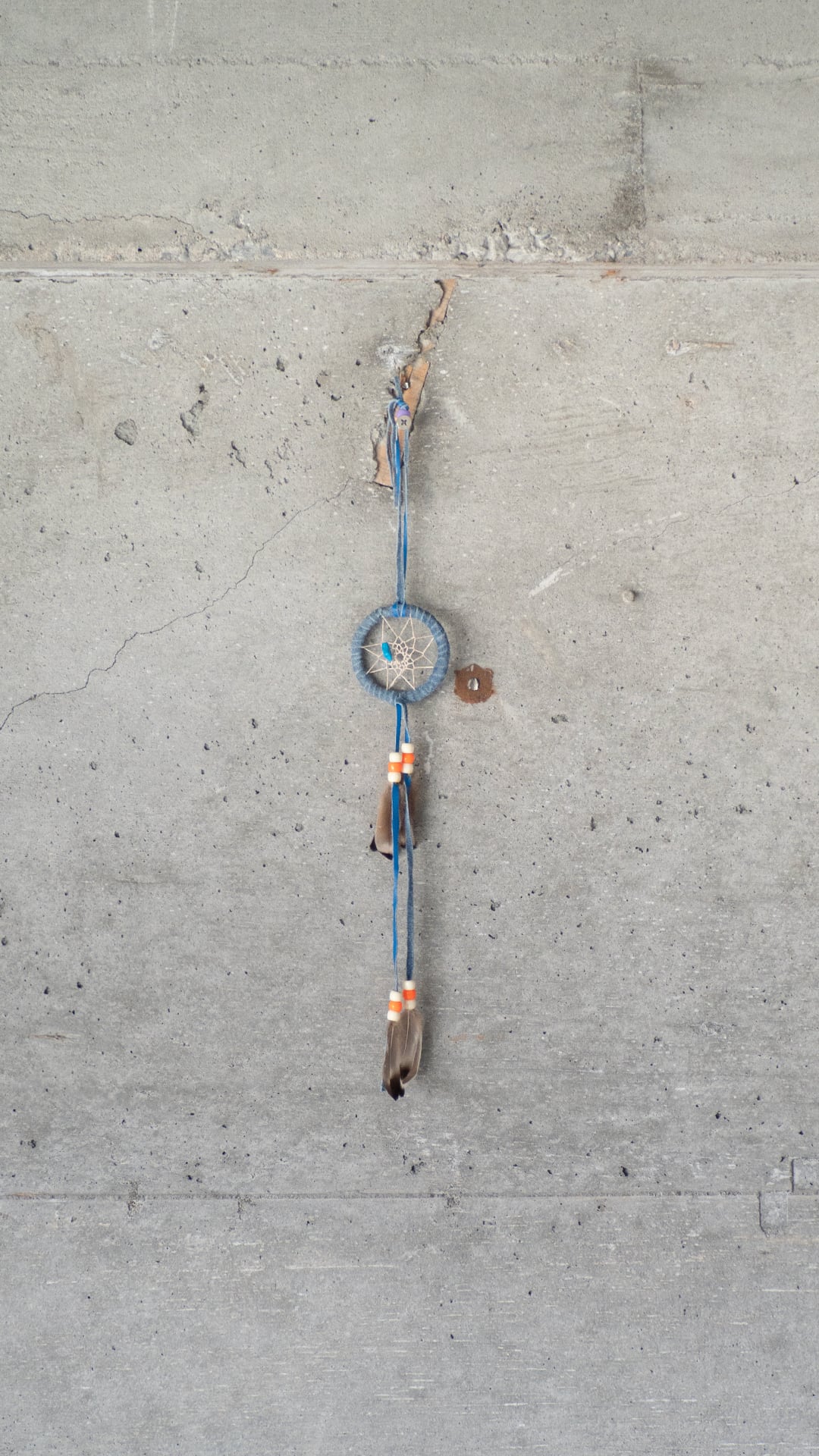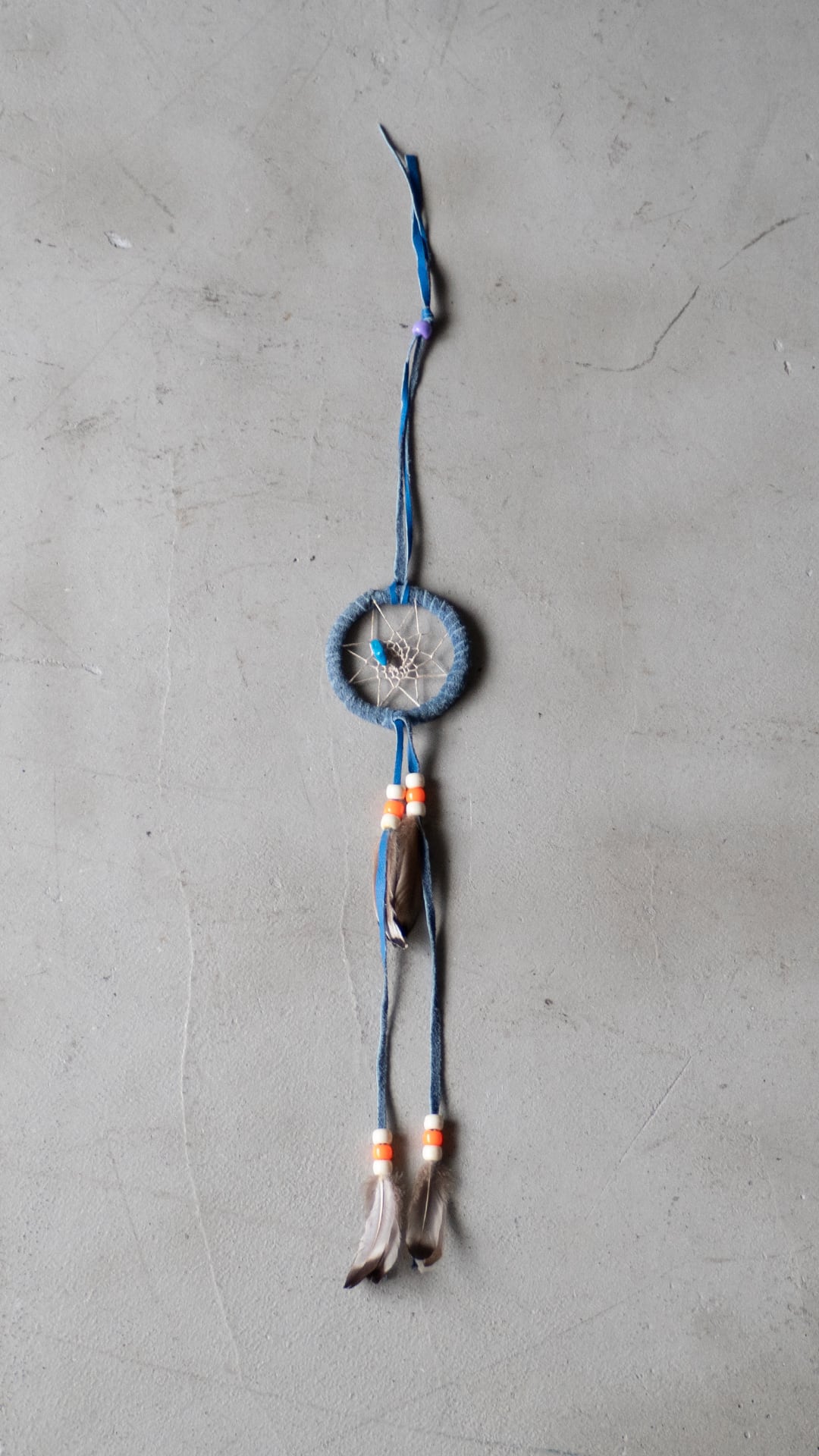 ブルーの天然皮革、羽、コットン糸、ビーズを用いてハンドメイドされた、ドリームキャッチャーです。