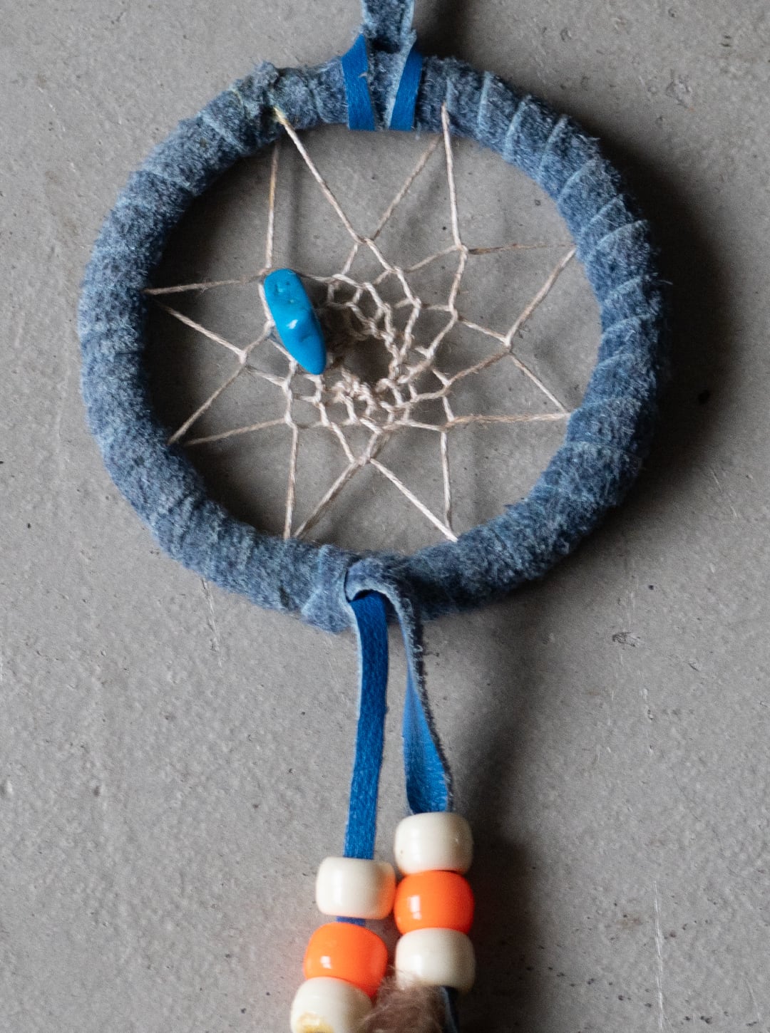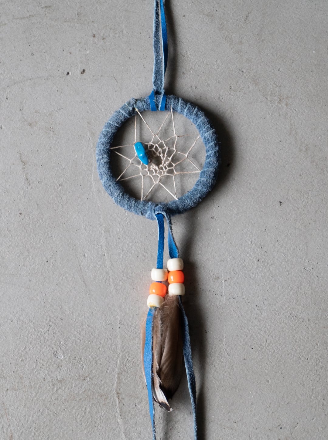 ドリームキャッチャー(Dreamcatcher)は、北米の先住民オジブワ族に伝わる伝統的なお守りで、子供を悪夢から守るために使われた装飾品です。柳の枝で作った輪に蜘蛛の巣状の紐を張り、羽やビーズを飾ったものが基本で、眠る際に枕元に吊るすことで、網が悪い夢を捕まえ、良い夢だけを下に通すと信じられているお守りのような役目を果たします。