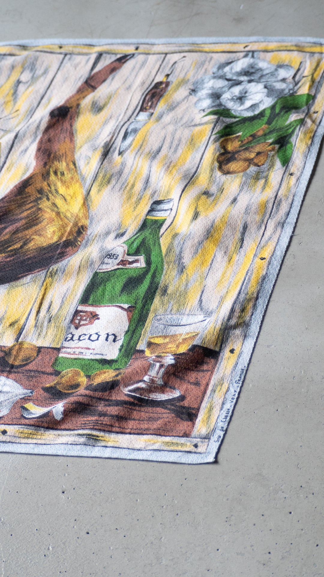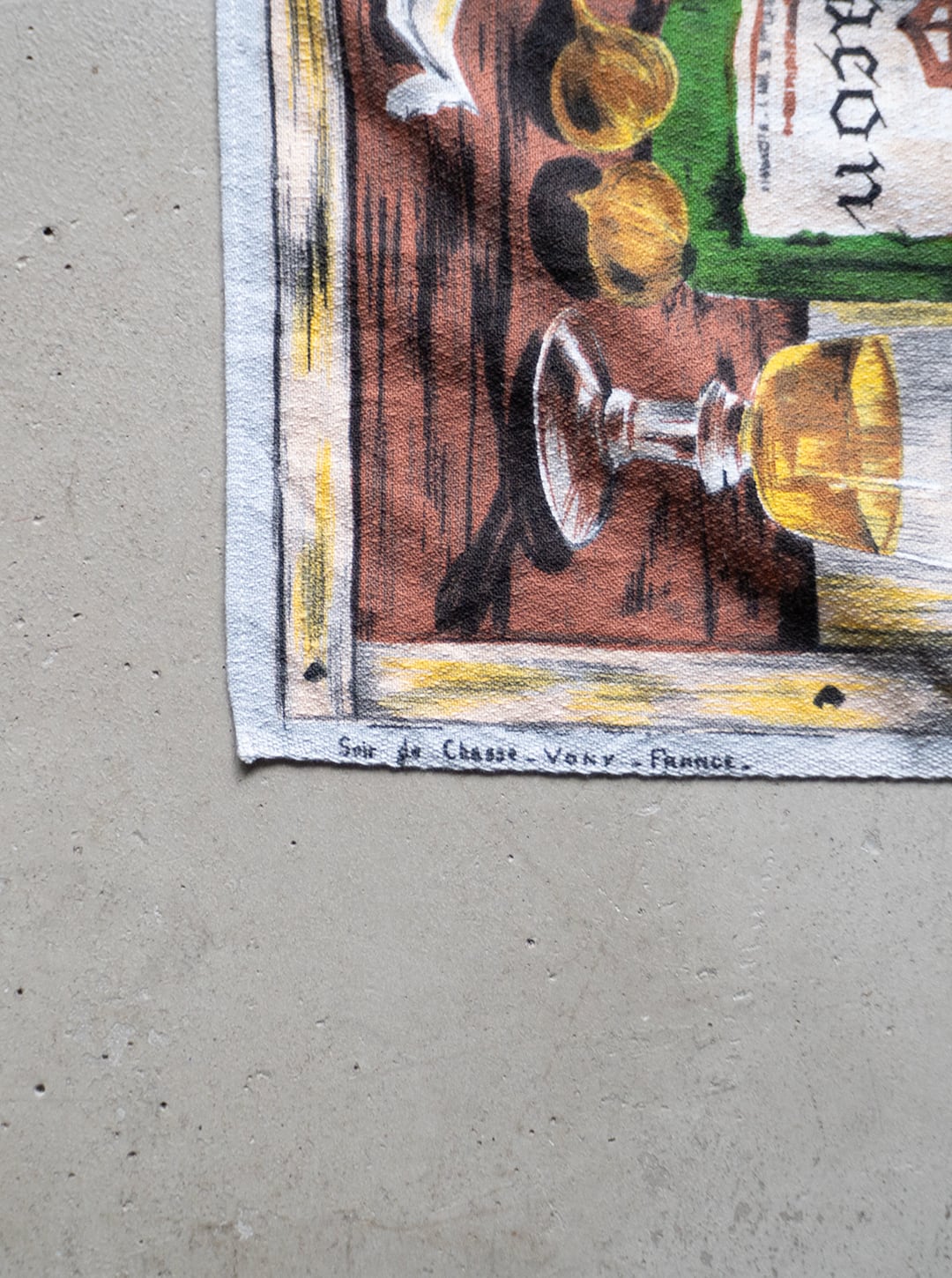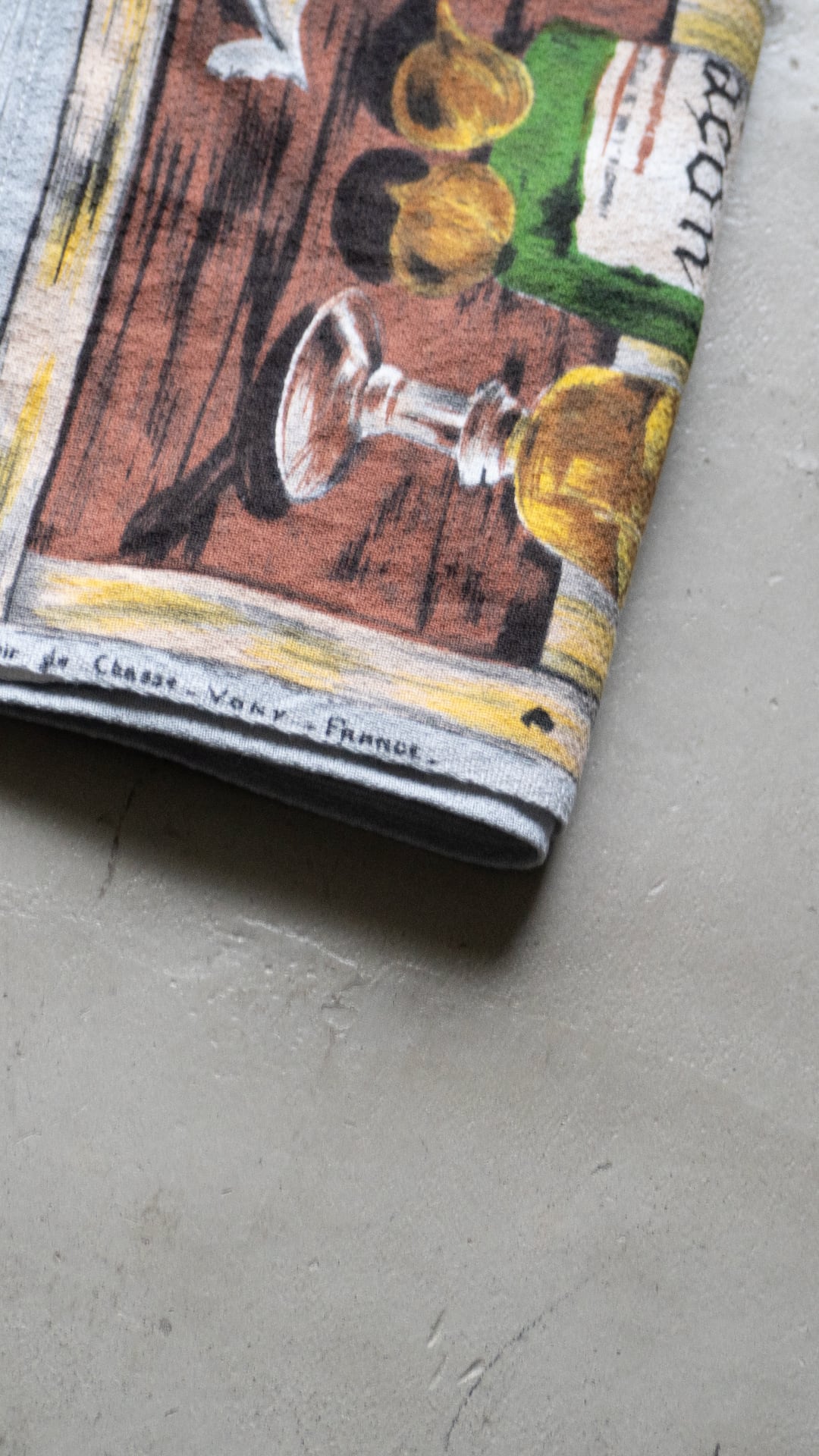 正確な年代は不明ですが、「VONY France」という1950年代〜70年代にかけて製造されていた、フランスのファブリック製品(キッチンタオル、テーブルクロス、タペストリーなど)のブランドのティータオルだと思われます。この個体は、表記は欠損していますがおそらくコットン素材で、キッチン周りのファブリックとして使われたものだと思います。