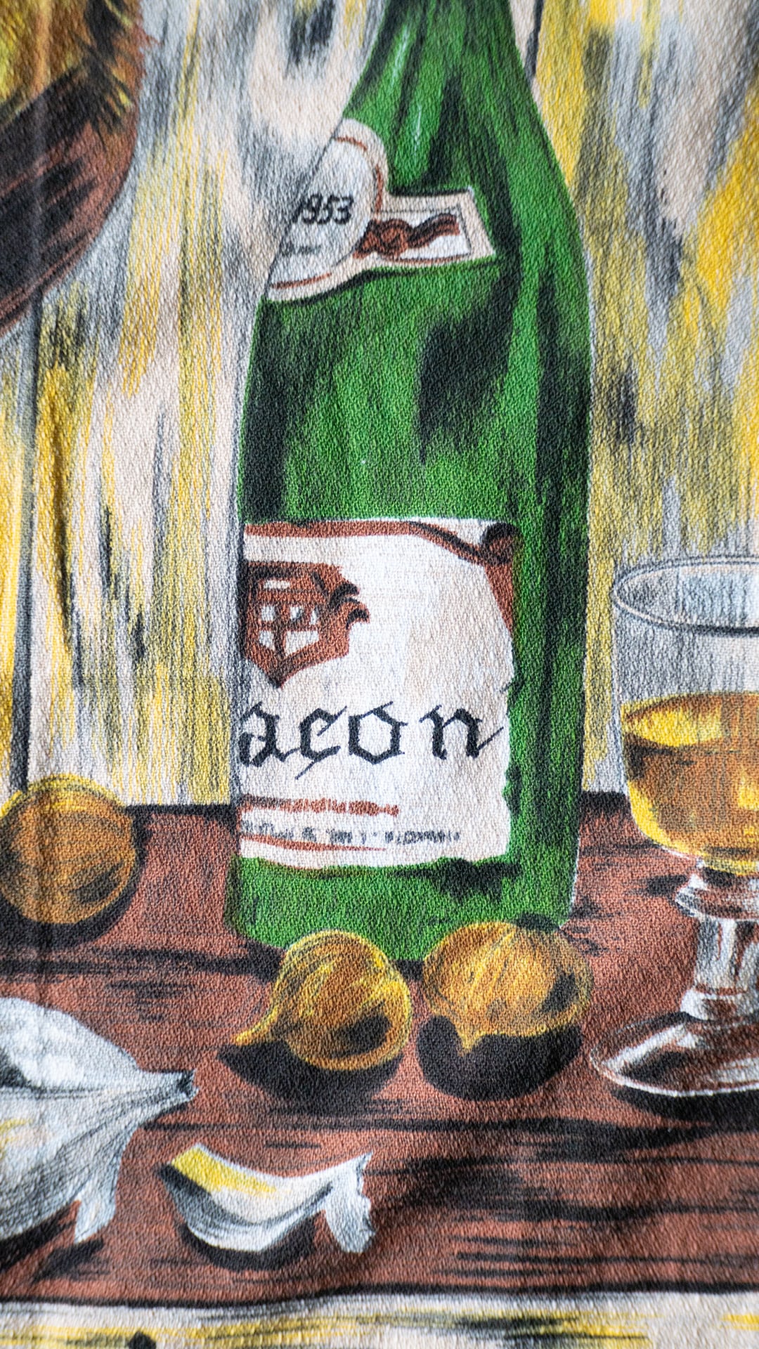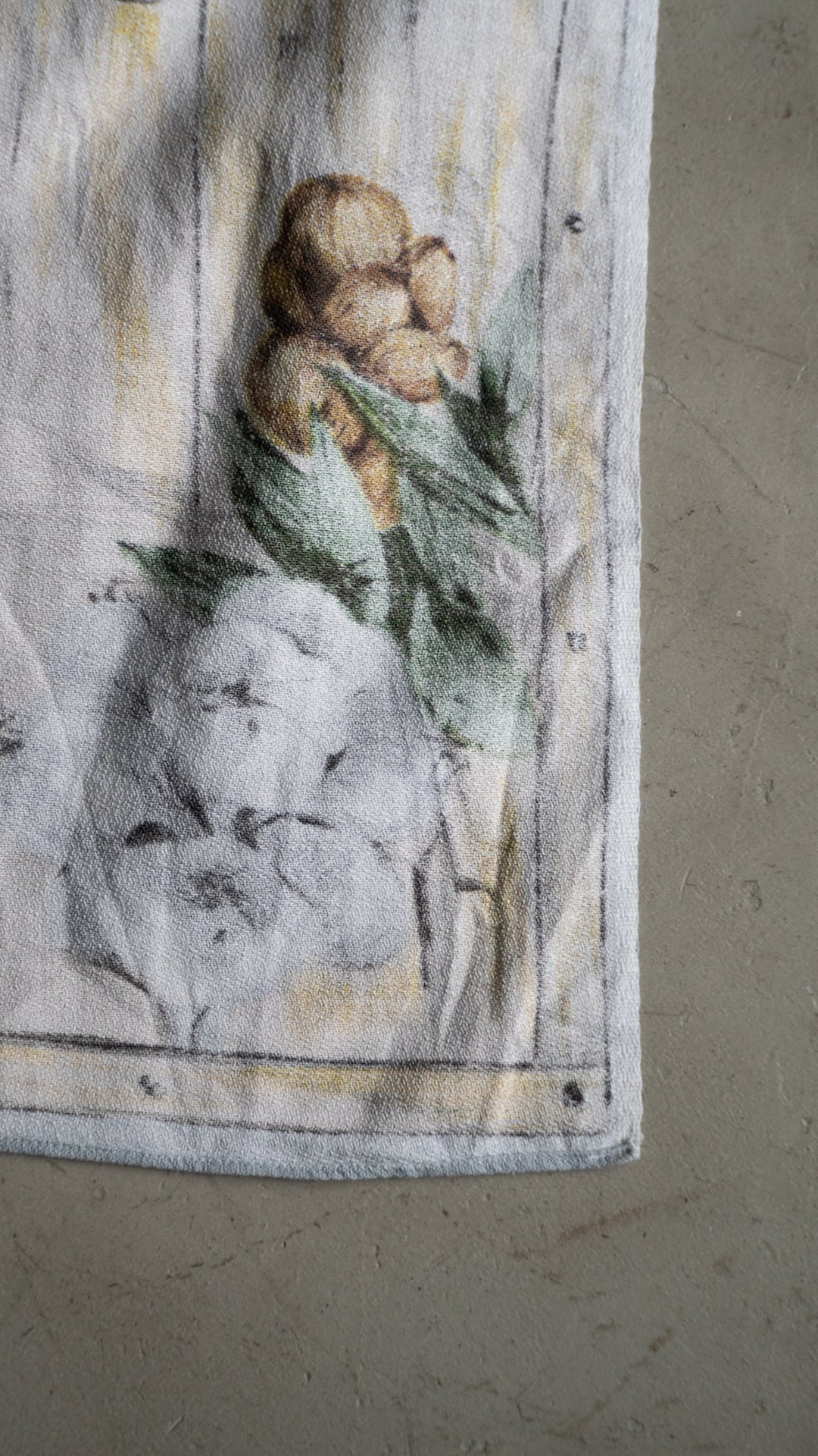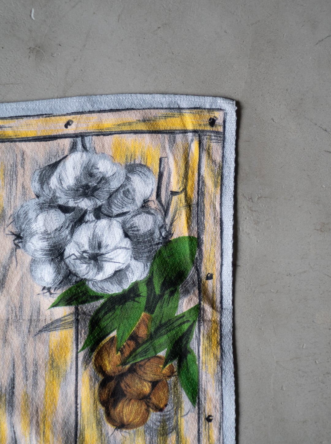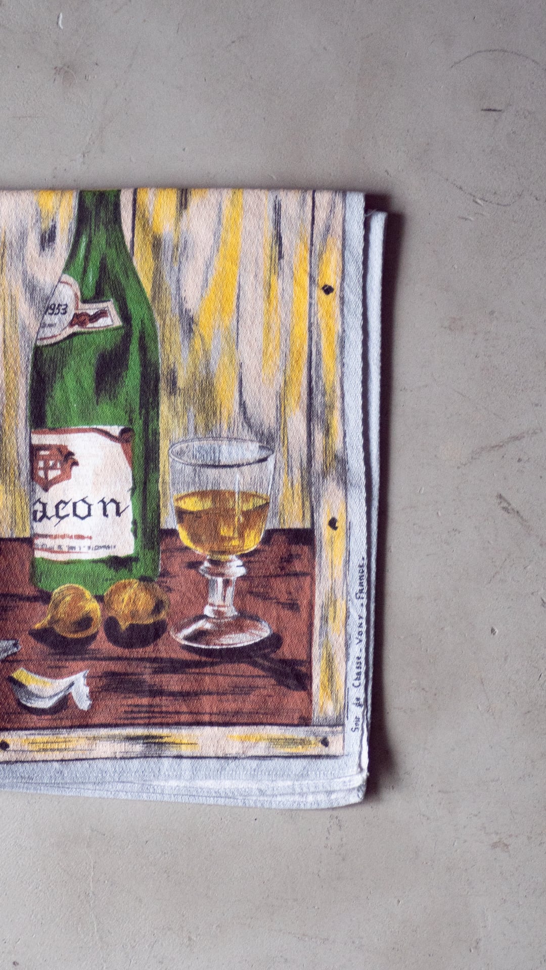 正確な年代は不明ですが、「VONY France」という1950年代〜70年代にかけて製造されていた、フランスのファブリック製品(キッチンタオル、テーブルクロス、タペストリーなど)のブランドのティータオルだと思われます。この個体は、表記は欠損していますがおそらくコットン素材で、キッチン周りのファブリックとして使われたものだと思います。