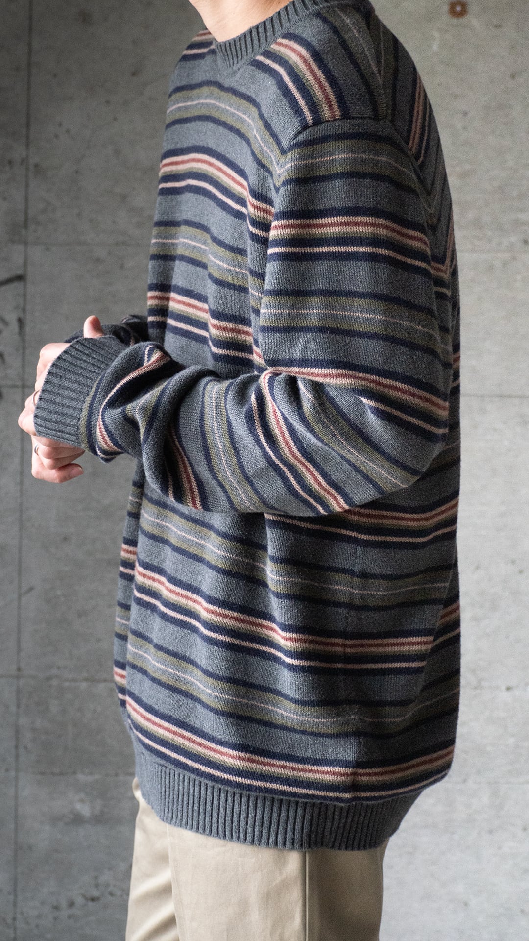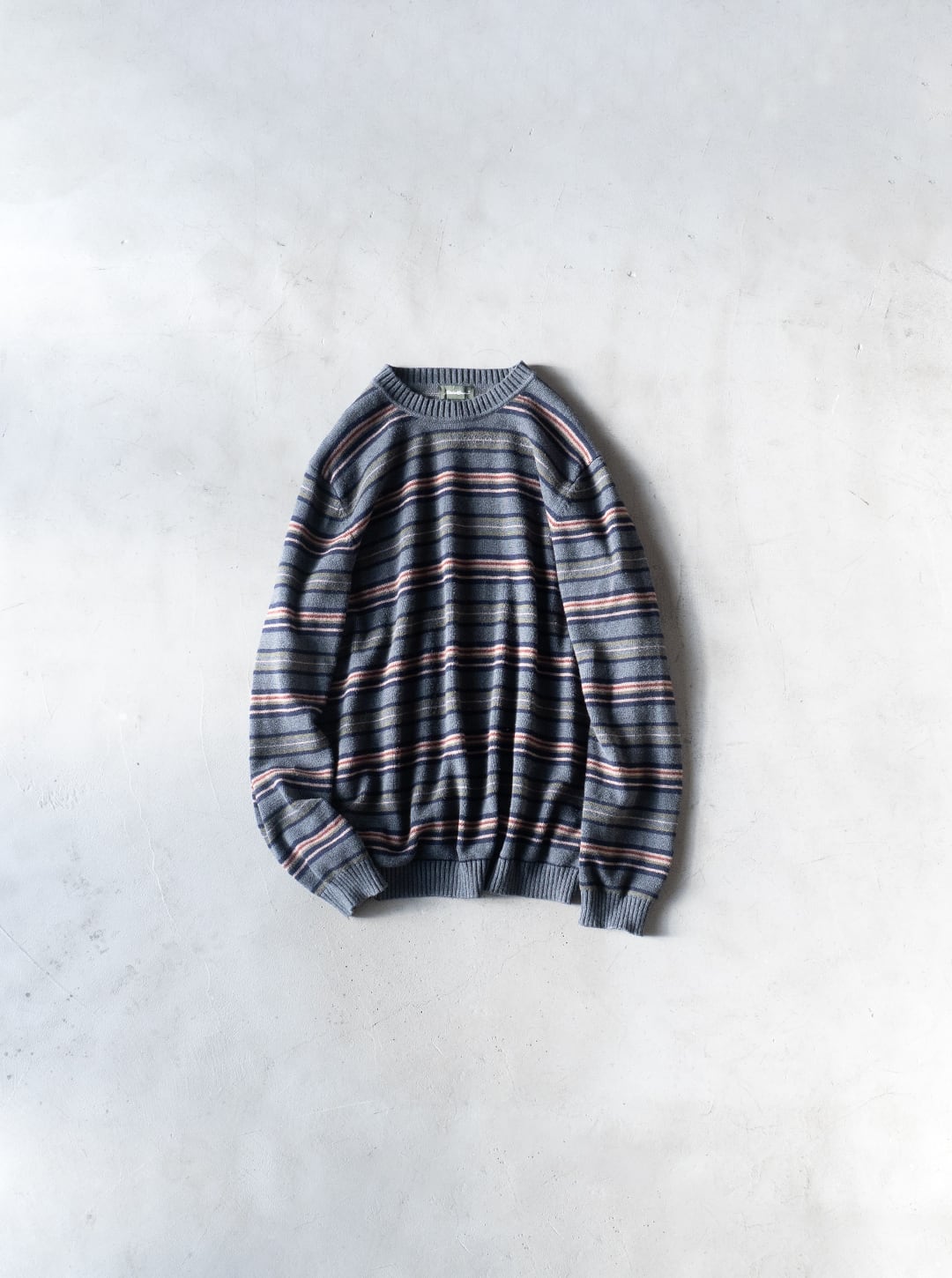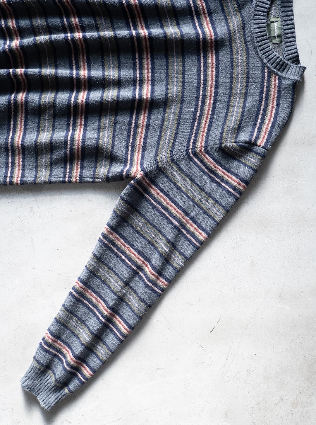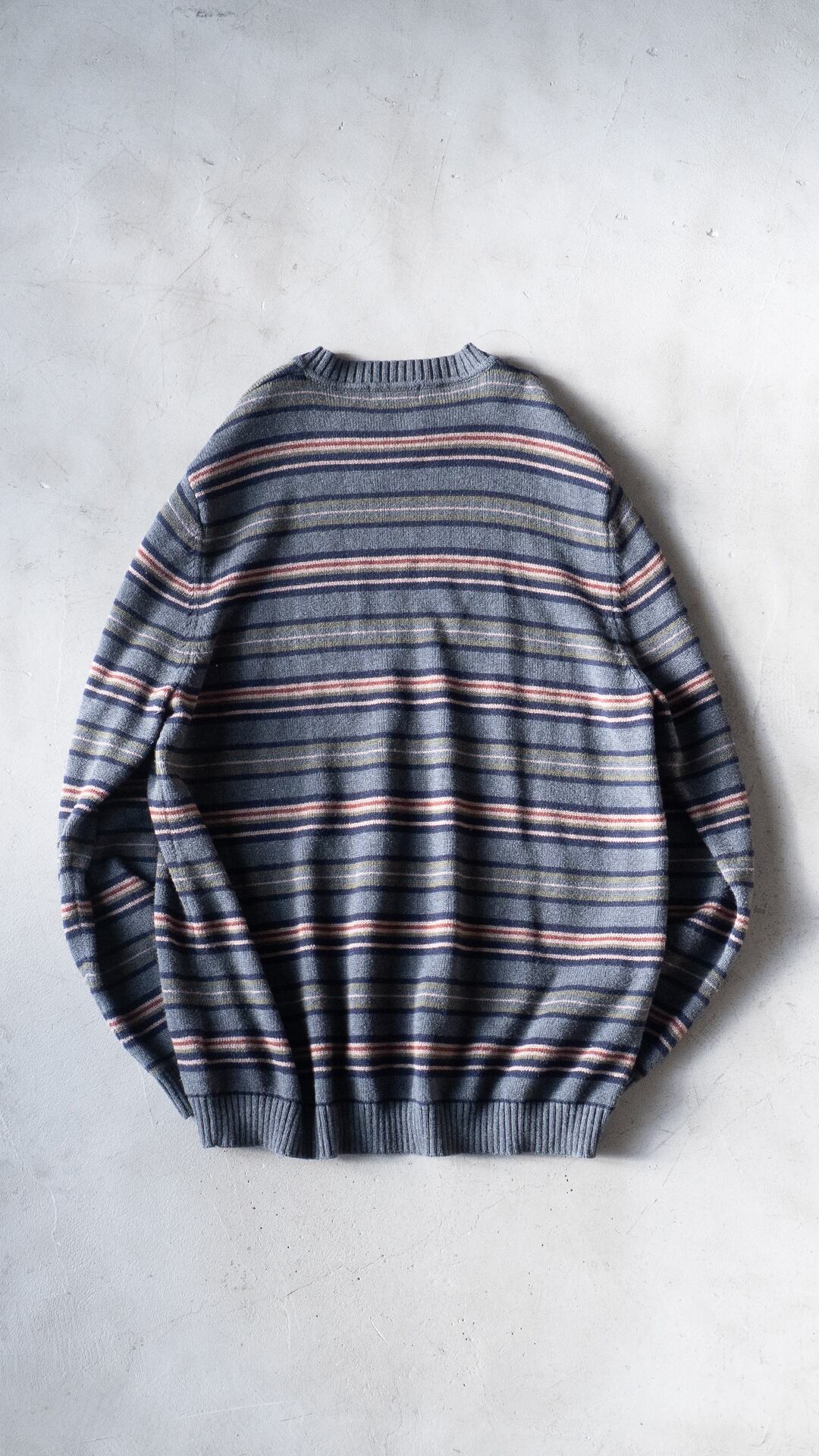 コットンニットは、細番手ハイゲージの方がどちらかと言えば多いので、厚手で重みもあるこの手のニットはマイナーだと思います。それでいて、野暮ったい配色のマルチボーダーでしたのでセラストア店主好みの即ピックの一着です。