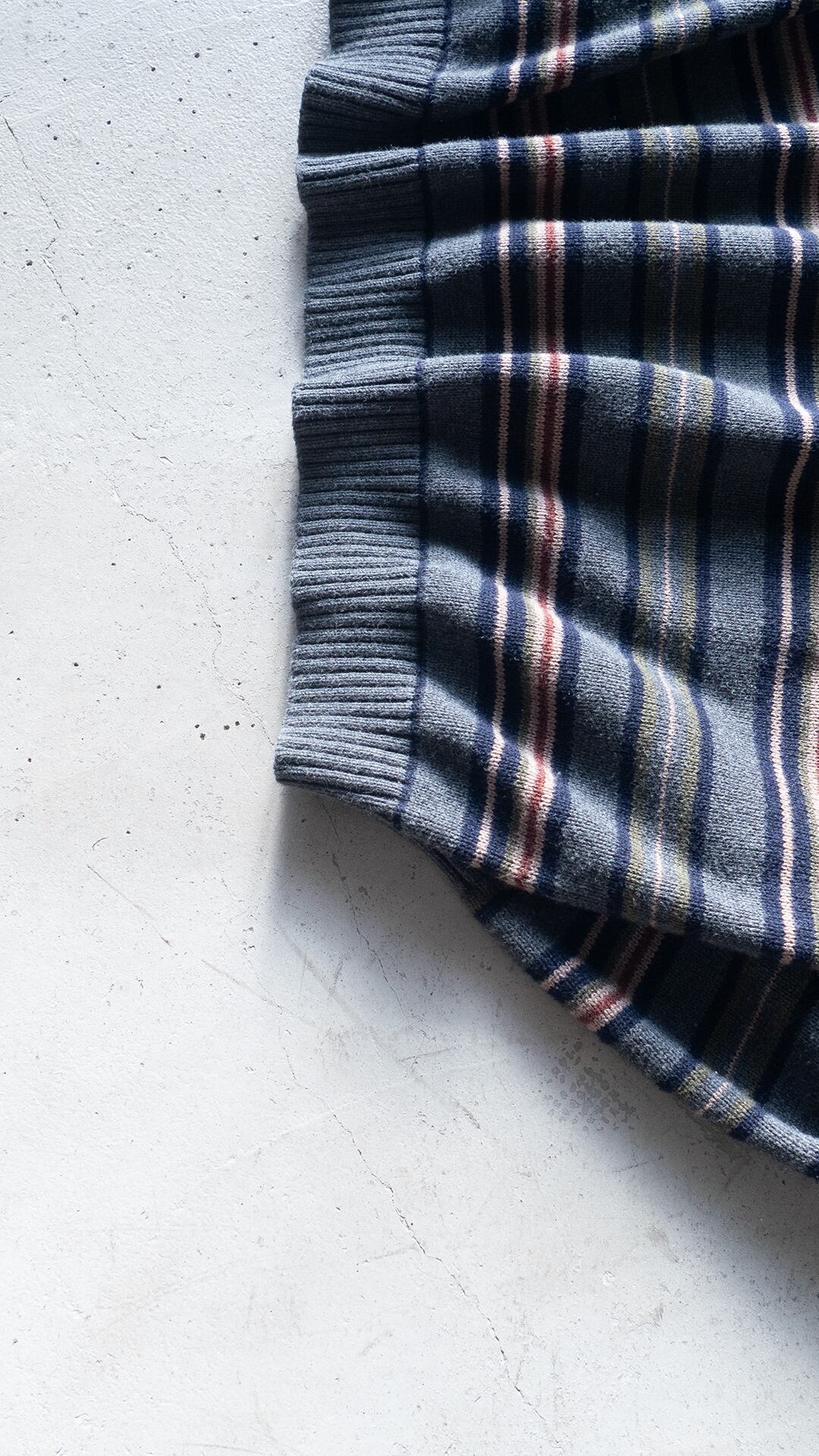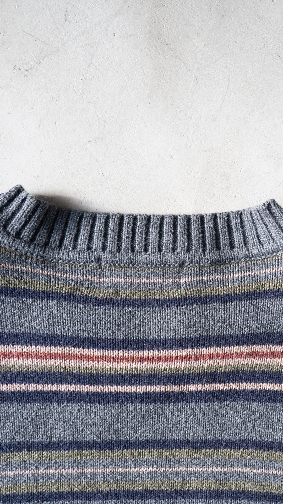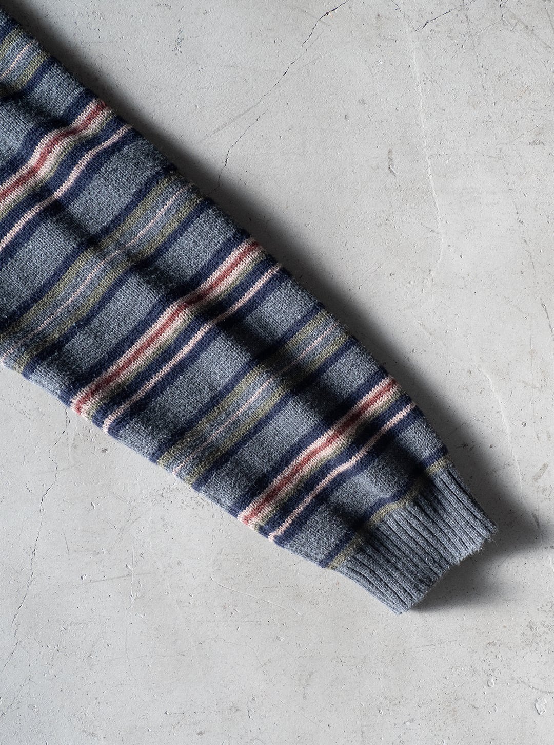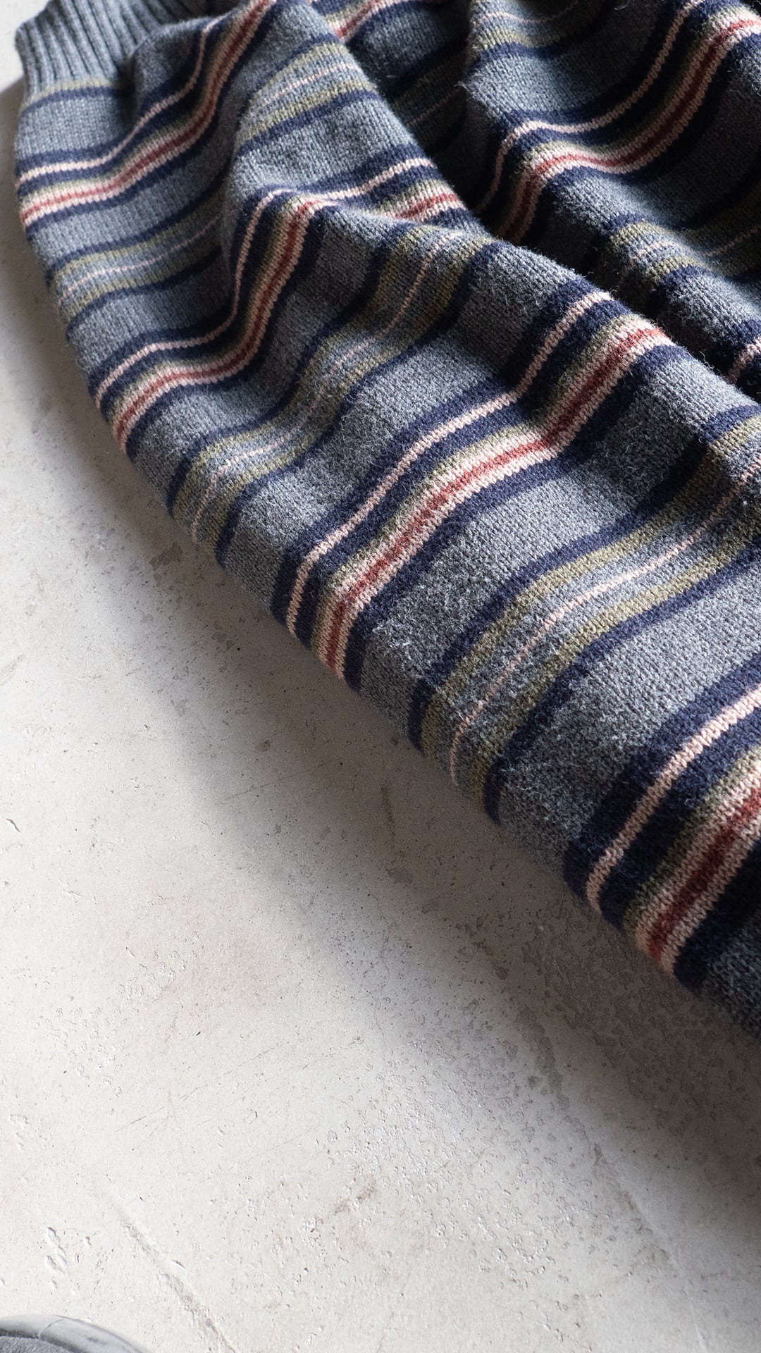 コットンニットは、細番手ハイゲージの方がどちらかと言えば多いので、厚手で重みもあるこの手のニットはマイナーだと思います。それでいて、野暮ったい配色のマルチボーダーでしたのでセラストア店主好みの即ピックの一着です。