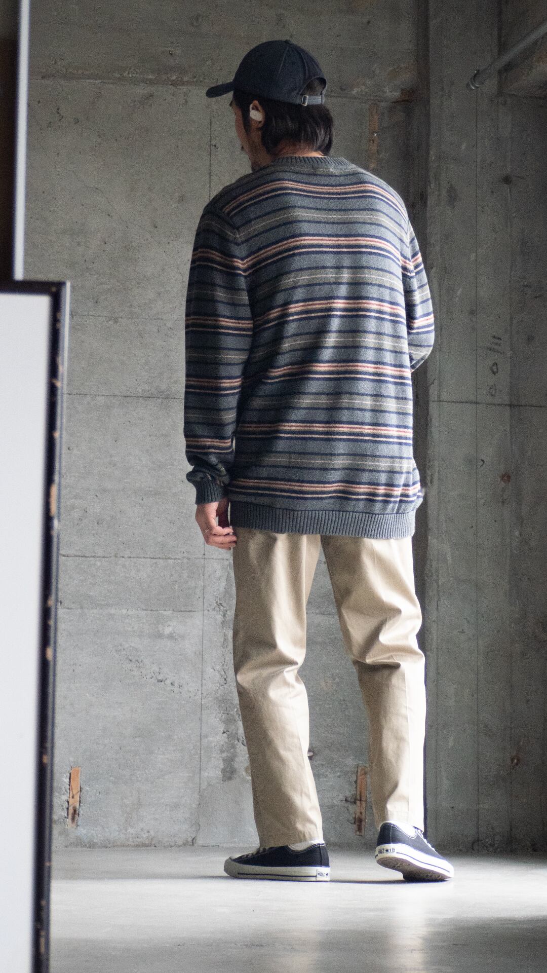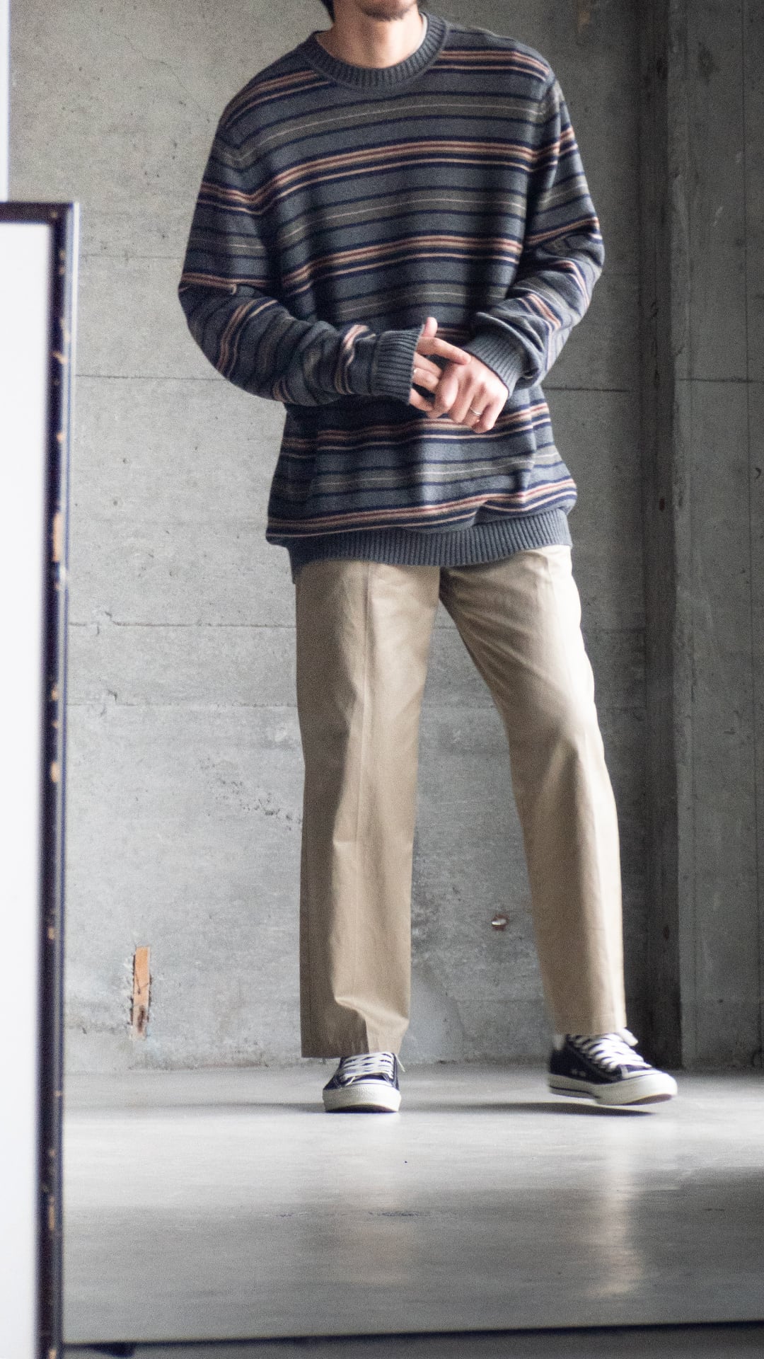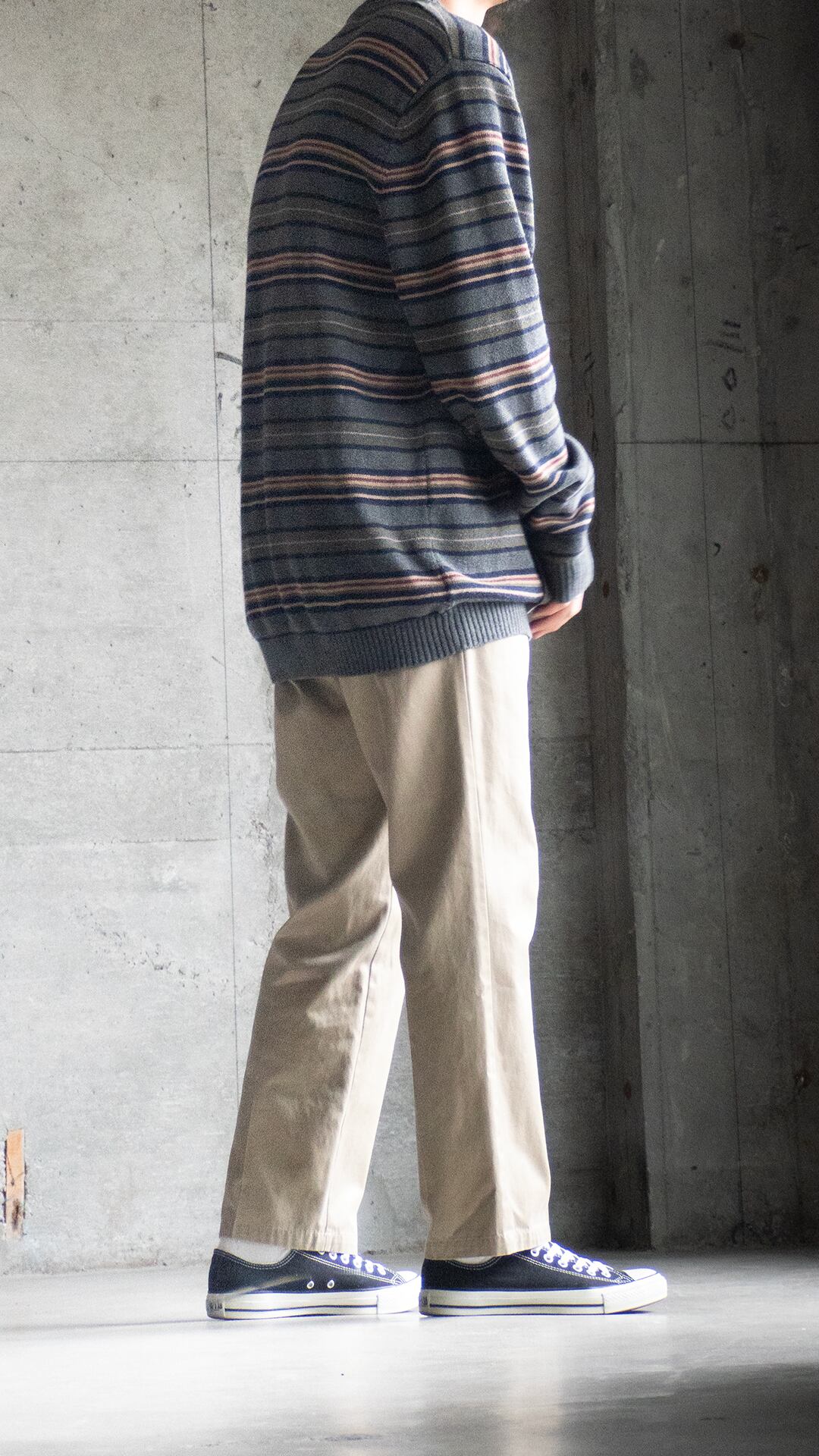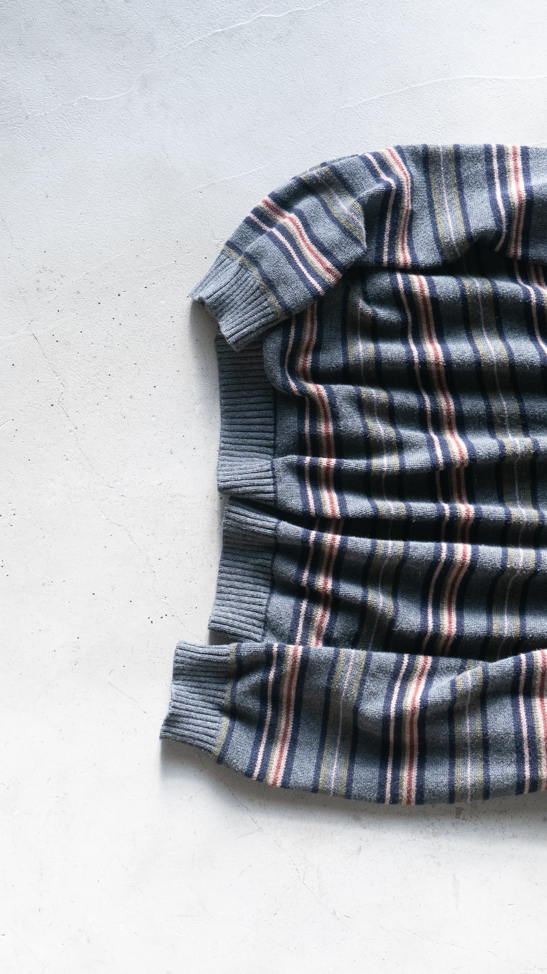 コットンニットは、細番手ハイゲージの方がどちらかと言えば多いので、厚手で重みもあるこの手のニットはマイナーだと思います。それでいて、野暮ったい配色のマルチボーダーでしたのでセラストア店主好みの即ピックの一着です。