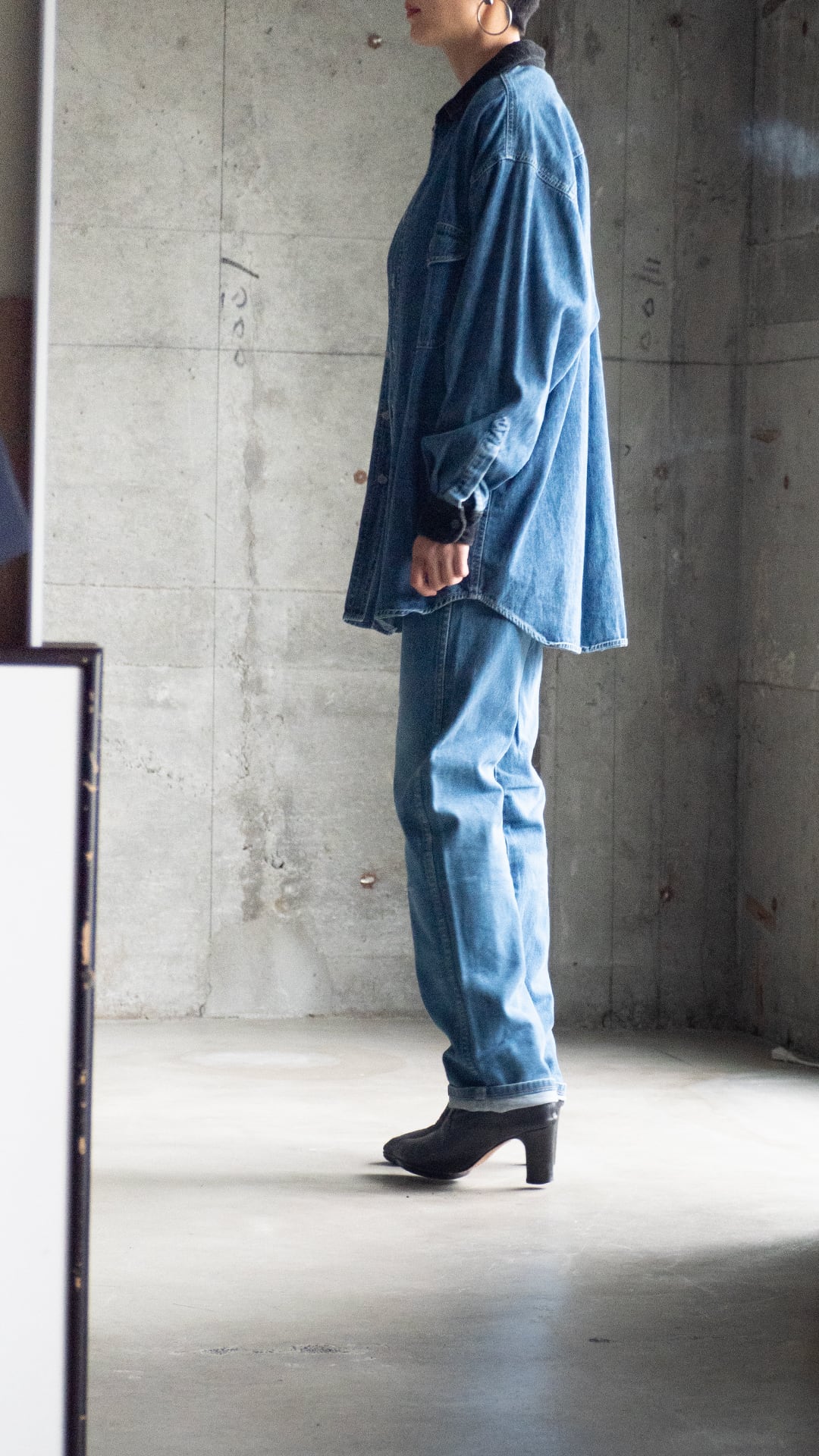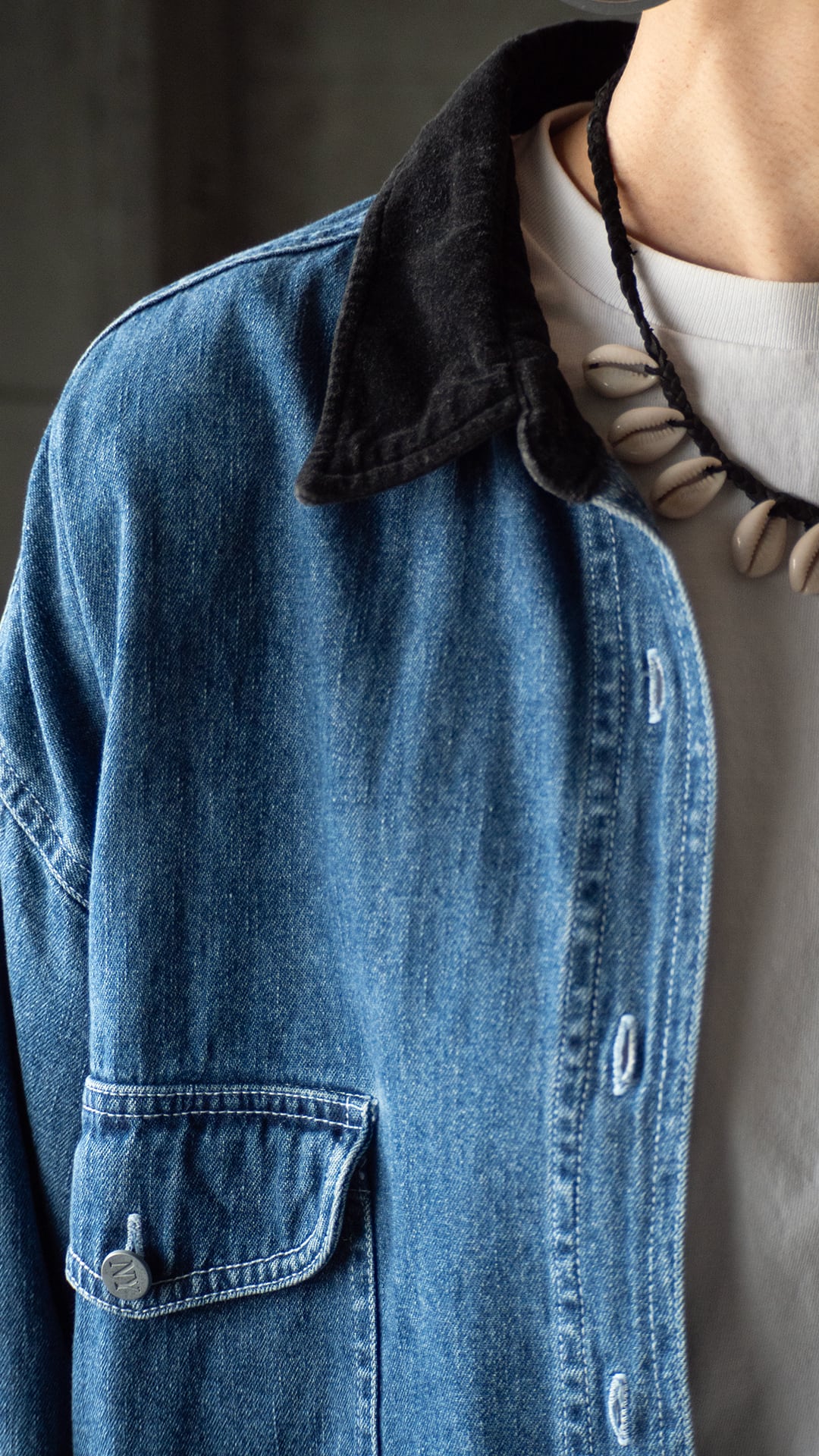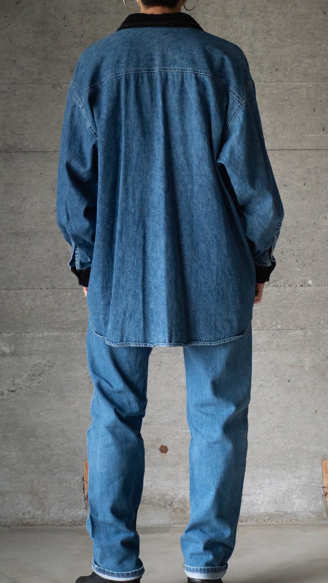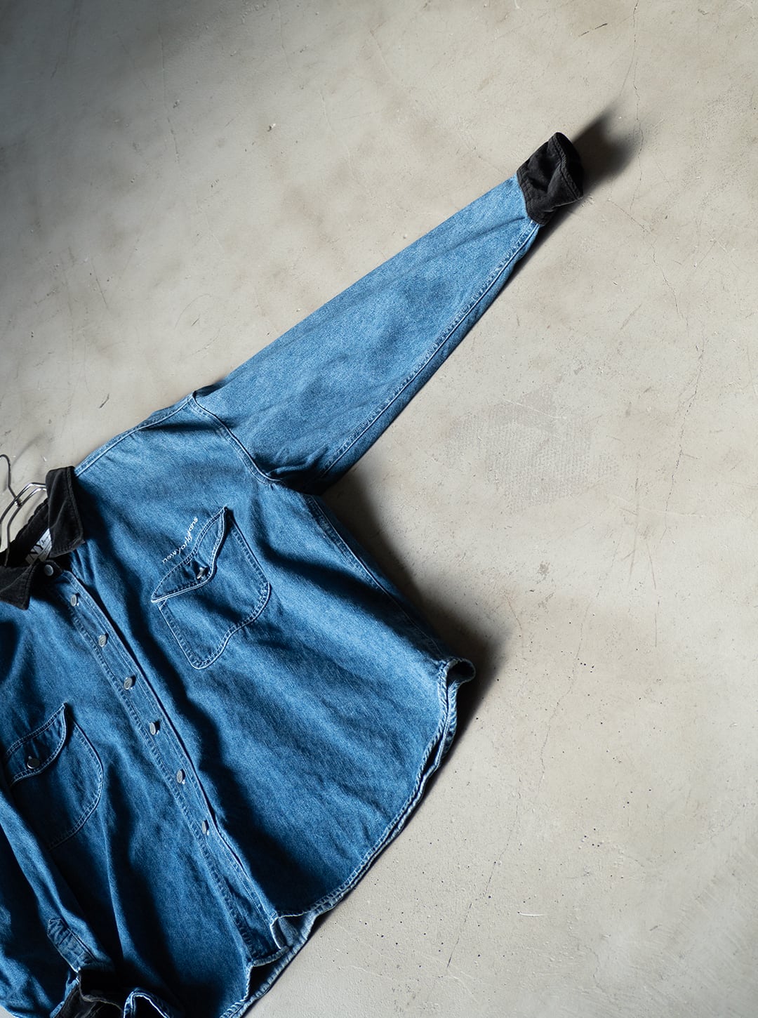 衿とカフスを黒いベルベットで切り替えた、ルーズフィットなデニムシャツです。