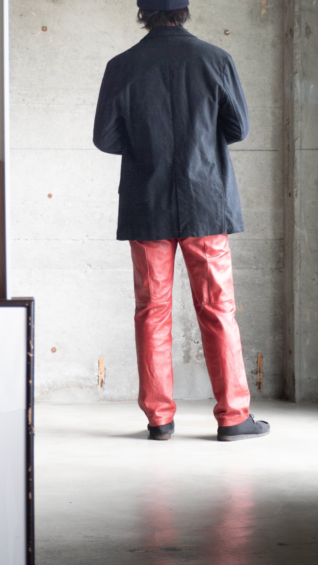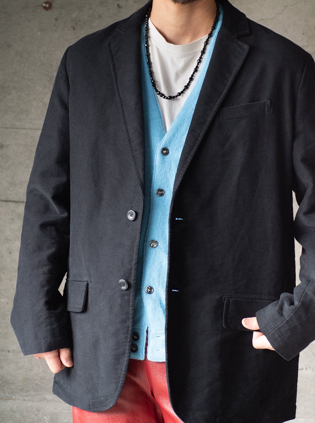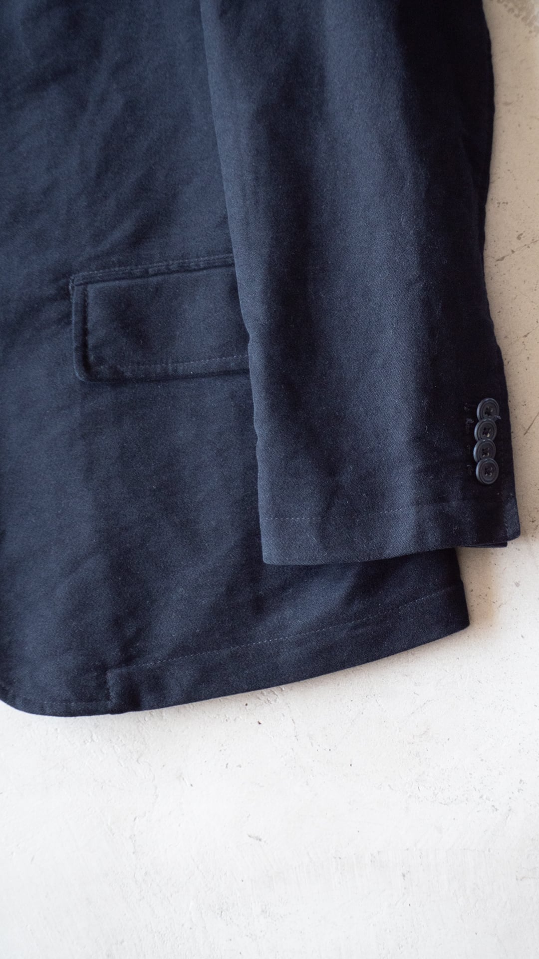 ノッチドラペルでゴージは普通程度の高さ、合わせ深めの2つボタン。ウエストダーツと両玉縁フラップポケットが配備され、それらのステッチとその周りの生地の凹凸が程良いアクセントを感じさせてくれます。セラストアとしての好みのジャケット。モールスキンで黒、セミアンコンであれば、レトロカラーのスポーツウェアともばっちり組み合わせができます。