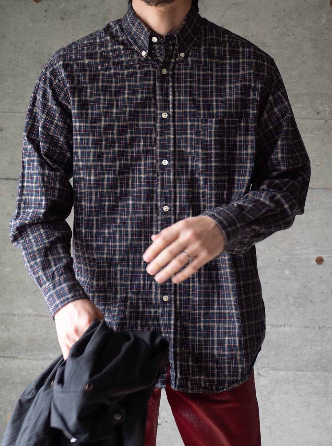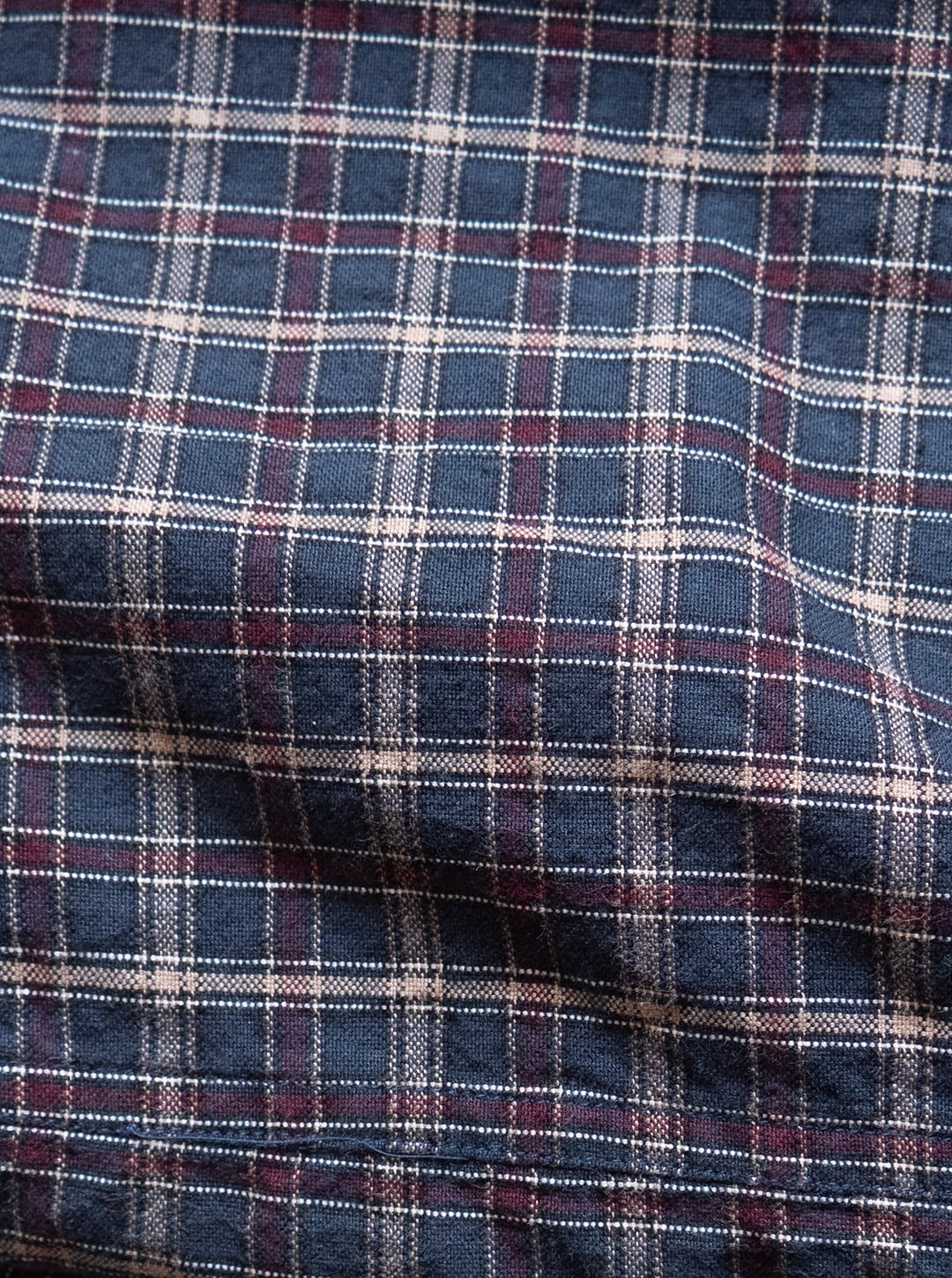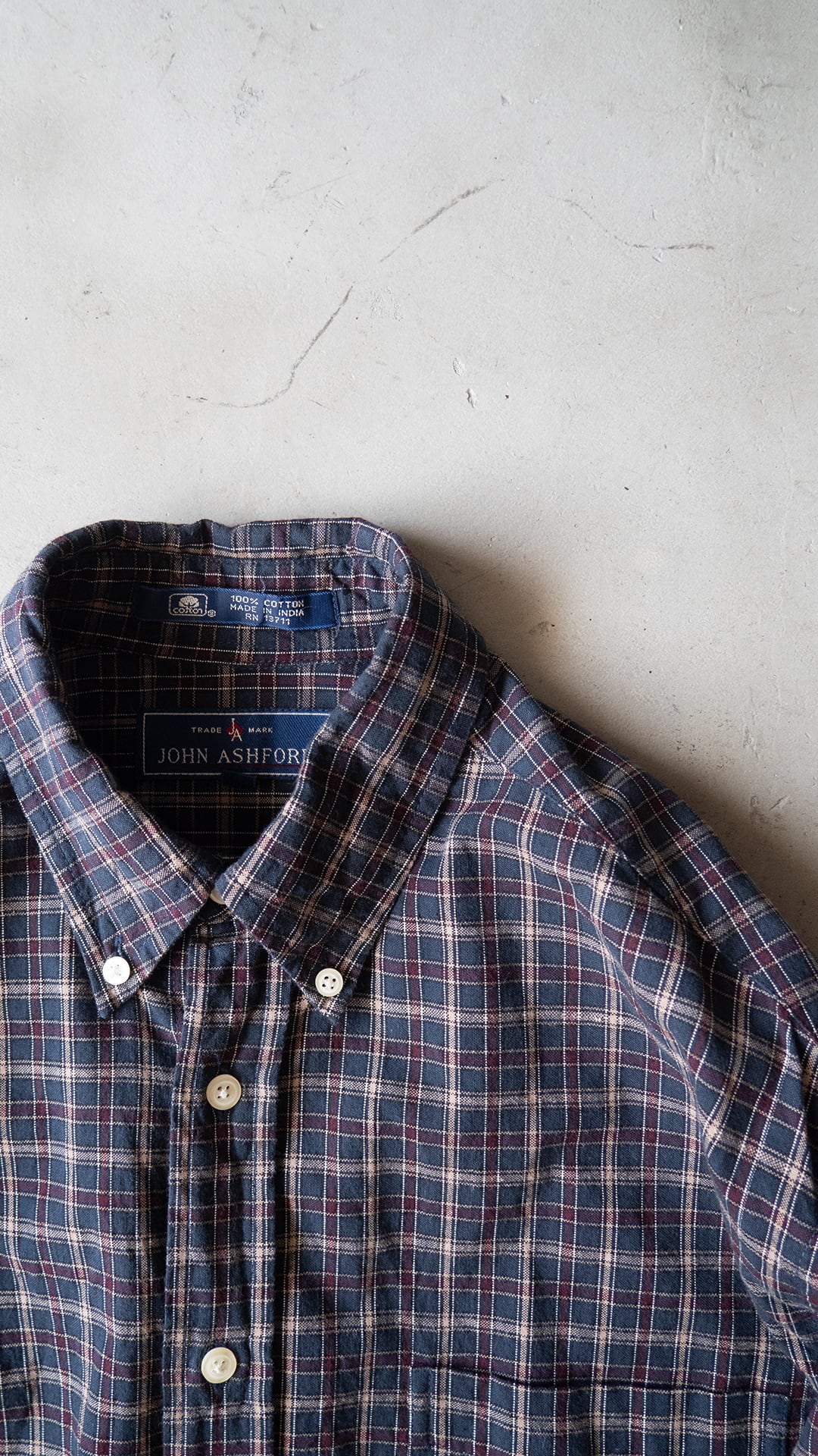 先染めのインドコットンのチェック柄、中細番手の平織りで糸の柔らかい風合いがしっかりと残った、オーソドックスなボタンダウンシャツです。ブランドは「JOHN ASHFORD(ジョンアシュフォード)」で、アメリカの老舗百貨店グループであったMay Department Stores、後のメイシーズのプライベートブランドとしてスタートして、1980年代後半から90年代にかけてはアメリカの百貨店市場で広く認知されていました。