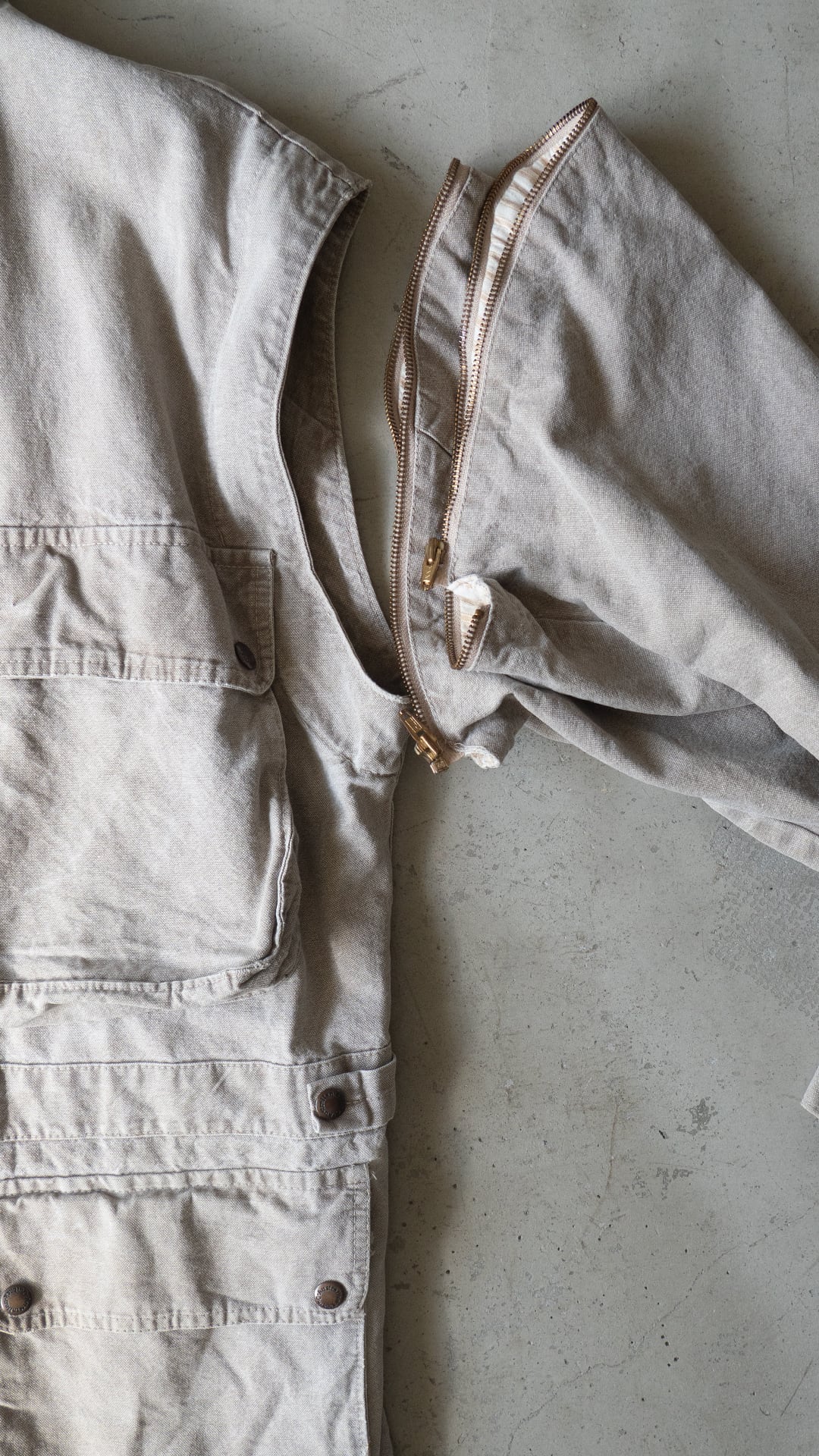 身頃は立体マチが付いた4つのフラップポケット(腰ポケットは外脇側からスラッシュポケットが配備)と、腹部までのショートジッパーと比翼閉じの前合わせが特徴的です。加えて、袖がアームホールから取り外しが可能です。金属ファスナーでスライダーの調子も良く、見栄えの良いジッパーが採用されています。