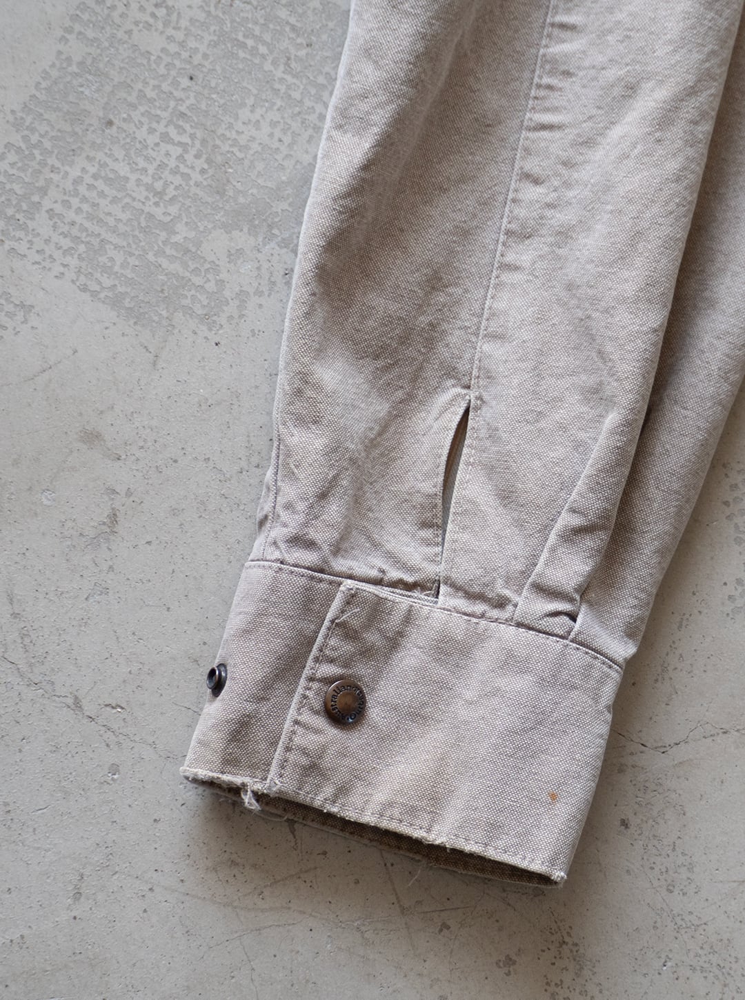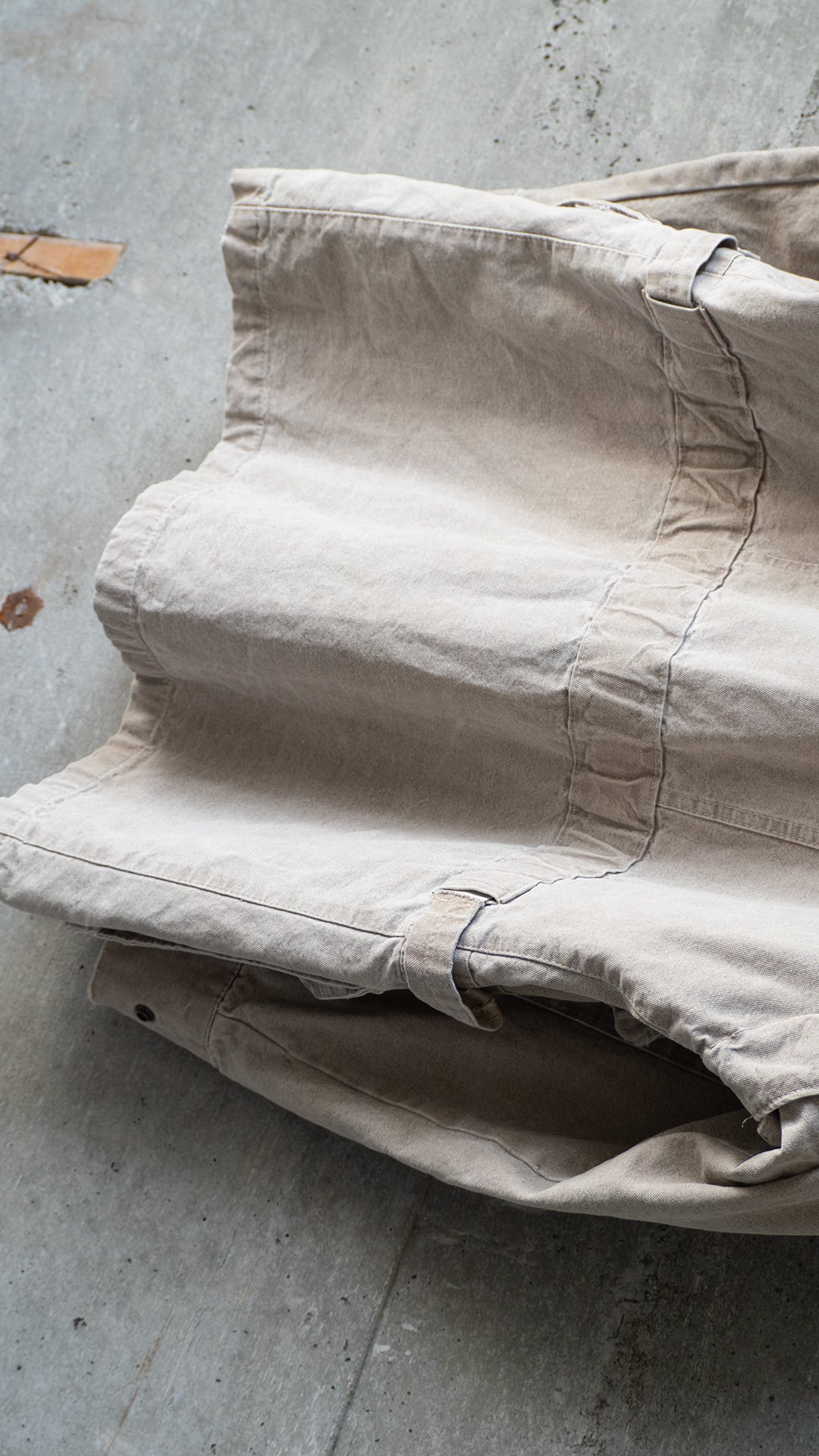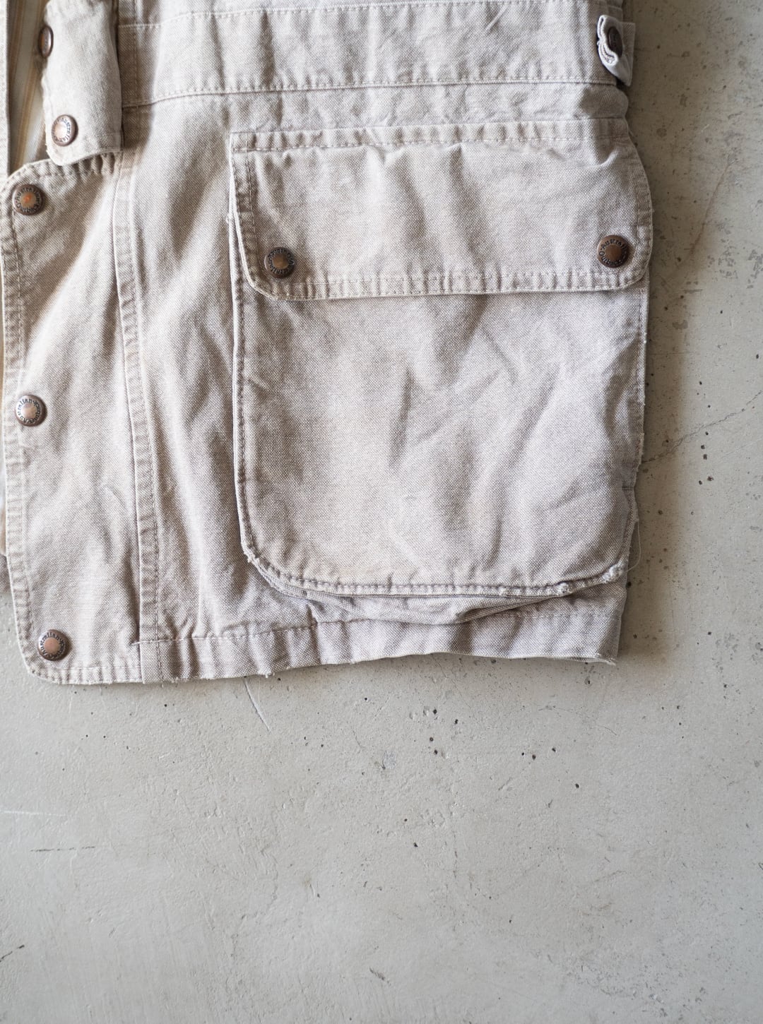それ以外にも表地にダメージが複数ございますが、いずれも色落ちがダック生地に相まって、魅力的な味、エイジングと判断しましたのでそのままにしております。
