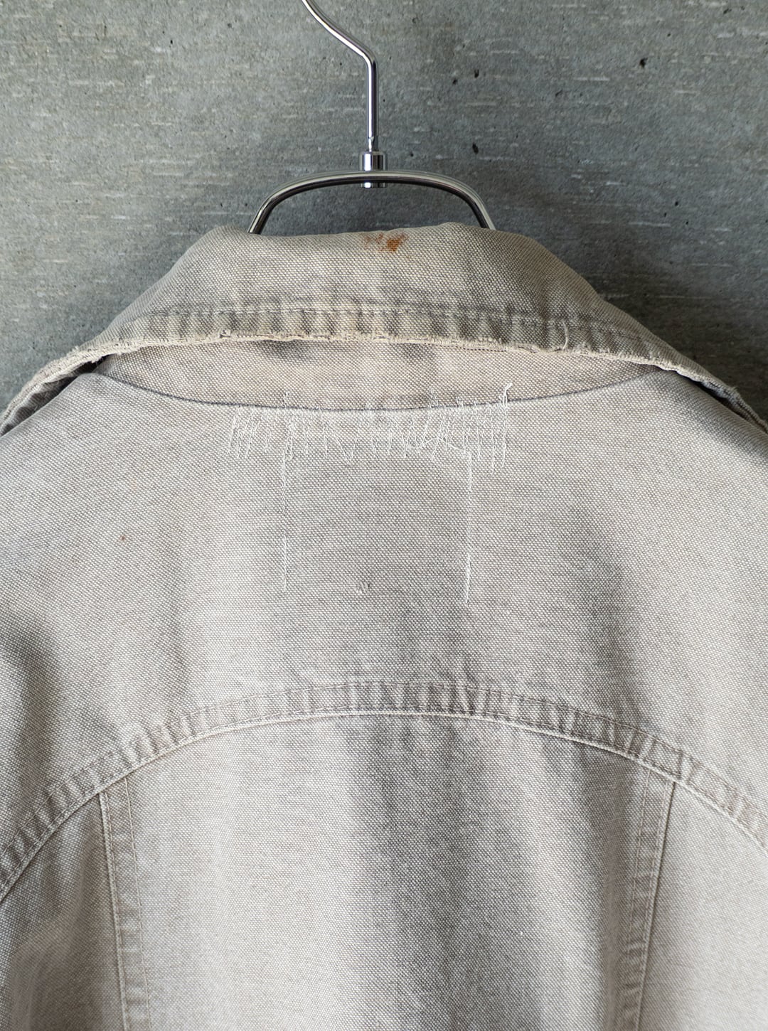 首裏の裏地部分に破れがあり、その中央付近のみステッチで叩き修繕をしております(写真19枚目掲載)。衿の後ろ側生地に複数のかぶれ箇所、汚れ箇所がございます。