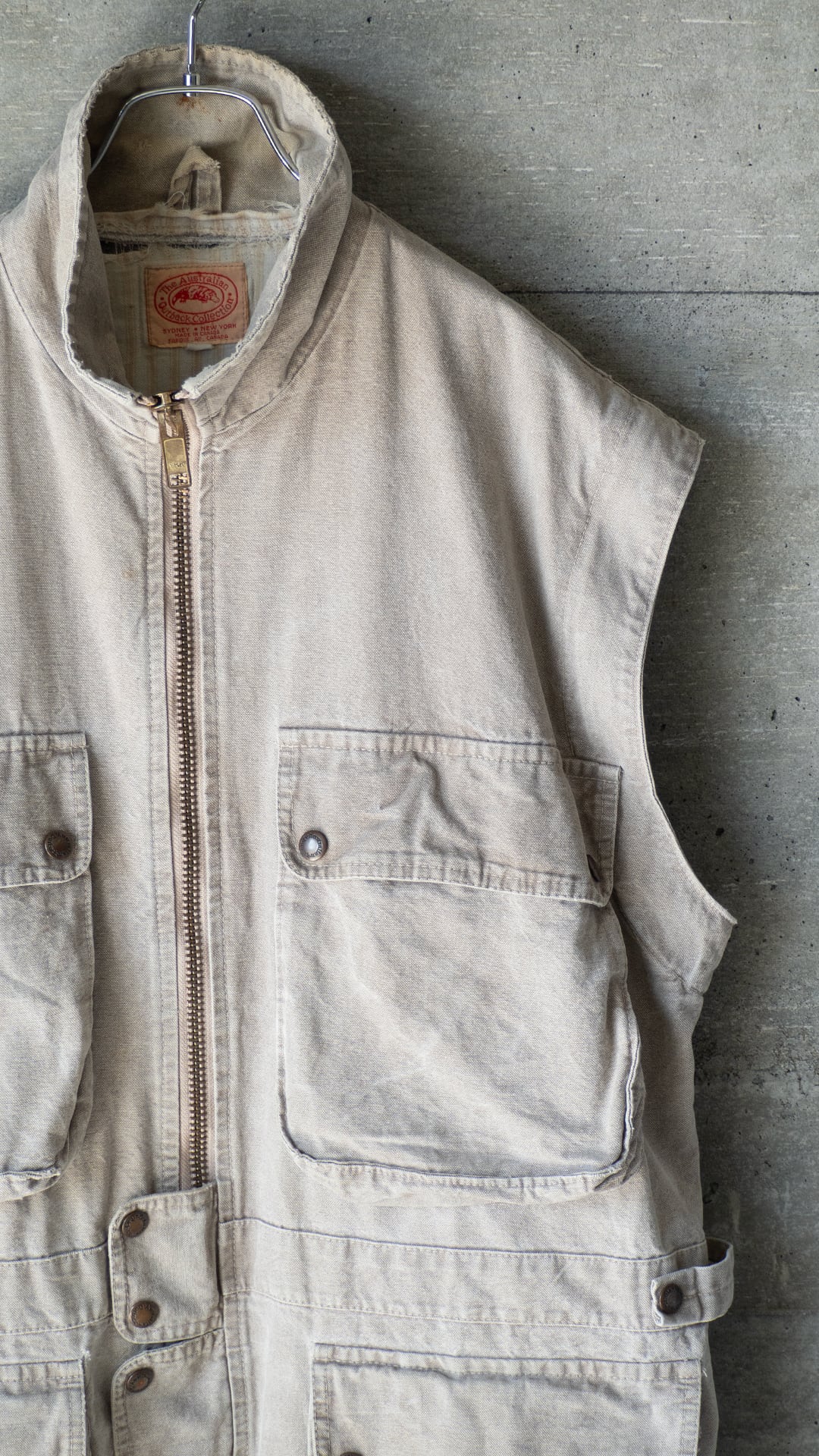 1980年代から90年代にカナダを拠点に、高品質なオイルドジャケットやダスターコートのブランドとして北米で人気を博した、The Australian Outback Collection(ザ・オーストラリアン・アウトバックコレクション)のジャケットです。この個体は、80年代後半に製造されたものだと思われます。