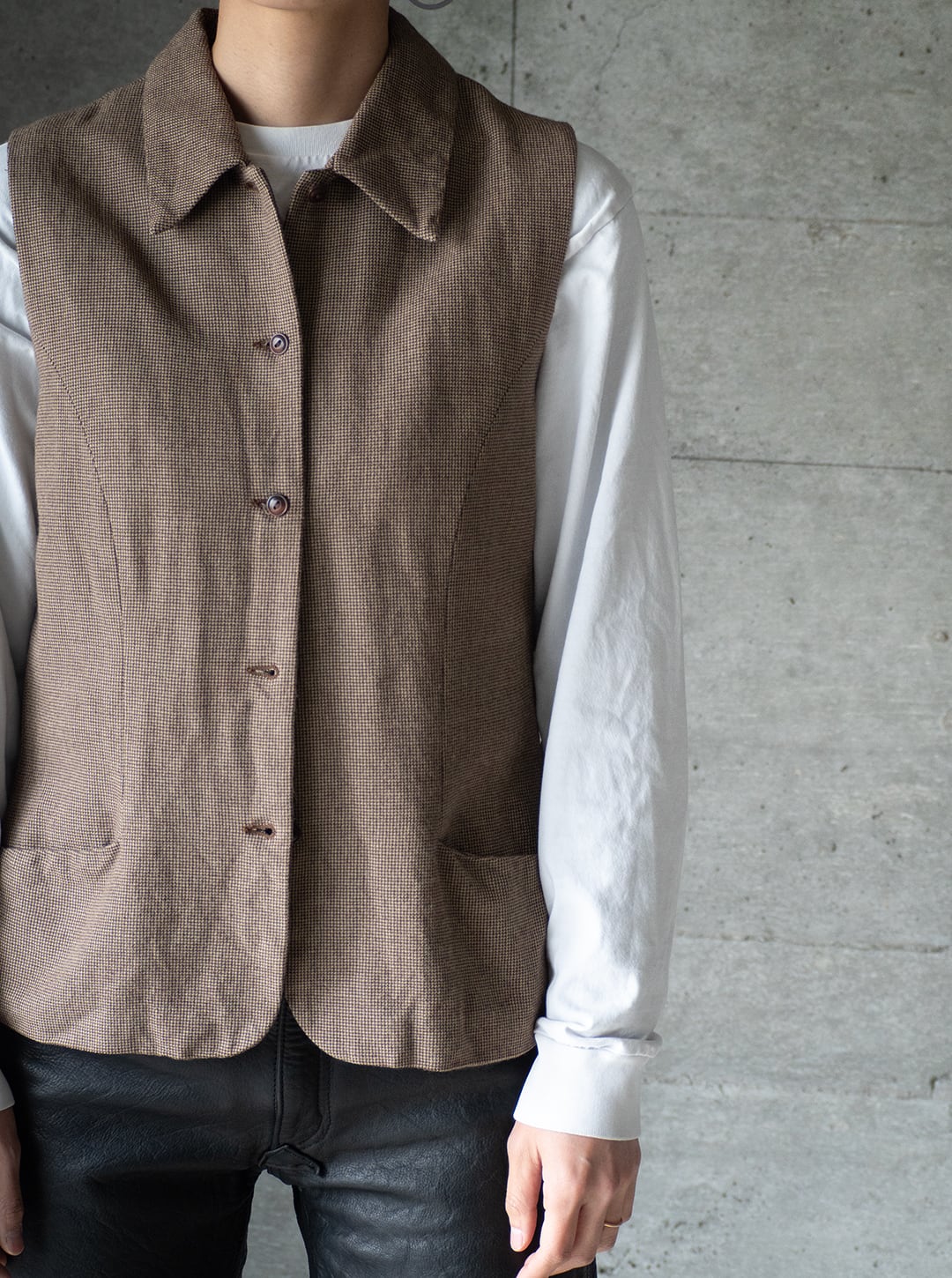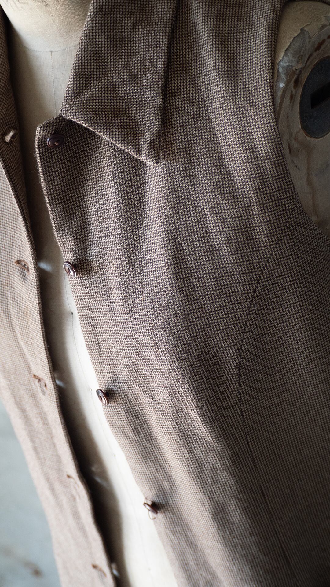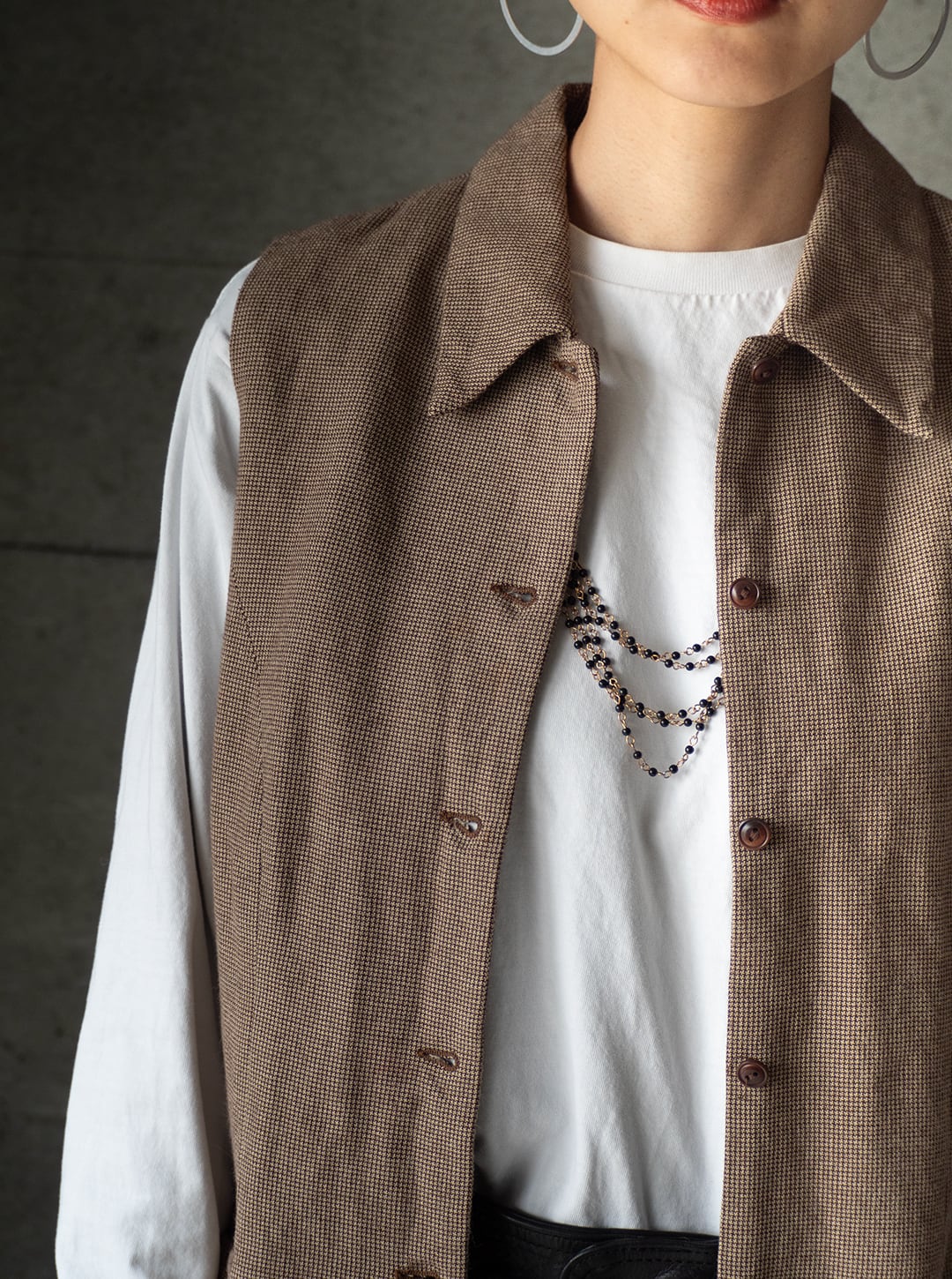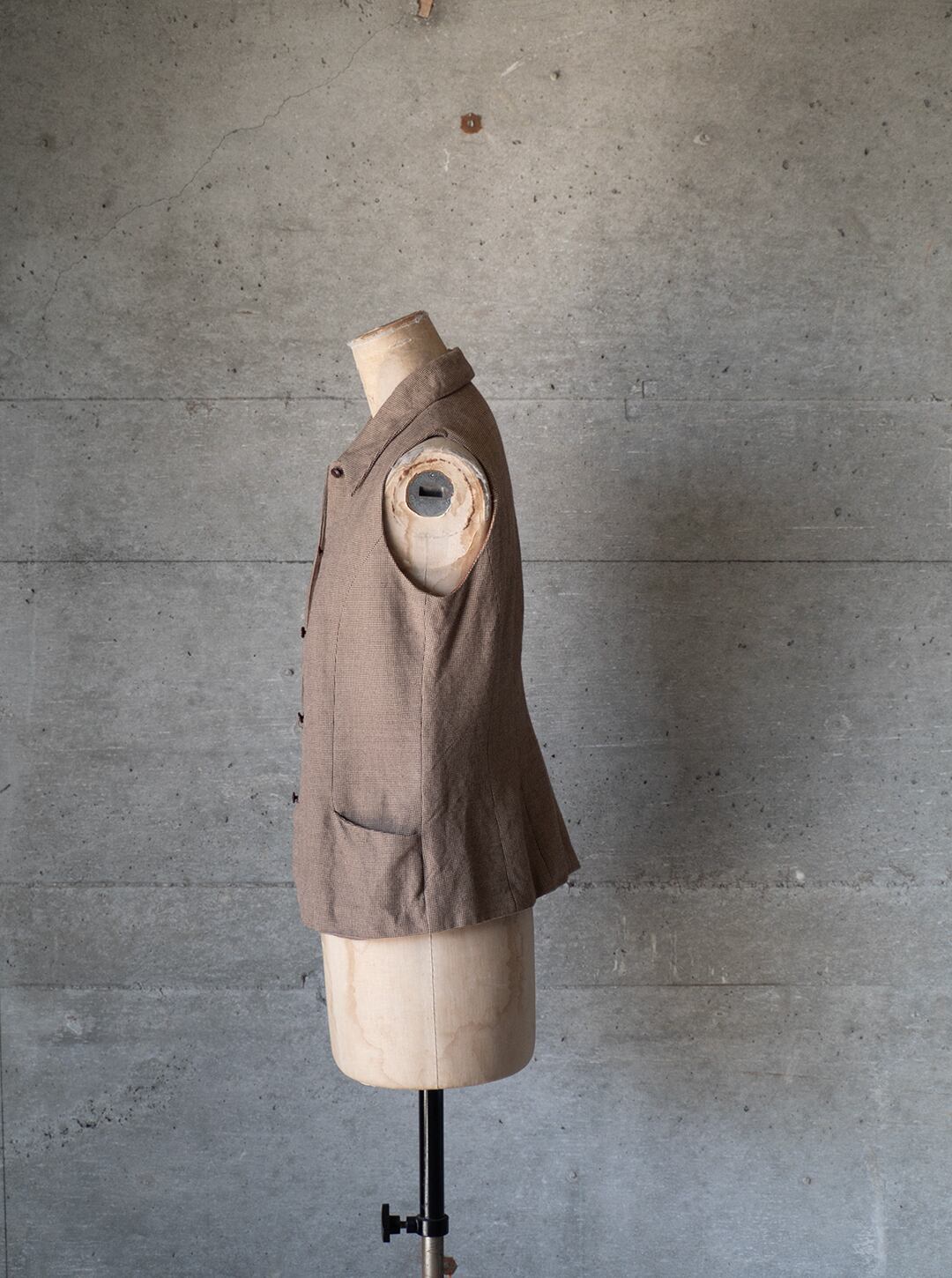 レーヨン80%、ウール20%というレーヨン勝ちのとろみある千鳥チェック生地で仕立てた、ノースリーブのトップスです。
