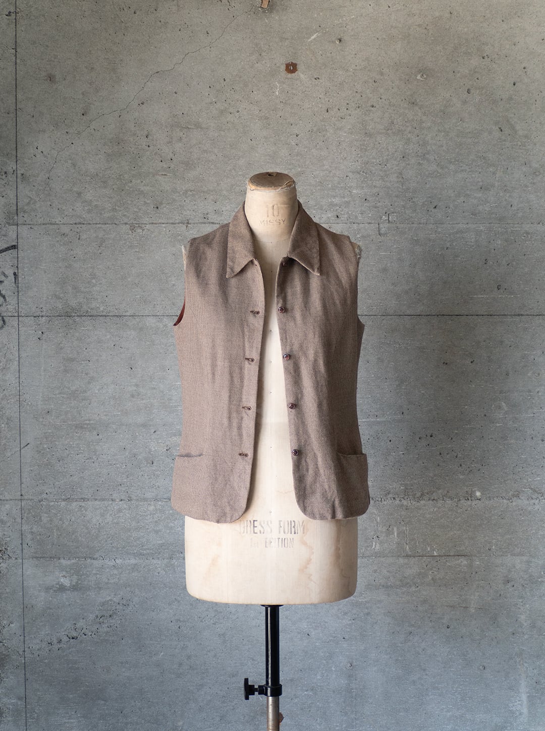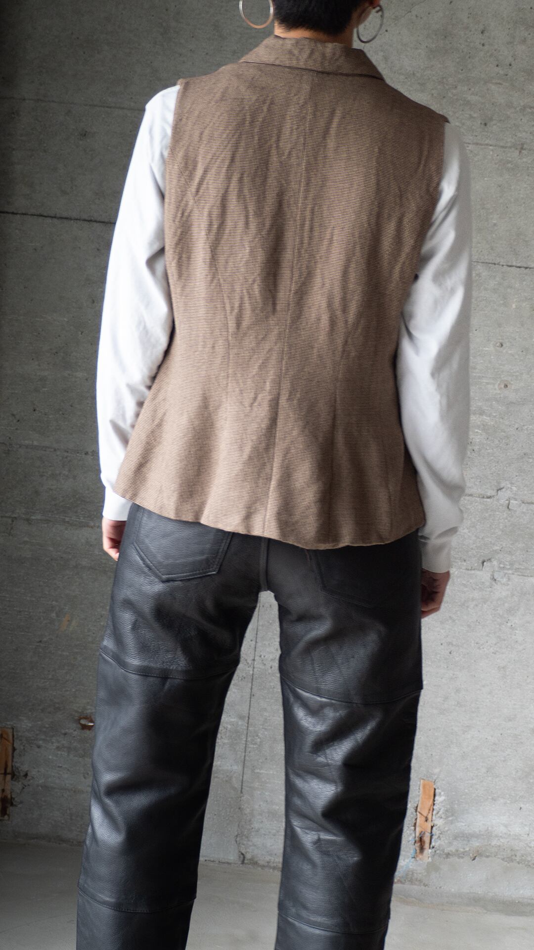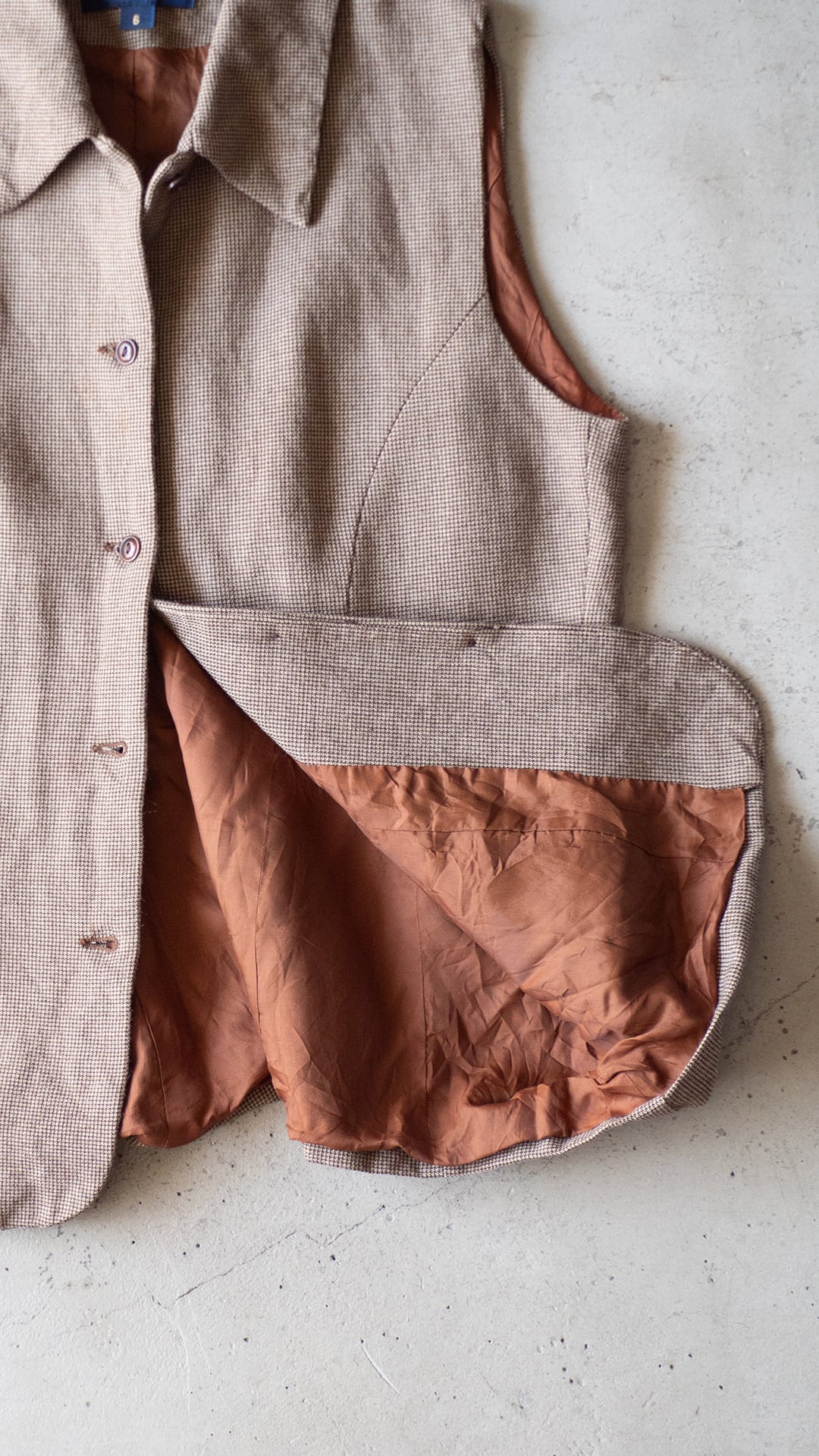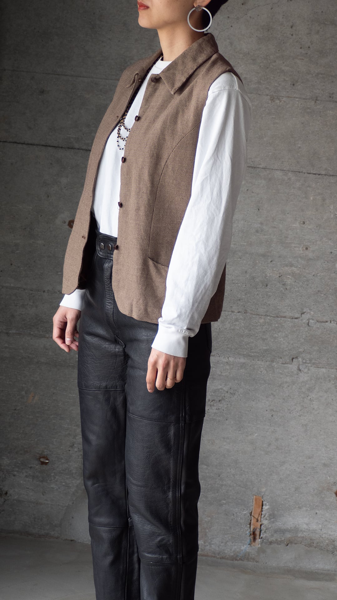 レーヨン80%、ウール20%というレーヨン勝ちのとろみある千鳥チェック生地で仕立てた、ノースリーブのトップスです。