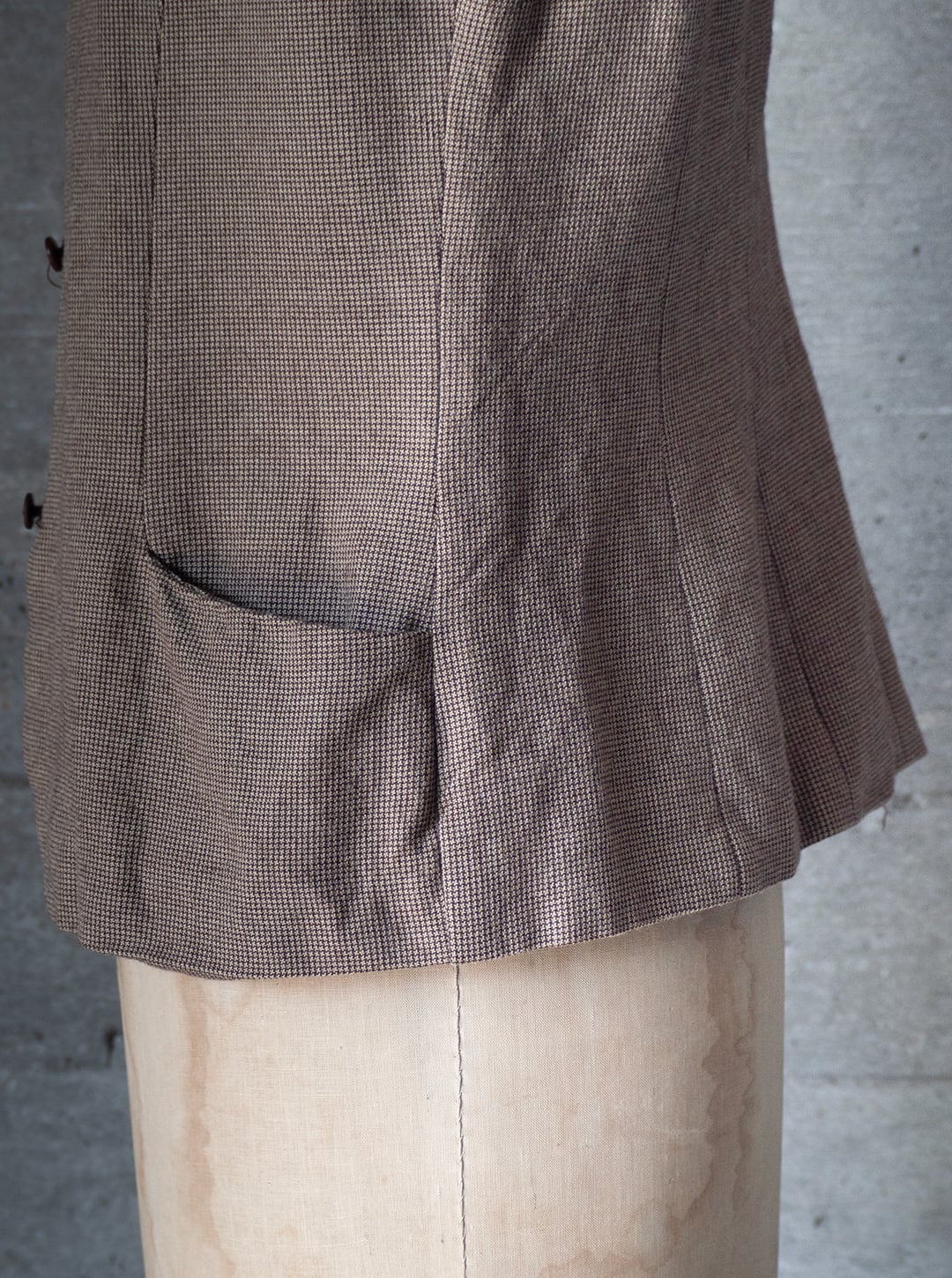 腰のポケットは飾りレベルの浅いポケットですが、ダーツ剥ぎと繋がった秀逸なデザインだと思います。