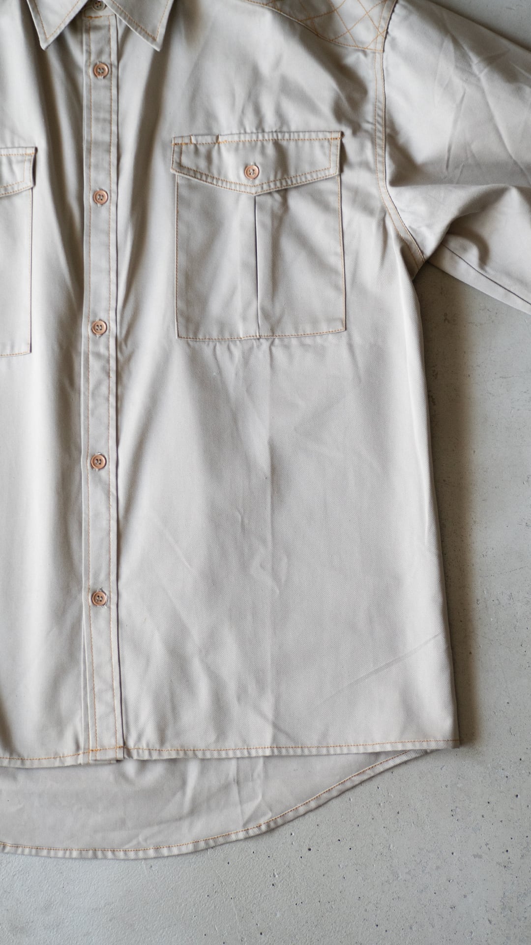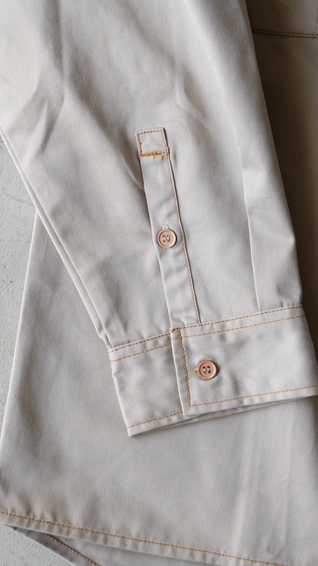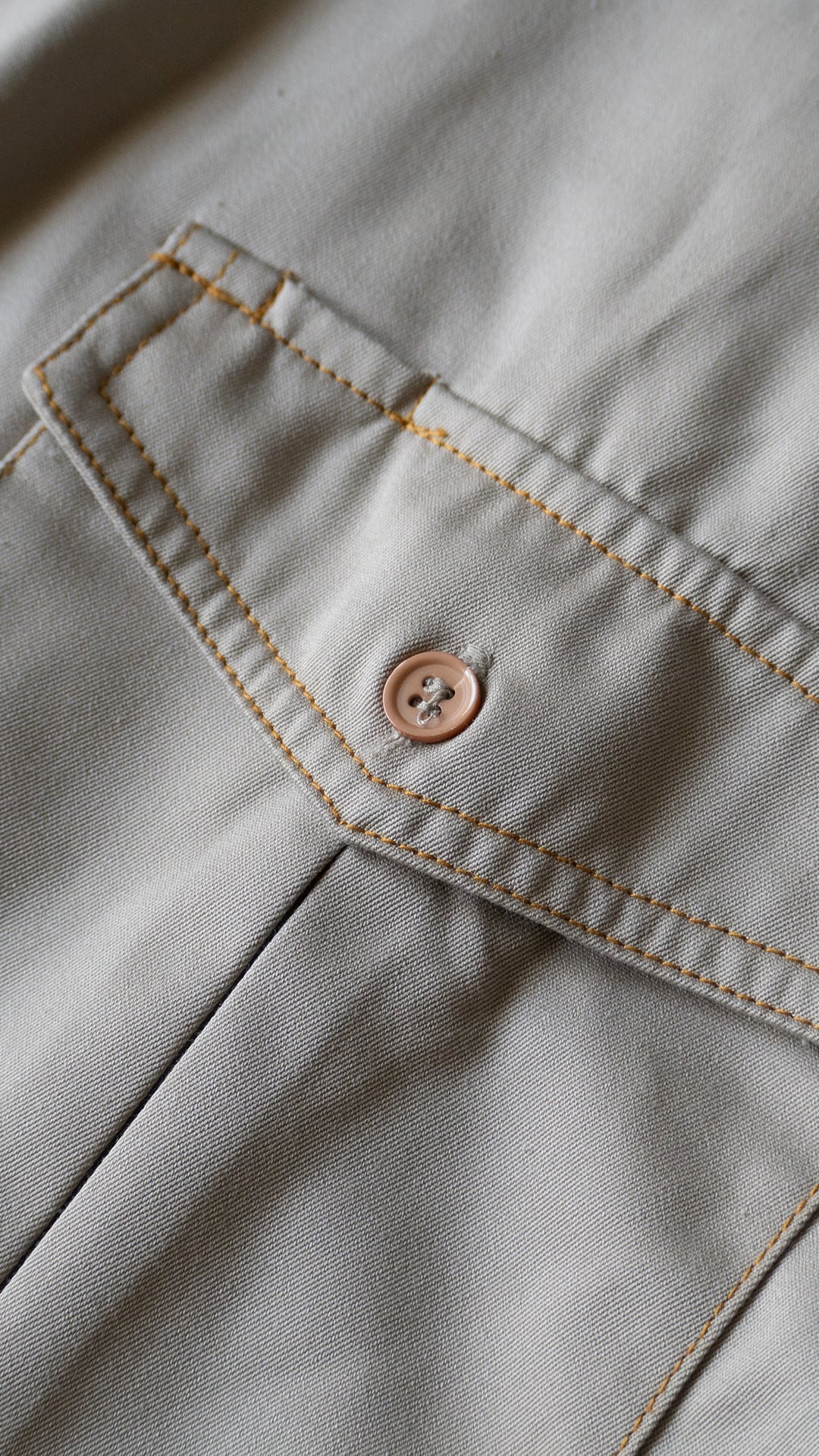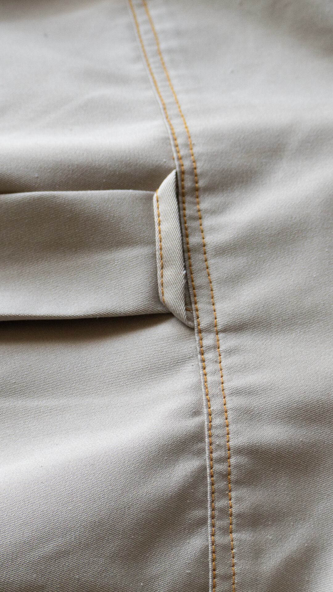 ポリエステルとコットンを混紡した薄手のチノクロスを、オレンジ色の太番ステッチで縫い上げたシャツ。肩のダイヤステッチ、ポケットフラップのダブルステッチなど、堅牢さだけでなく意匠的な雰囲気がなんとも気に入っています。ボタンのカラーアソートにも雰囲気があります。