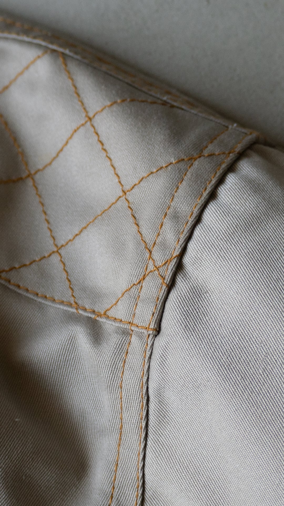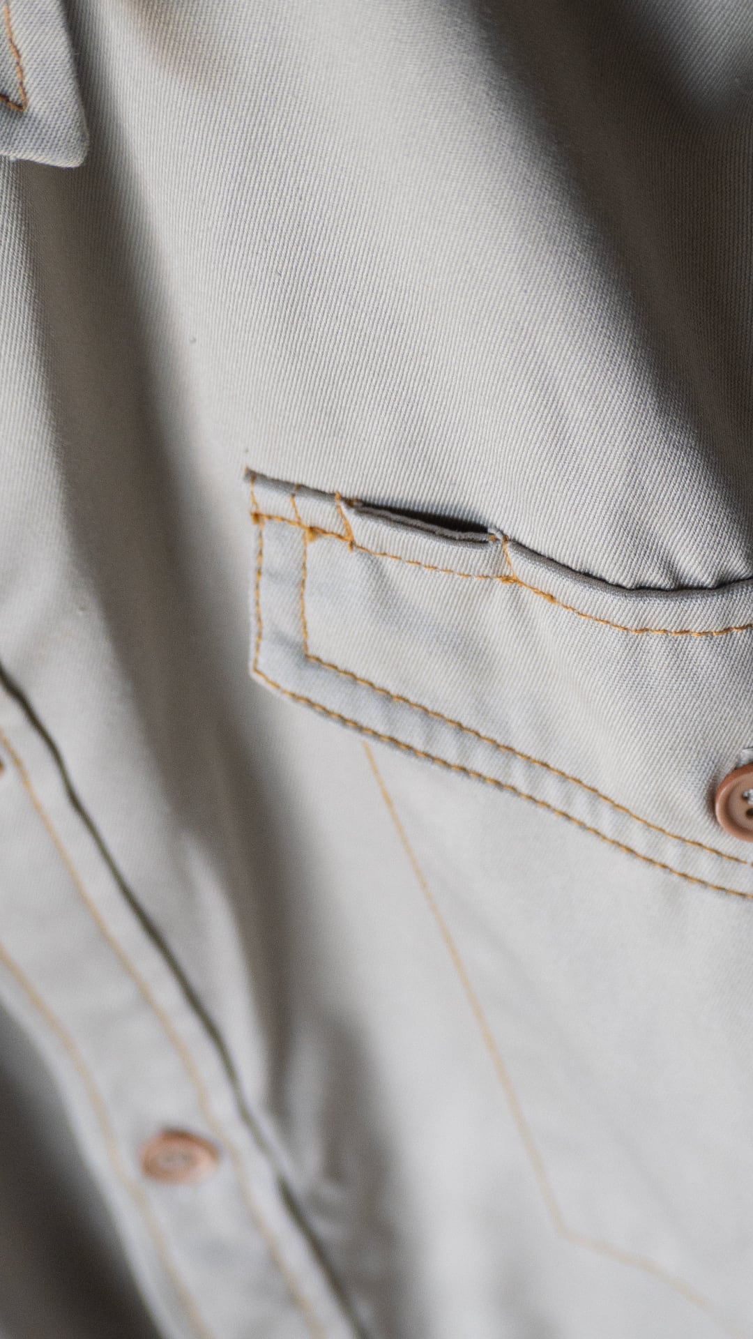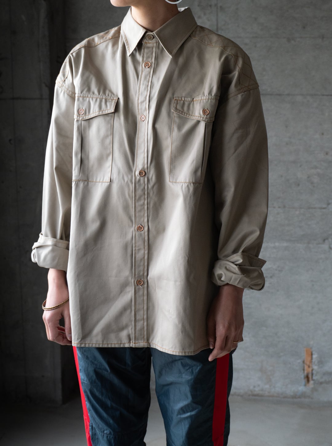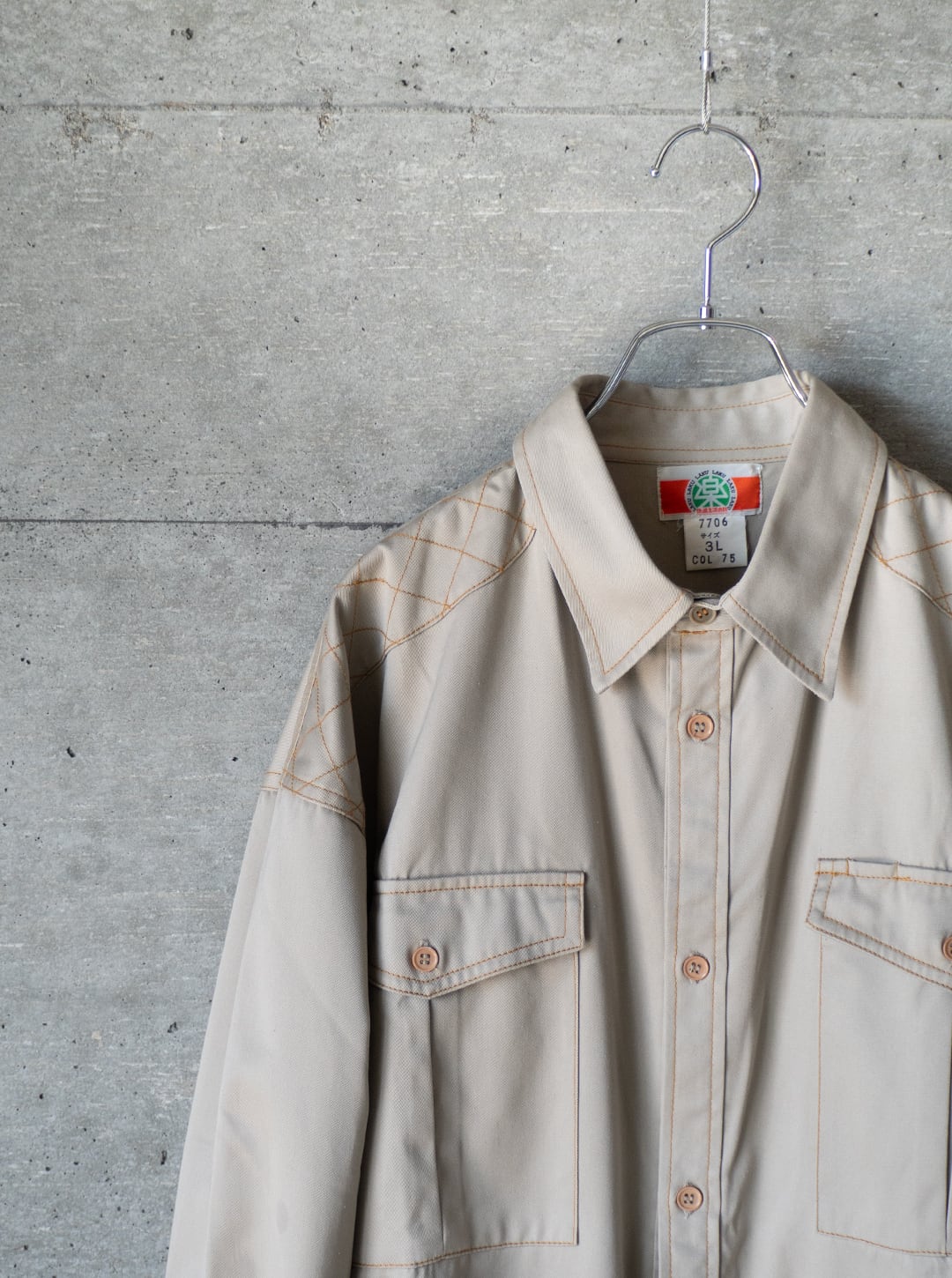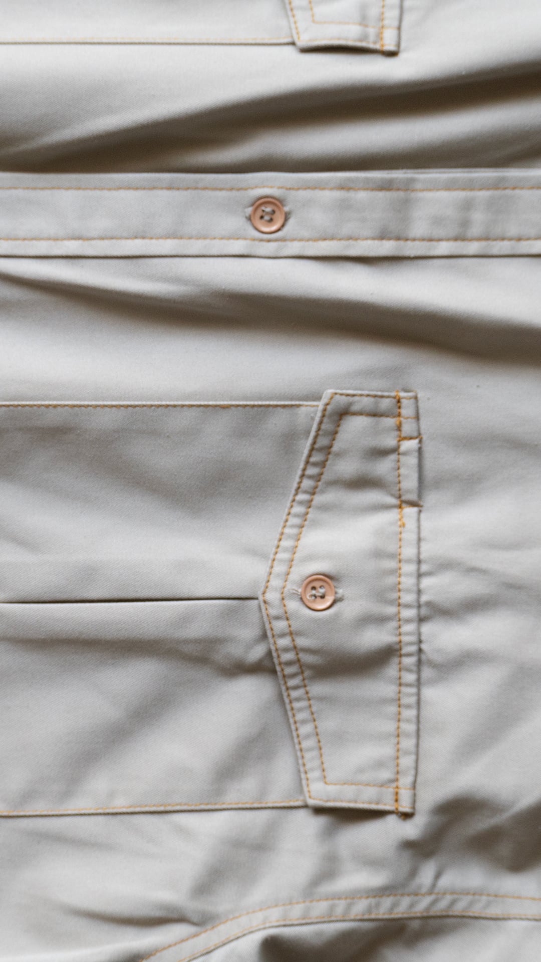 ポリエステルとコットンを混紡した薄手のチノクロスを、オレンジ色の太番ステッチで縫い上げたシャツ。肩のダイヤステッチ、ポケットフラップのダブルステッチなど、堅牢さだけでなく意匠的な雰囲気がなんとも気に入っています。ボタンのカラーアソートにも雰囲気があります。