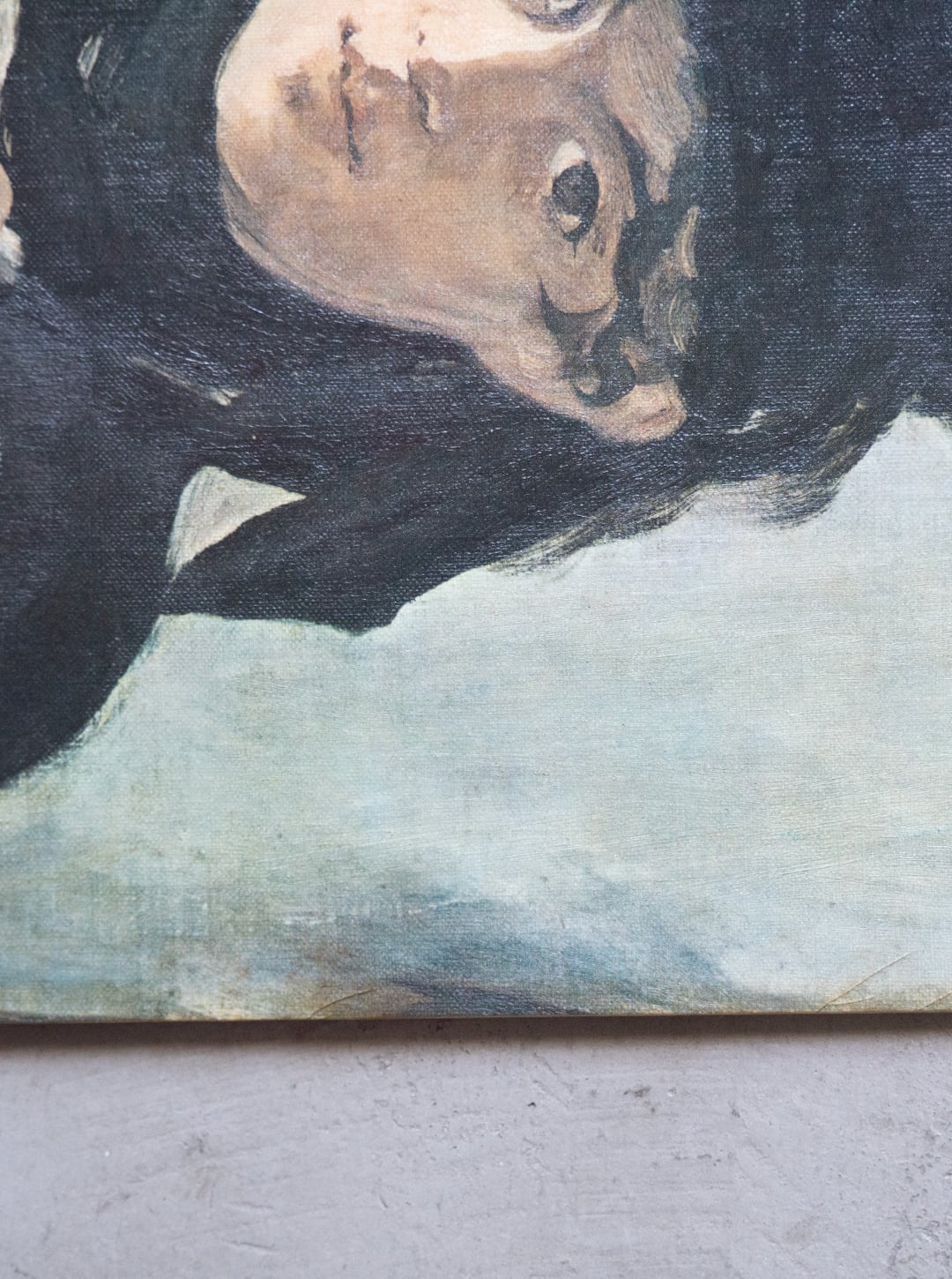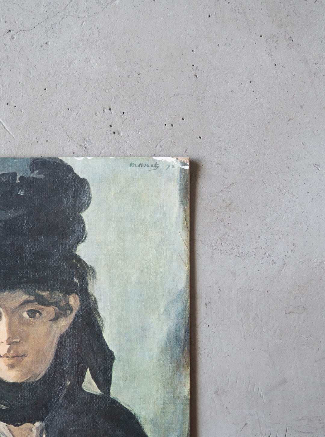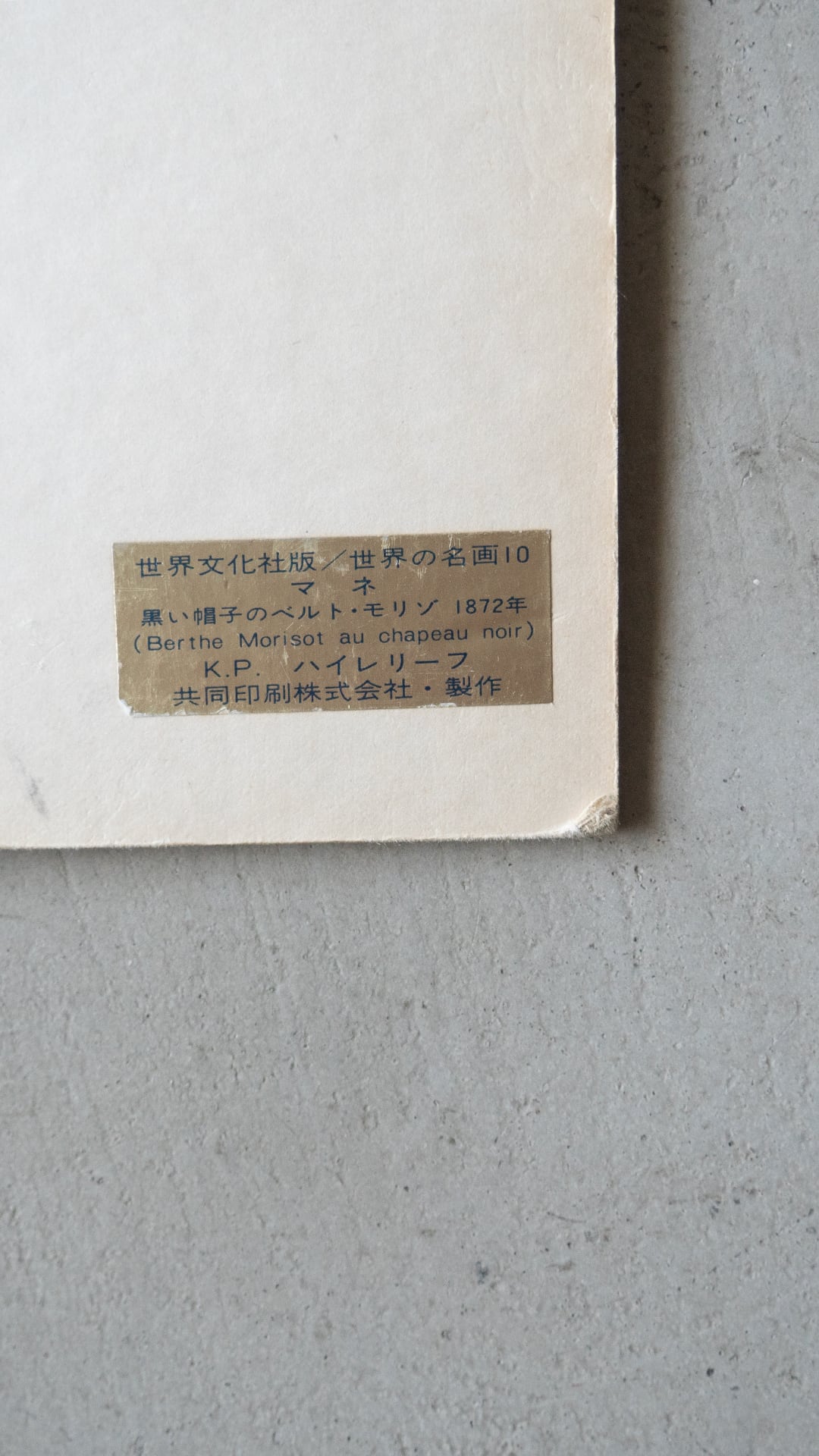 世界文化社が出版した「世界の名画」シリーズの10巻に収録されている、エドゥアール・マネの複製絵画です。複製されたこの絵は、1872年に制作された「黒い帽子のベルト・モリゾ (Berthe Morisot au chapeau noir)」です。世界文化社の「世界の名画」シリーズは1950年代には発行されており、この個体はその関連商品として流通していたものだと思います。
