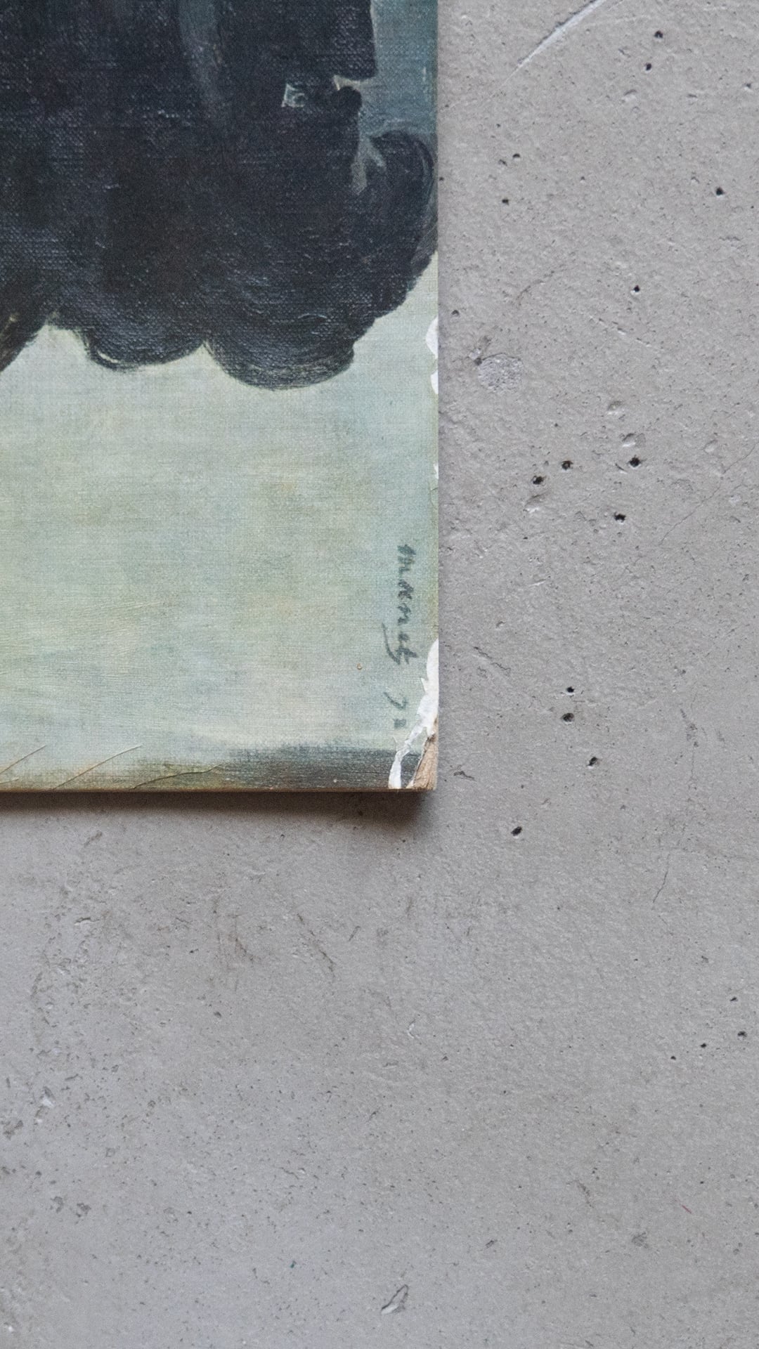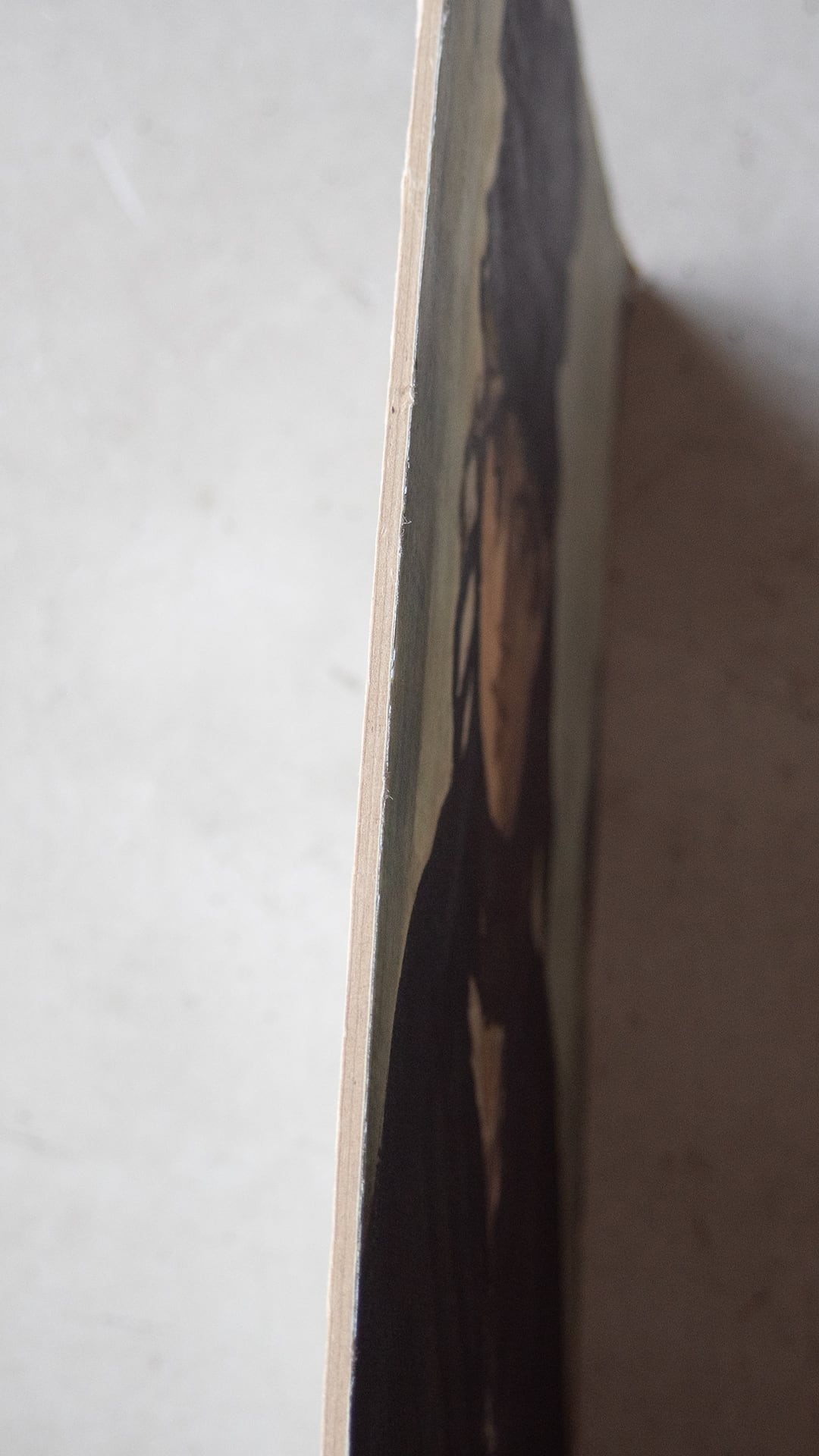 3mmもの厚みがあり、板のように硬い厚紙を使用して、プリントされた表面はキャンバスの織り目までもが表現された細かい複製絵画だと思います。K.P. ハイレリーフ共同印刷株式会社による制作物であることがラベルに記載されています。