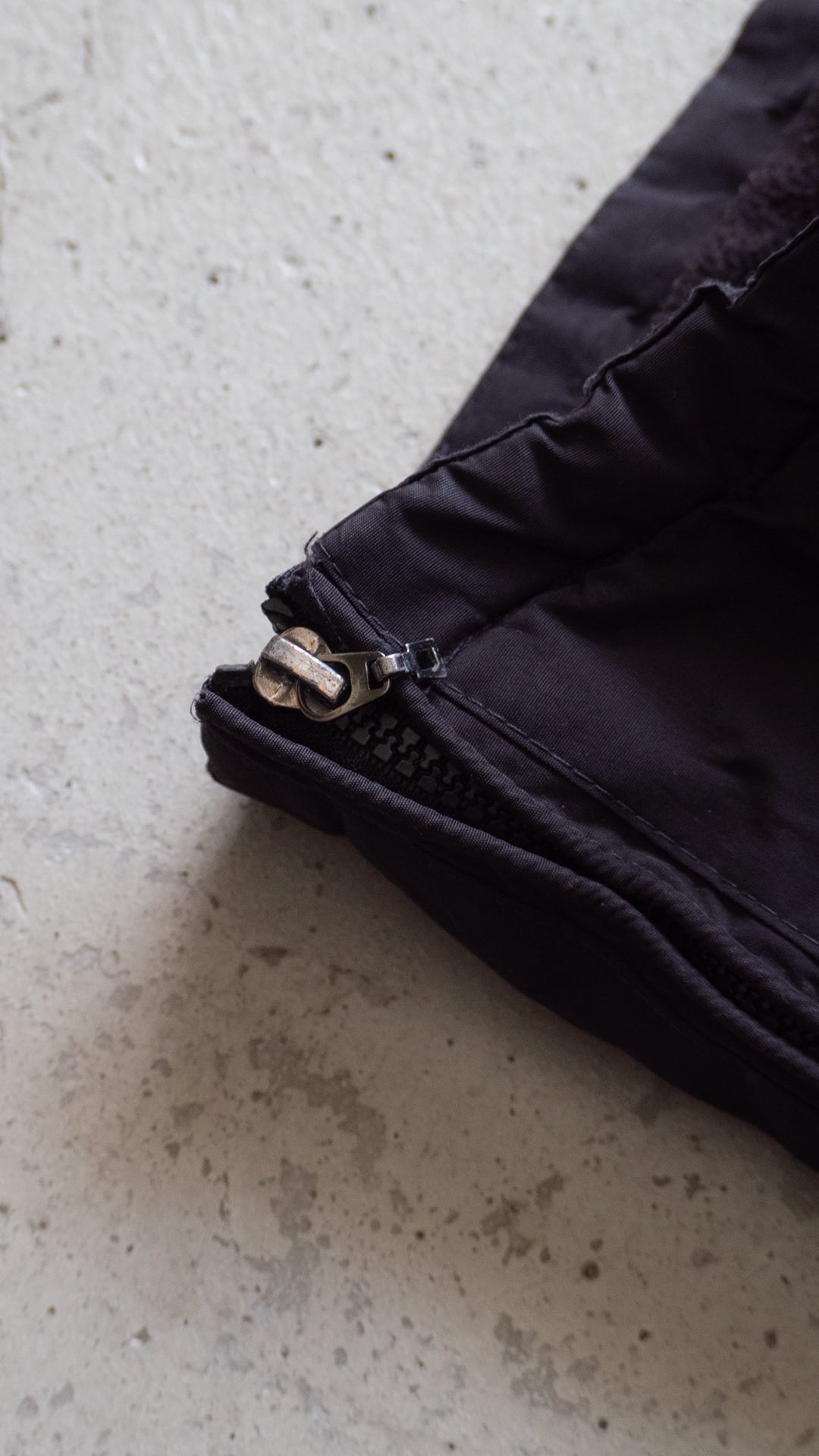 前立てジップ最下部、ポケット口や内側を中心にリペアを施しています。ジグザグステッチなどが複数走っていますが、ダメージヴィンテージをサルベージした意匠的ステッチとしてお楽しみいただきたく思います。