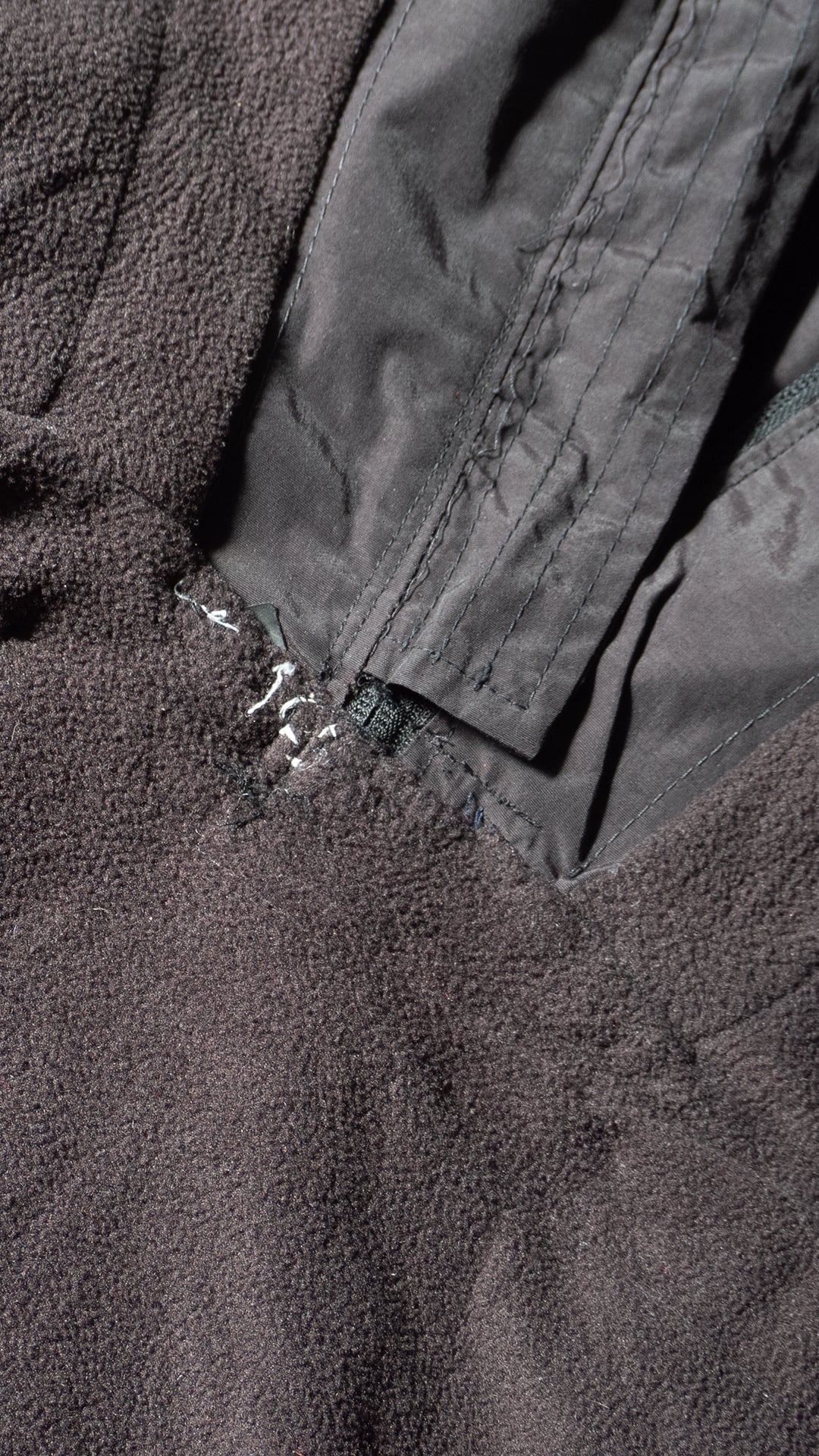 前ジップ最下部、胸ポケット脇にリペアステッチがございます(写真15,16枚目掲載)。