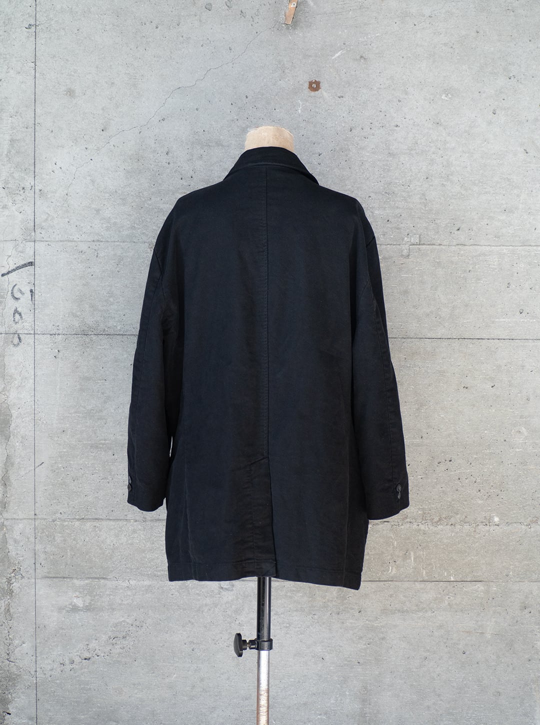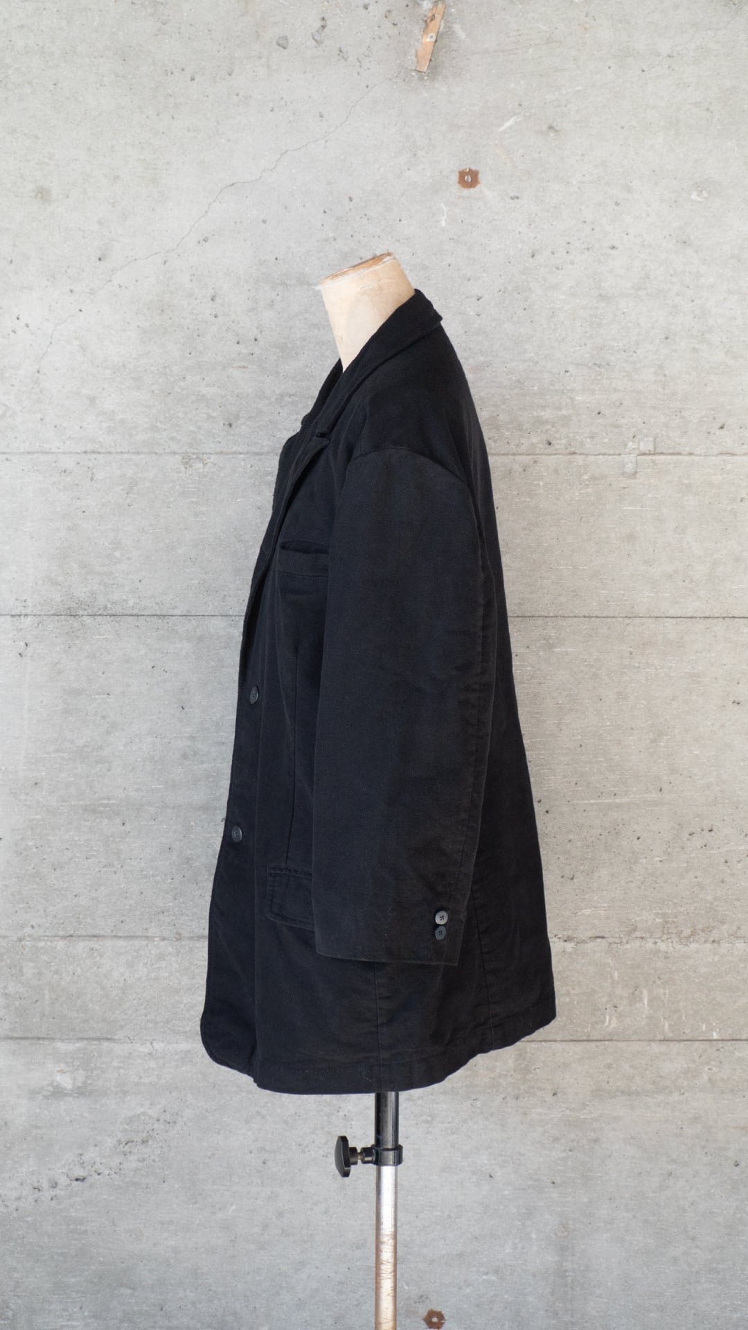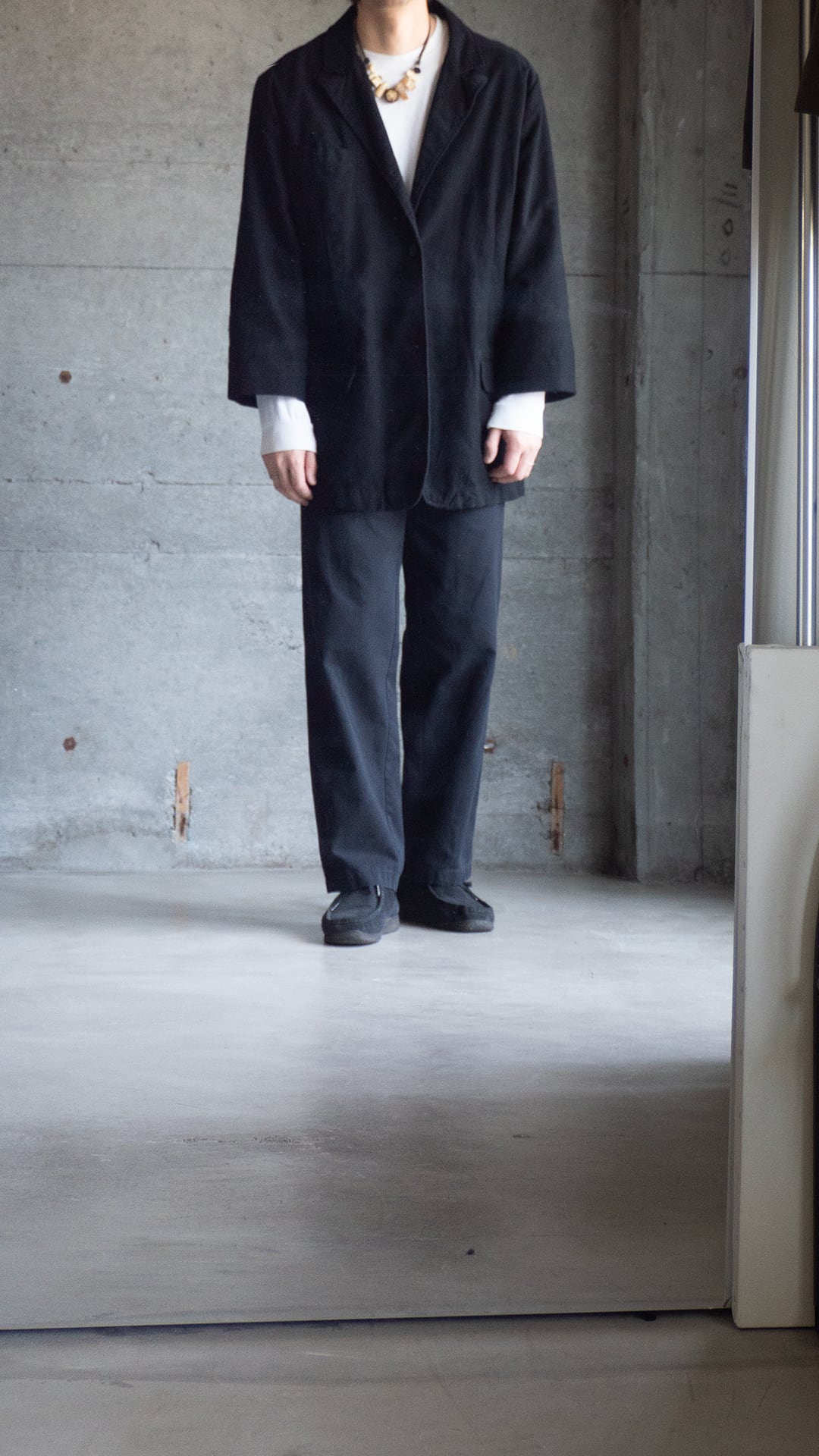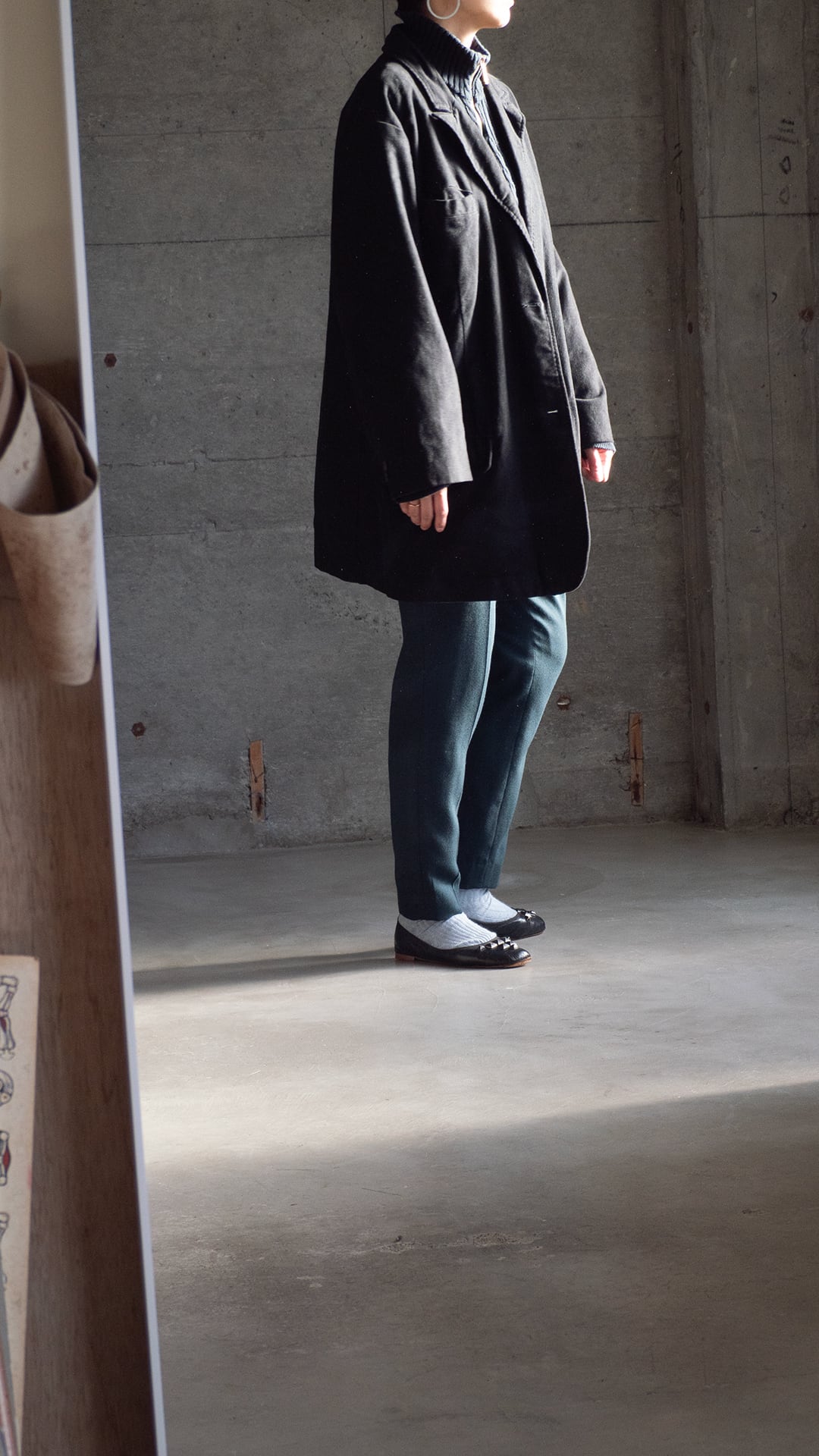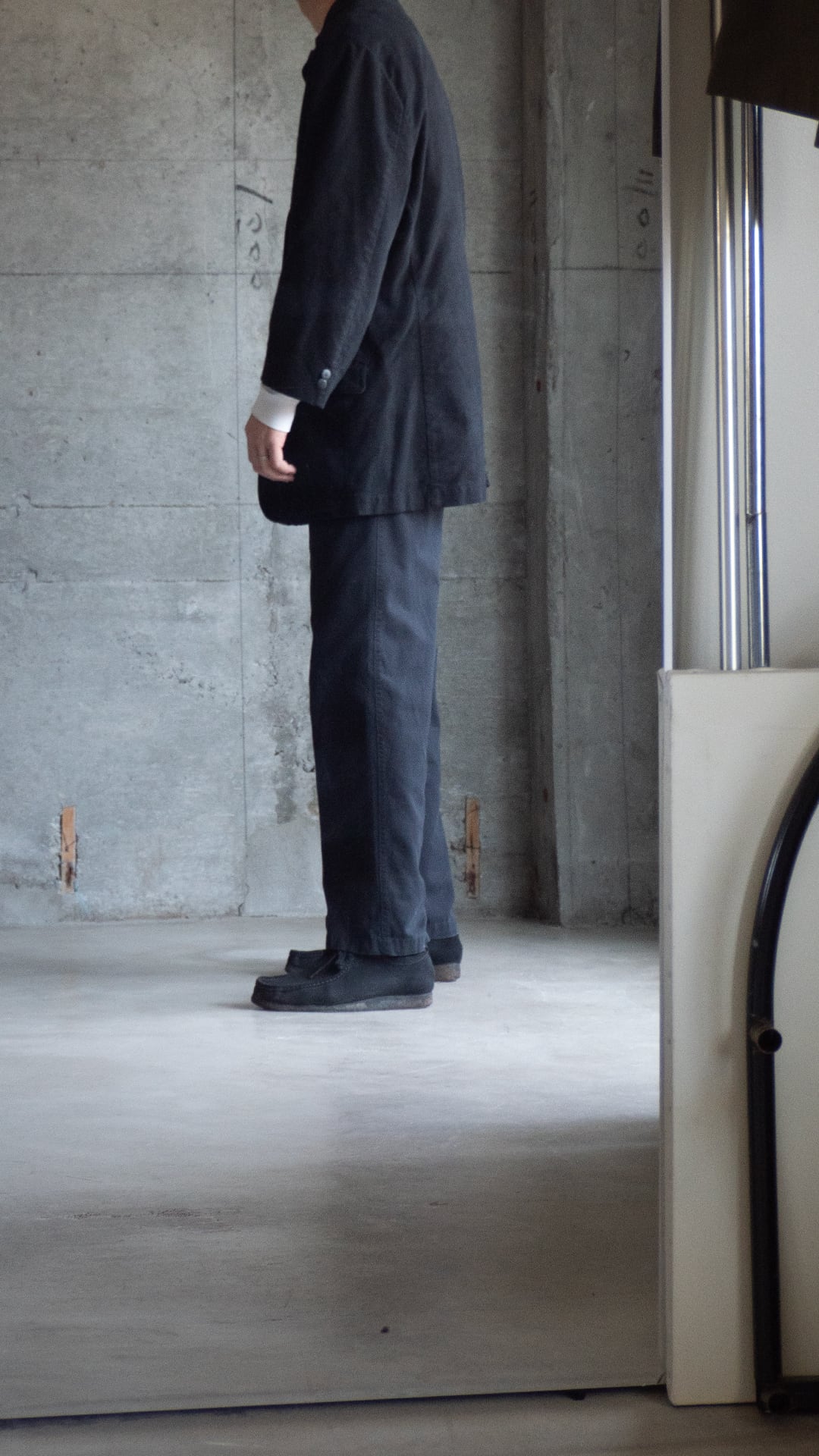 今回のジャケットは、肉厚なモールスキン素材のメンズ仕様。膨らみと起毛が深いコットン100%のファブリックです。太番手ステッチで叩かれた衿端にパッカリングが生まれることで適度に力の抜けたピークドラペル。合わせ位置はとても深く、着用時は歪な形になっていてとてもユニーク。