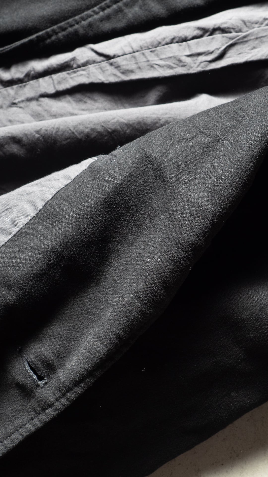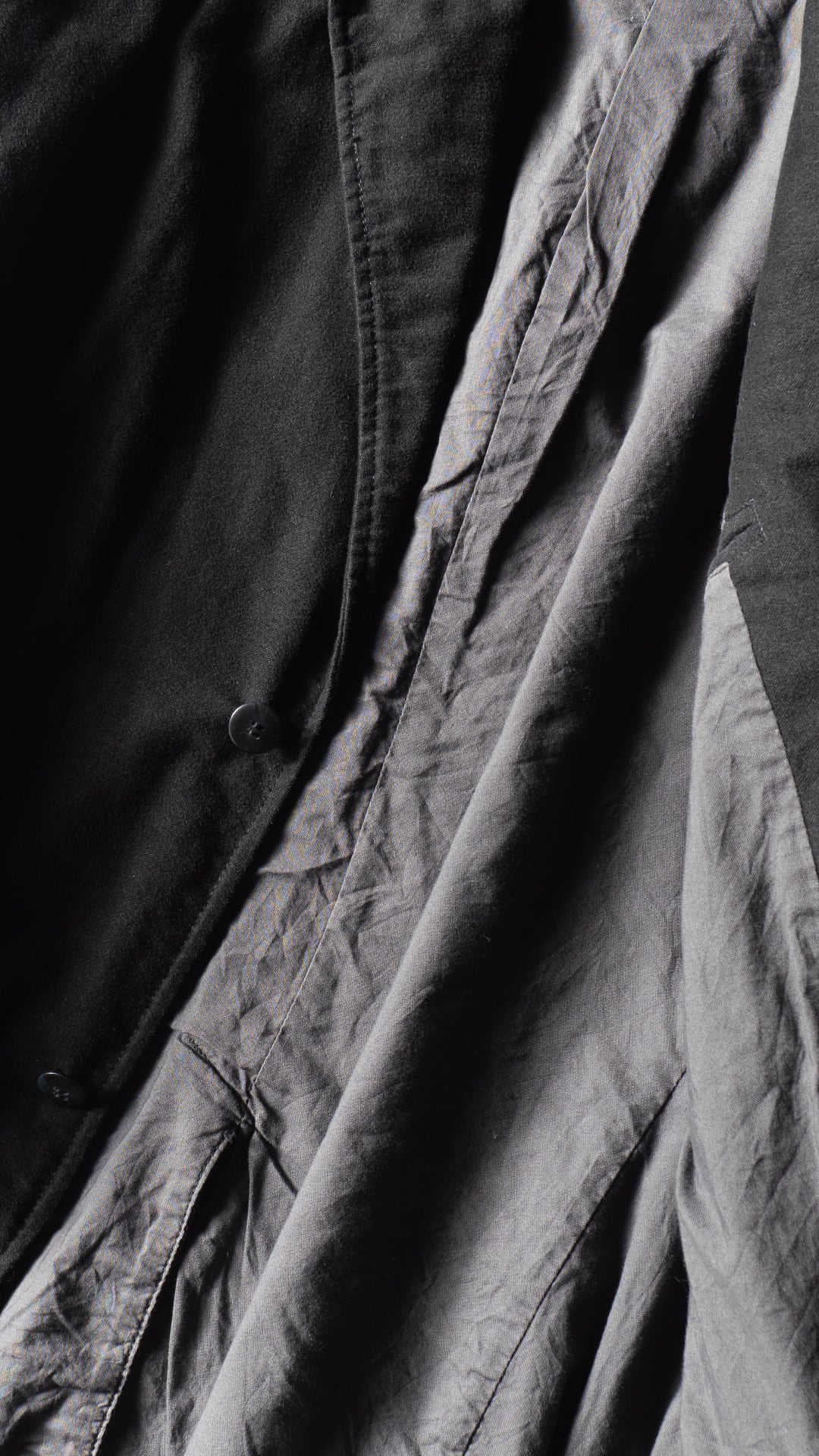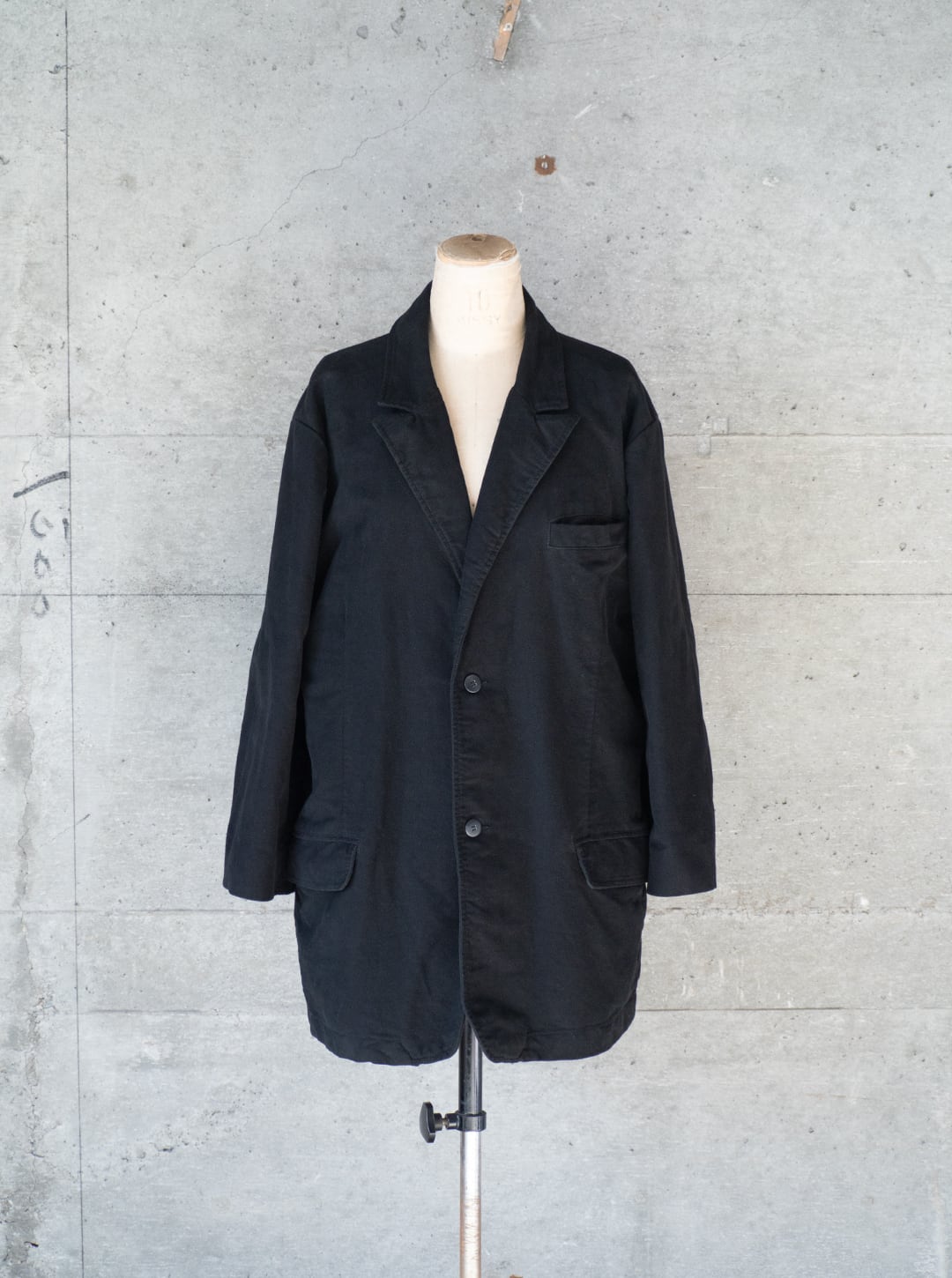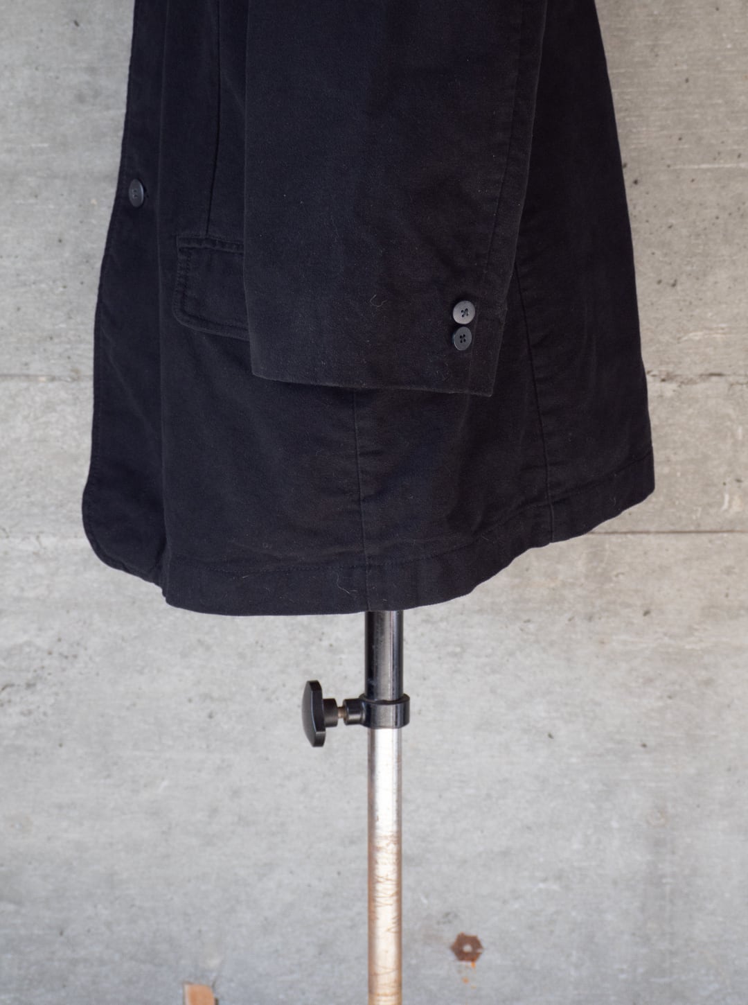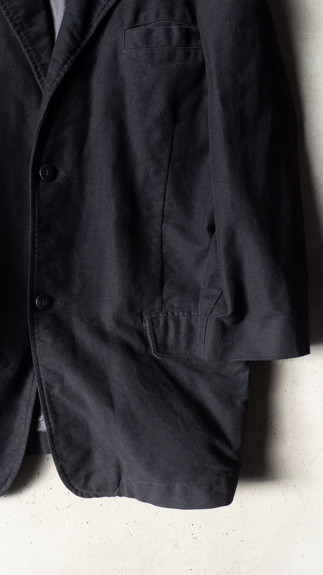 今回のジャケットは、肉厚なモールスキン素材のメンズ仕様。膨らみと起毛が深いコットン100%のファブリックです。太番手ステッチで叩かれた衿端にパッカリングが生まれることで適度に力の抜けたピークドラペル。合わせ位置はとても深く、着用時は歪な形になっていてとてもユニーク。