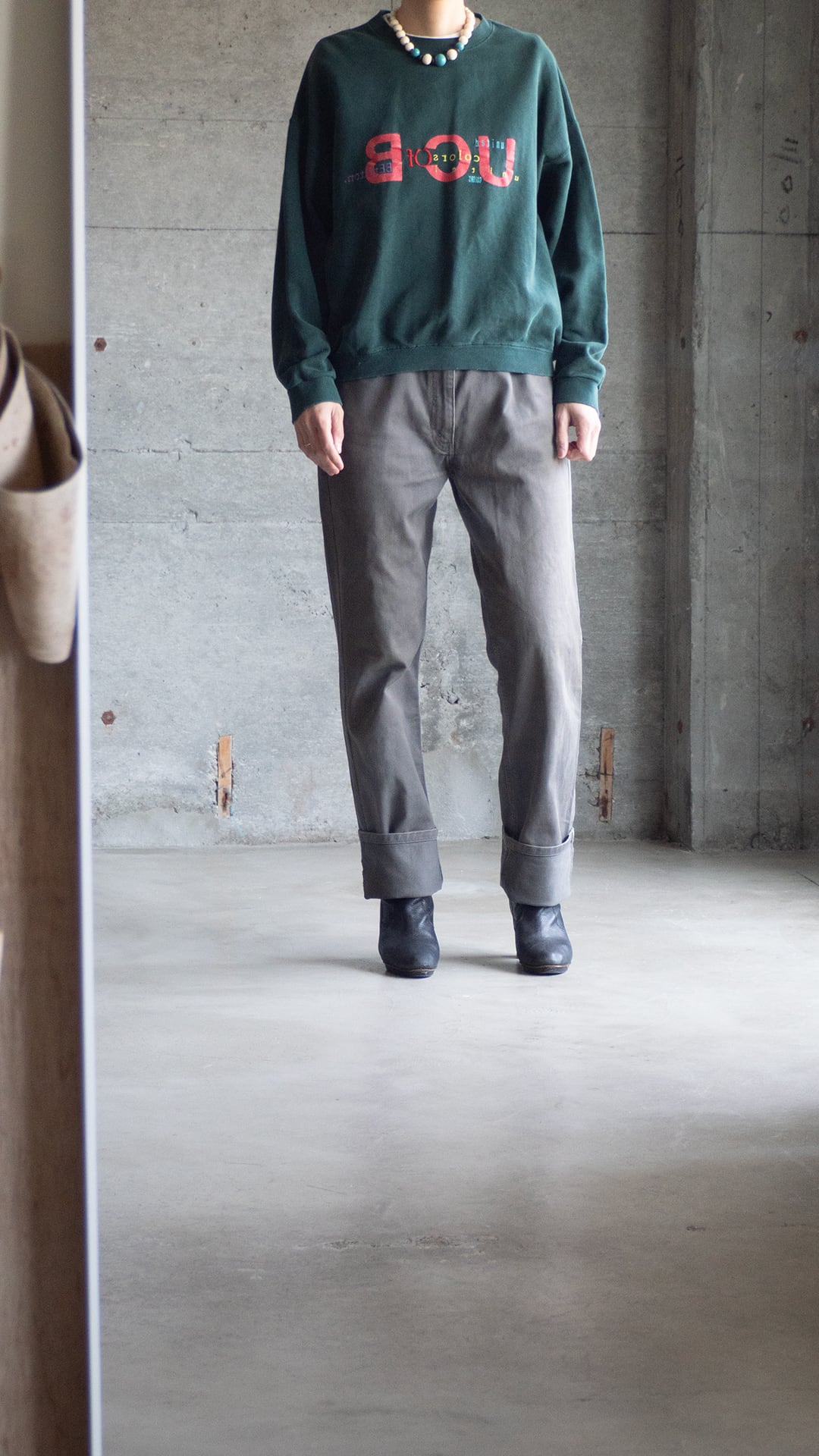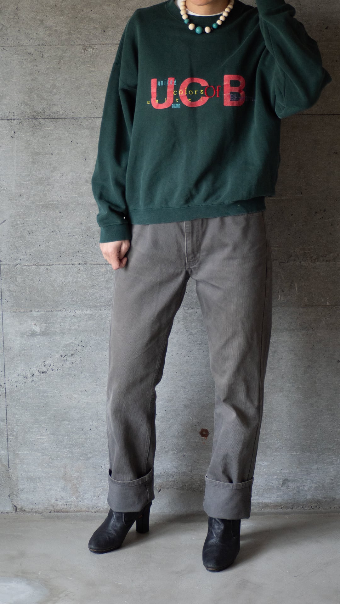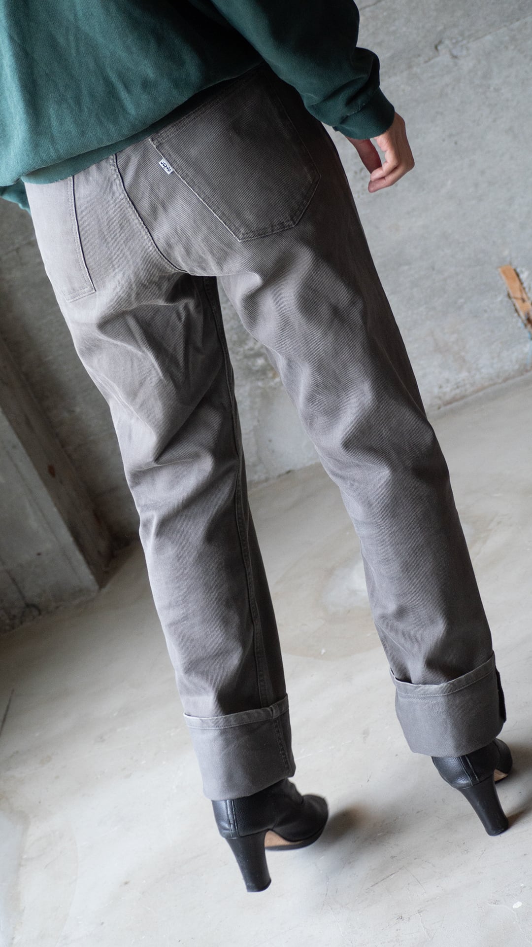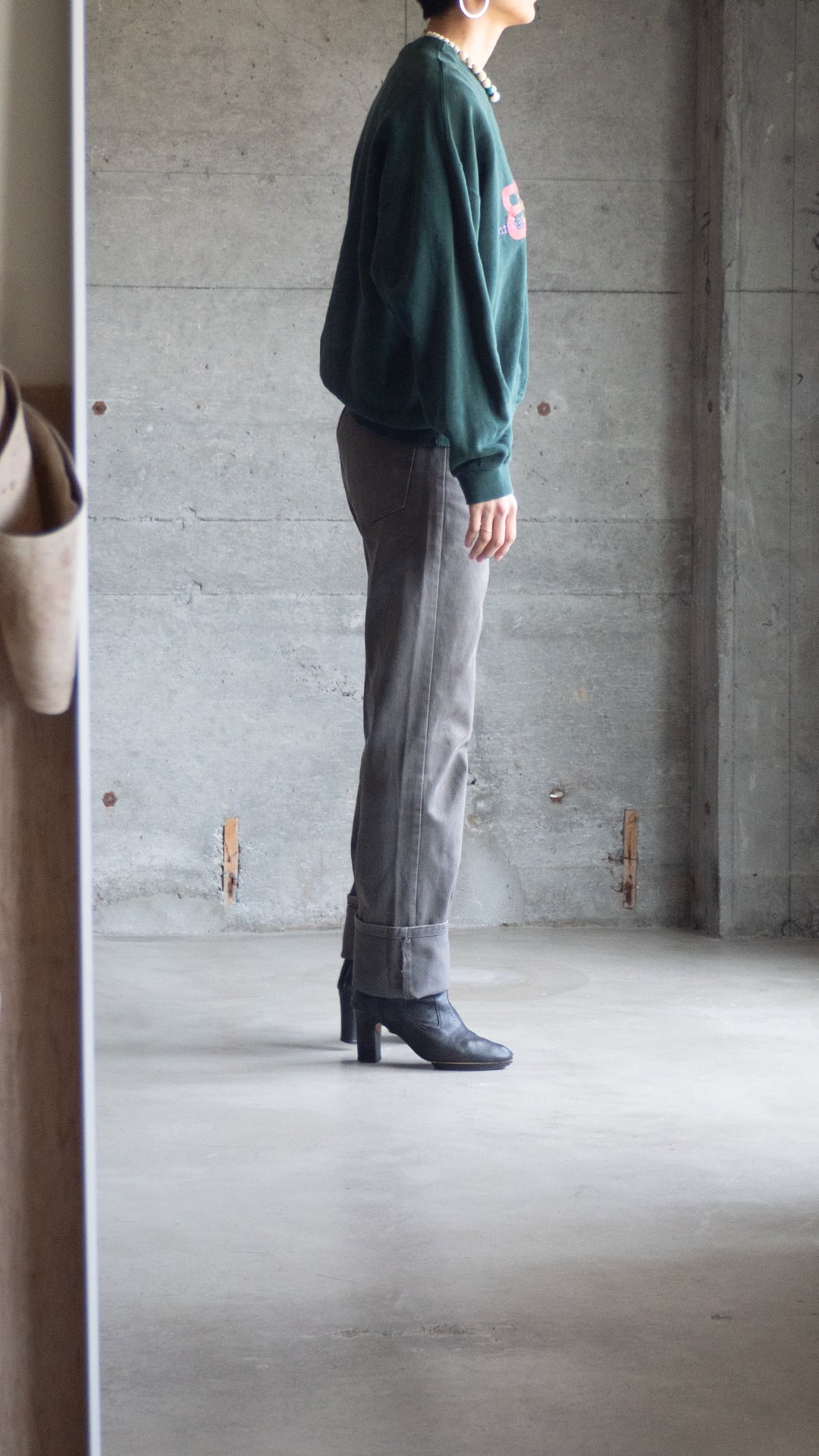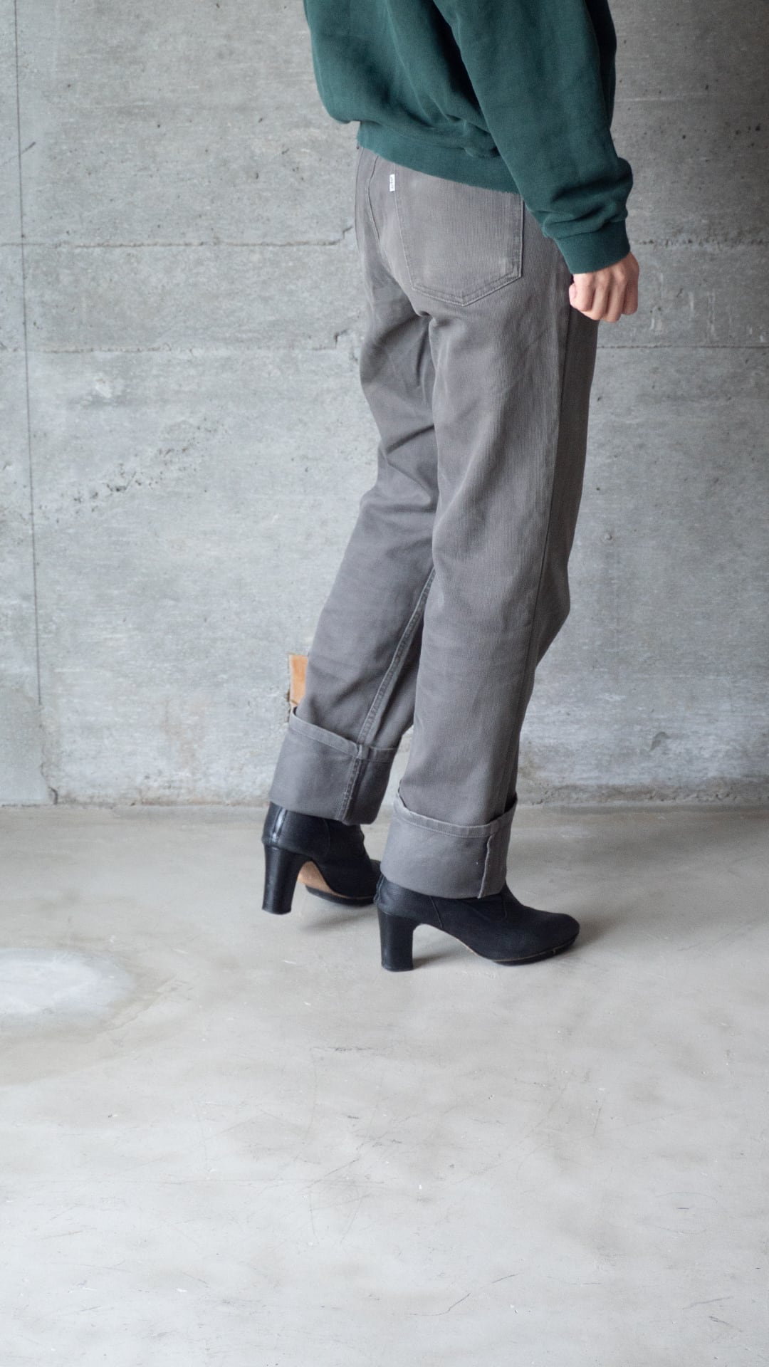 サイズは34インチ、シルエットはほぼストレートです。なので、着用画像のように裾を大きくロールアップして着用しても良いと思います。