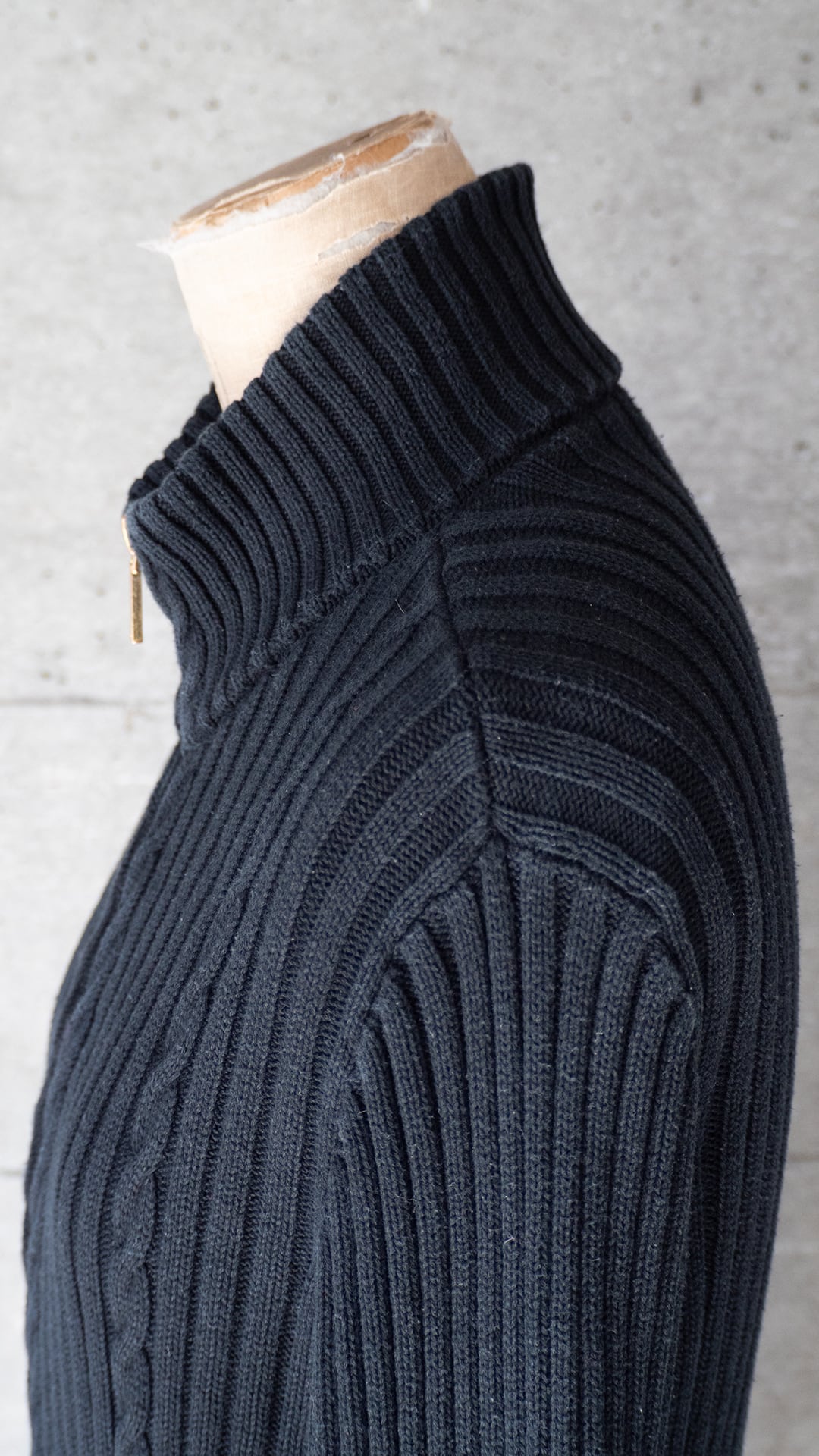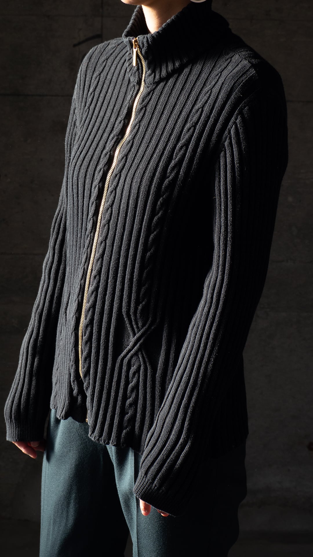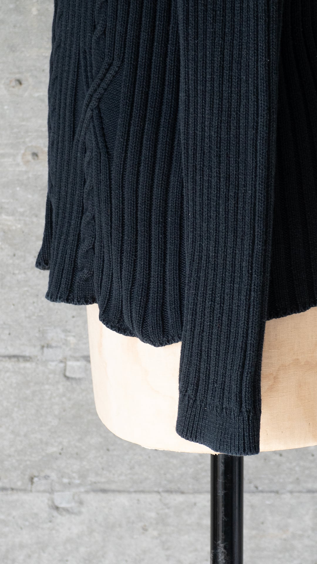 影ができるほどに立体感のある編み地で、ケーブル編み調の装飾がとてもクールに感じました。