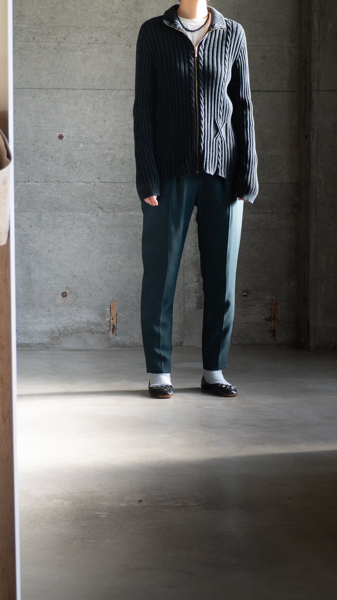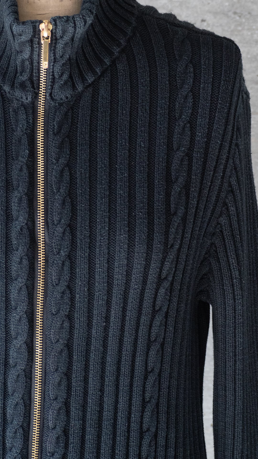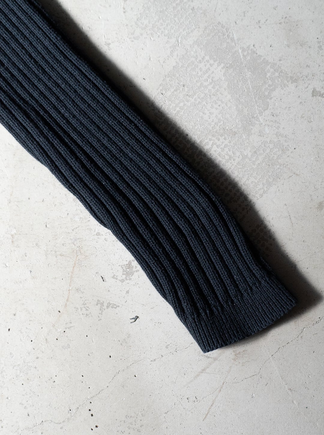 影ができるほどに立体感のある編み地で、ケーブル編み調の装飾がとてもクールに感じました。