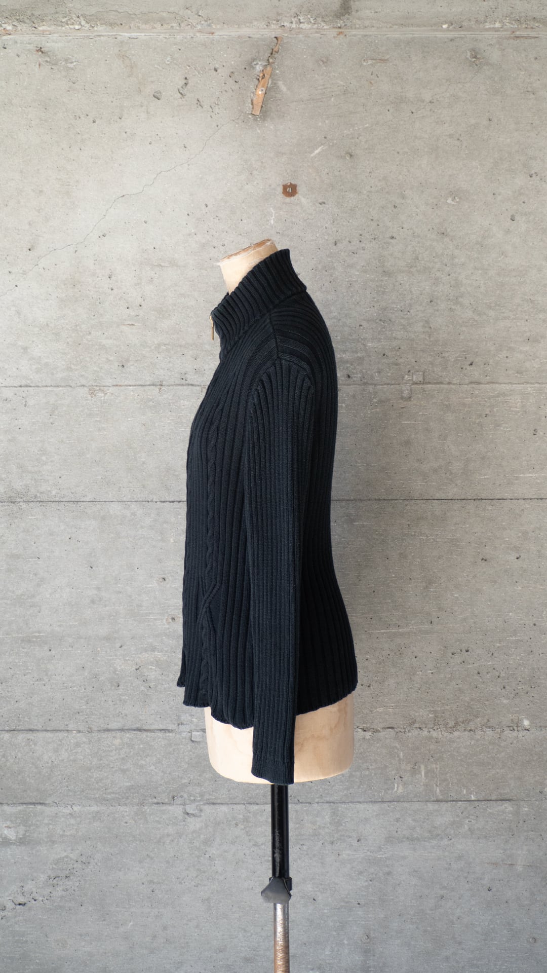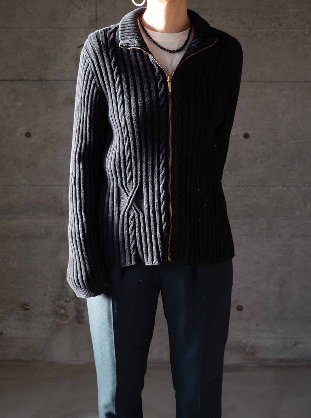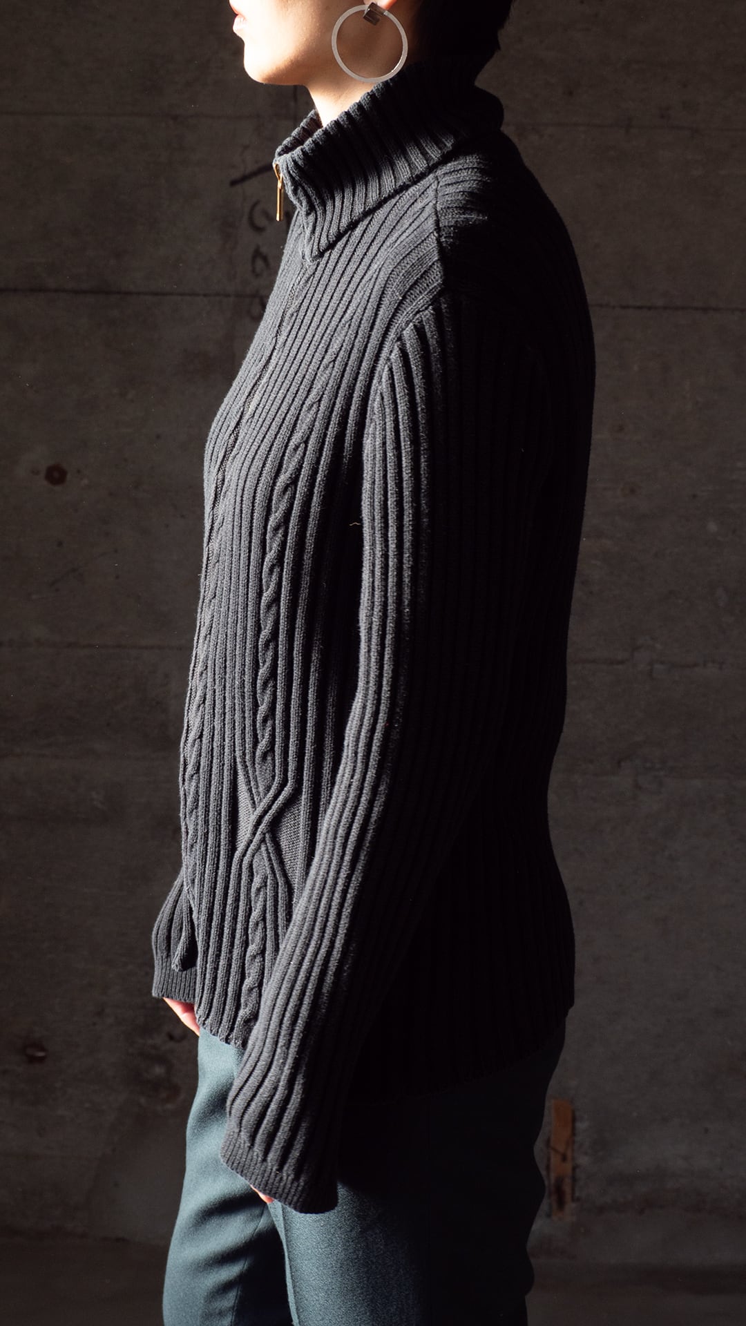 ファスナーを全閉じしてハイネックのメイントップスやジャケットのインナーに、またそれとは逆にこれ自体をジャケットのように羽織ることもでき、着回しのイメージが広がっていく一着です。