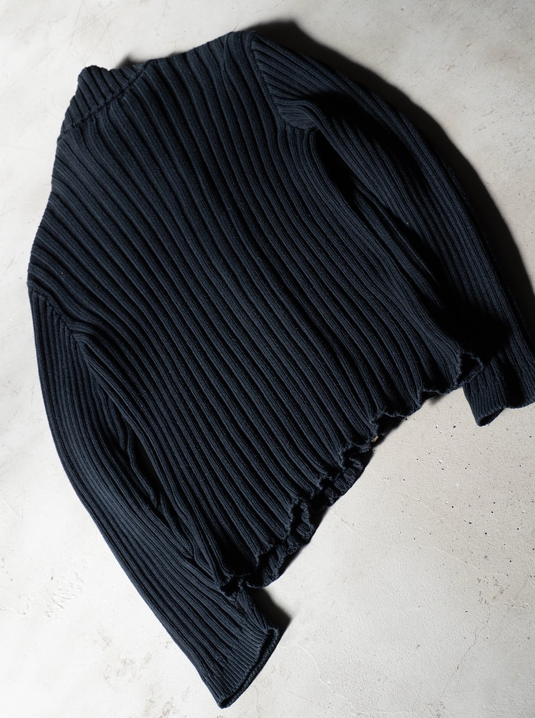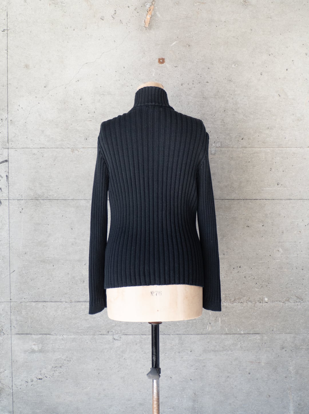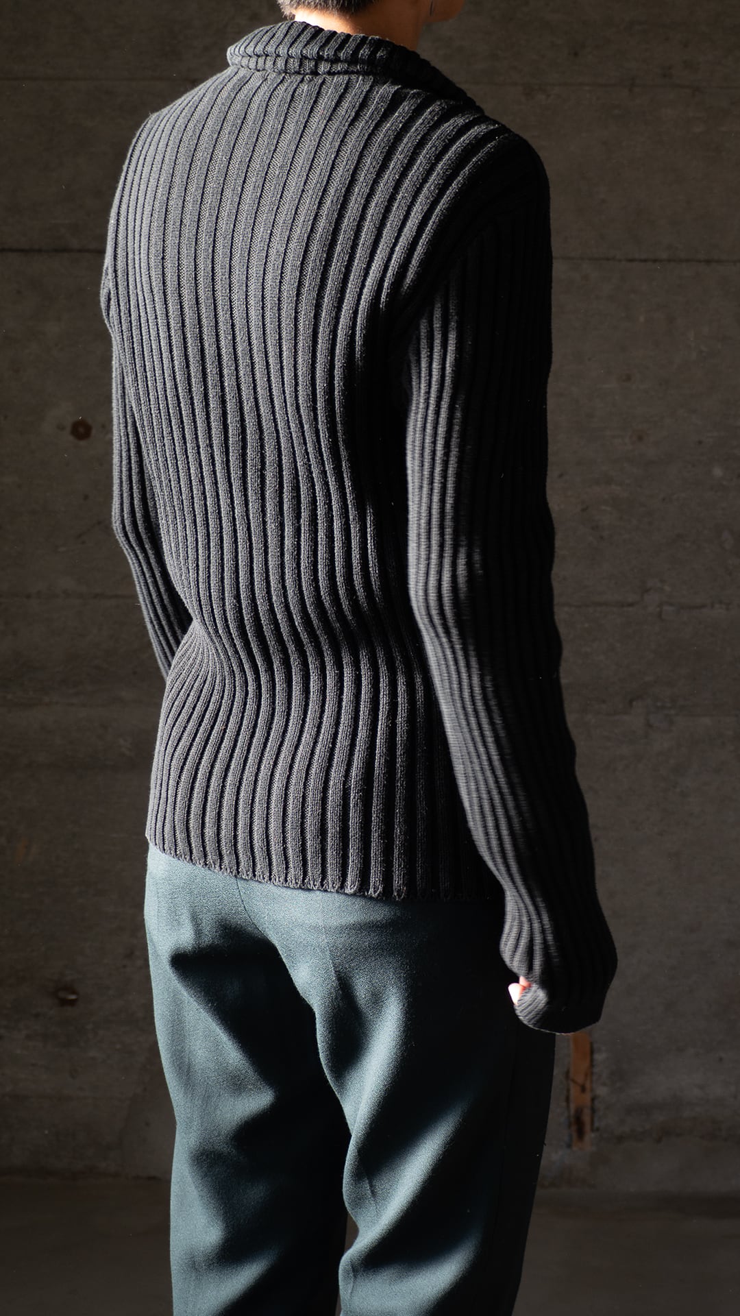 このニットは、極太番手のコットン糸を3コースごとの太幅畦編みをグランドに、前身頃にのみケーブル編みの意匠を加えたデザインになっています。