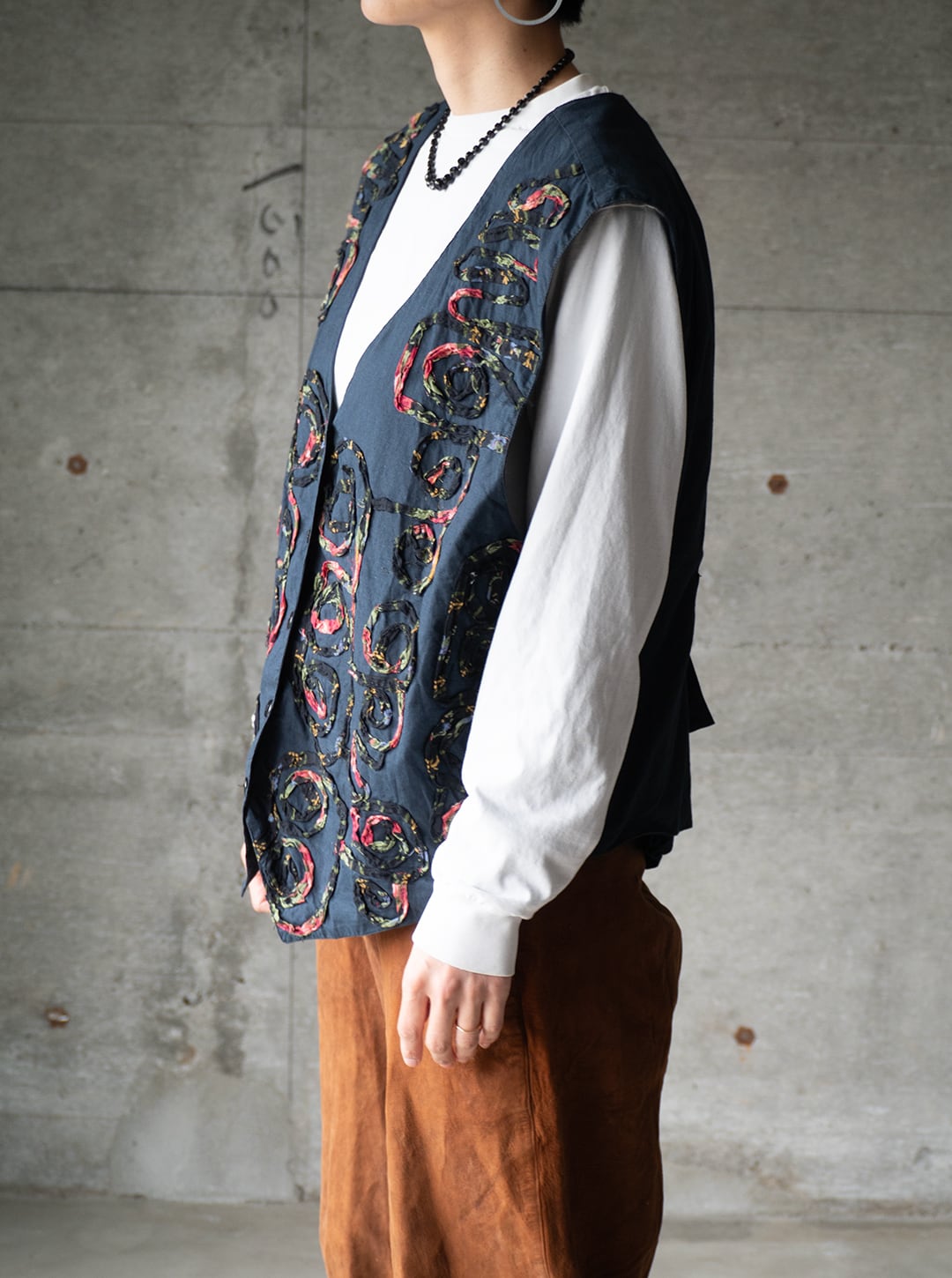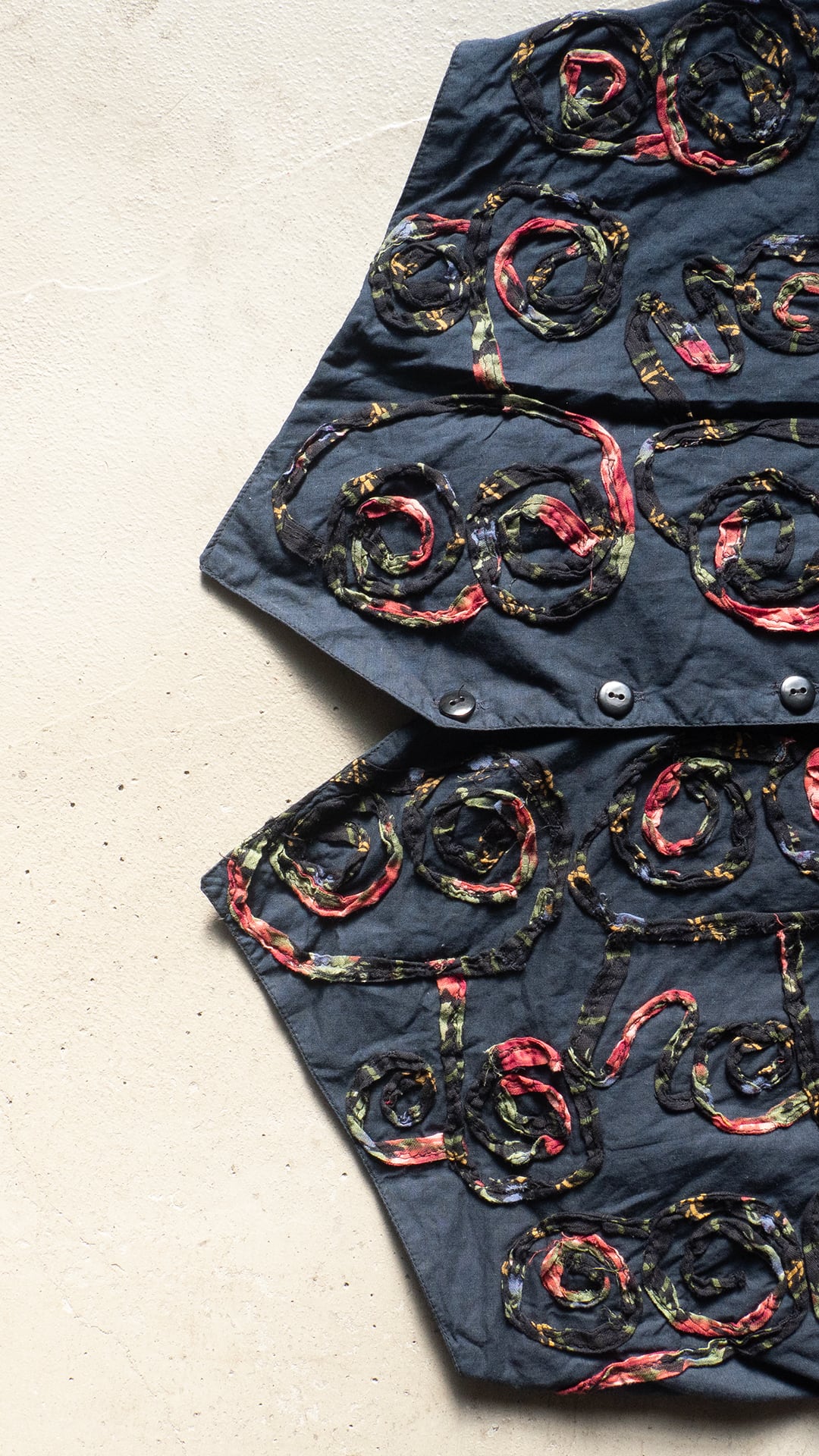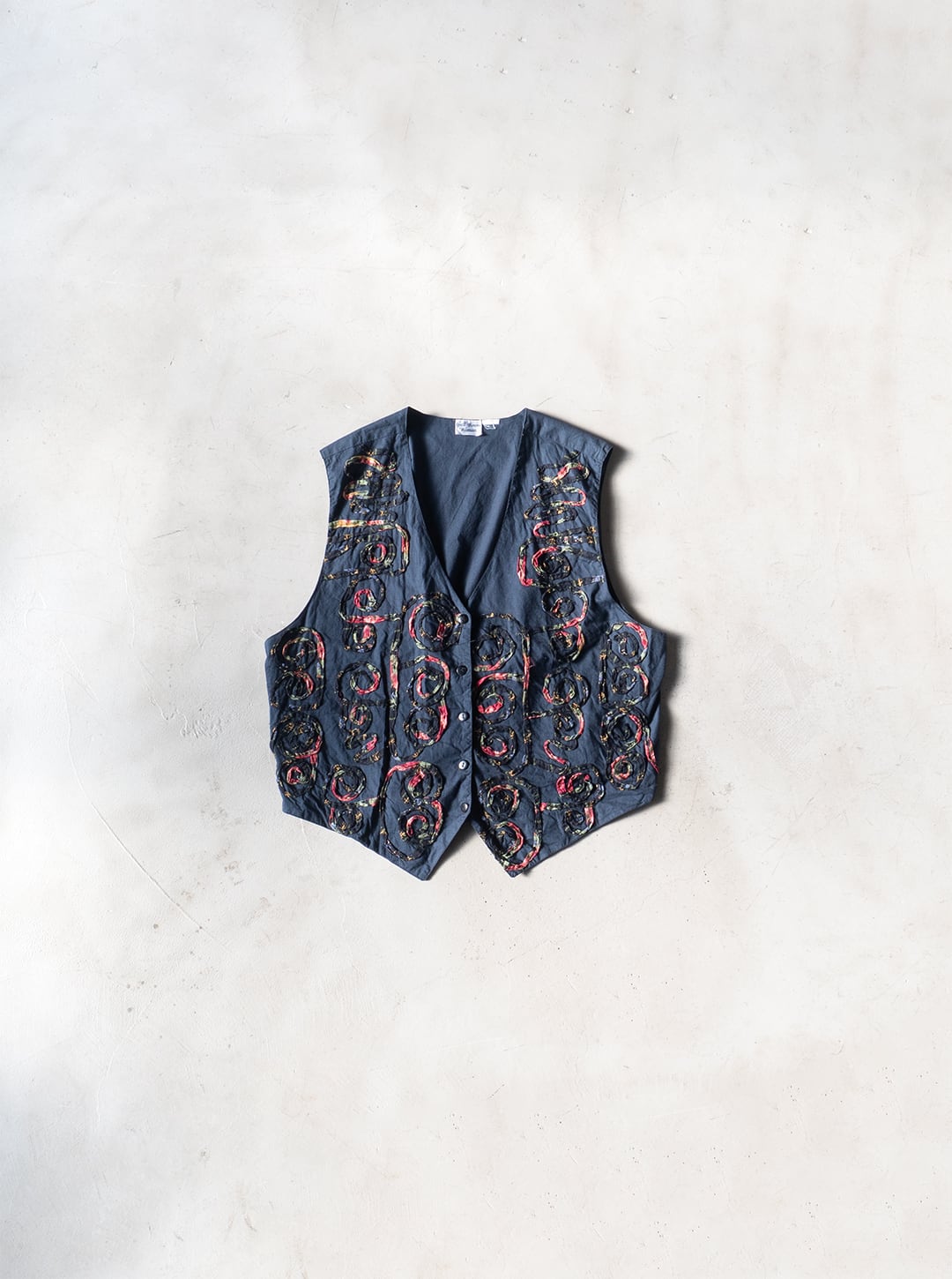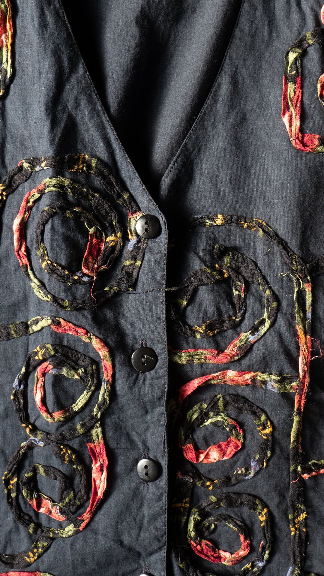 今回の一着は、素材表記タグが欠損しているため推定になりますが、おそらくコットン素材で薄手のポプリンをグランドファブリックおよび裏地にも用いたベスト。渦を巻いた模様を、柄プリントを施したガーゼ素材を丸めるように畳み、ミシンステッチによって縫い留めています。