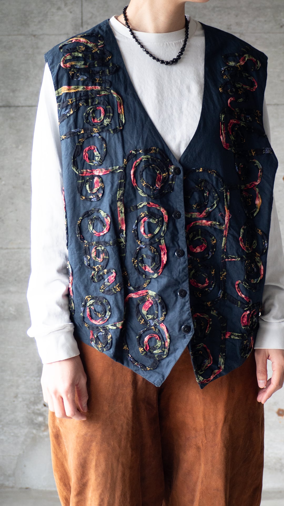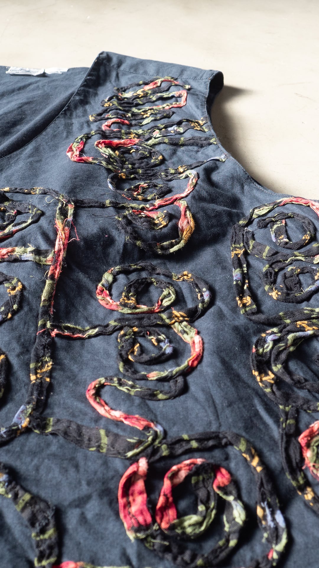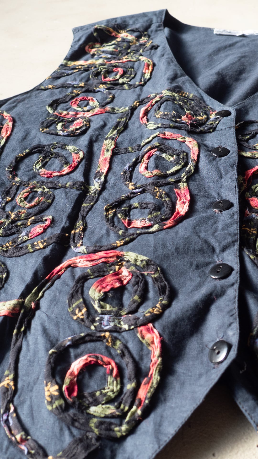 今回の一着は、素材表記タグが欠損しているため推定になりますが、おそらくコットン素材で薄手のポプリンをグランドファブリックおよび裏地にも用いたベスト。渦を巻いた模様を、柄プリントを施したガーゼ素材を丸めるように畳み、ミシンステッチによって縫い留めています。