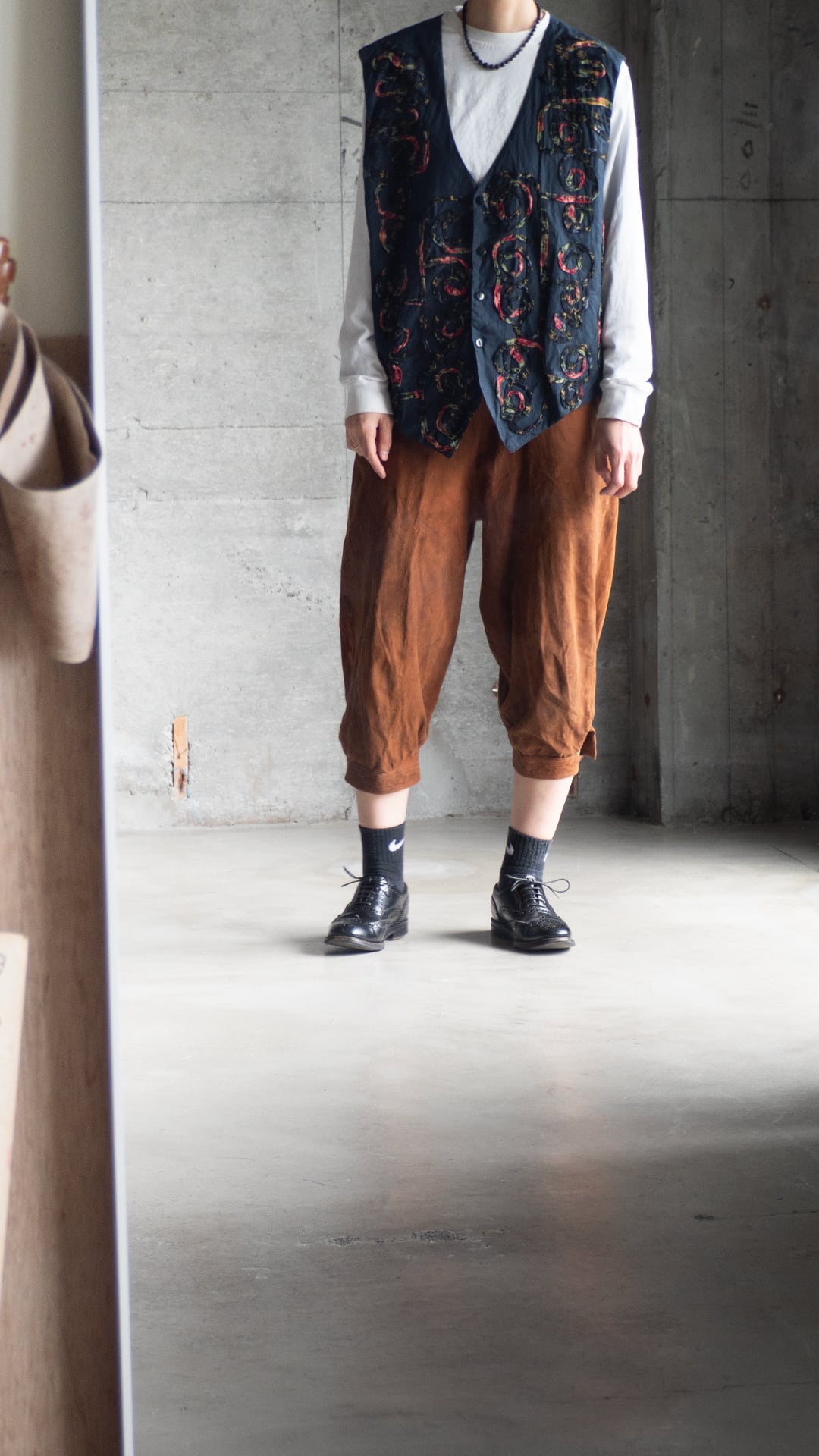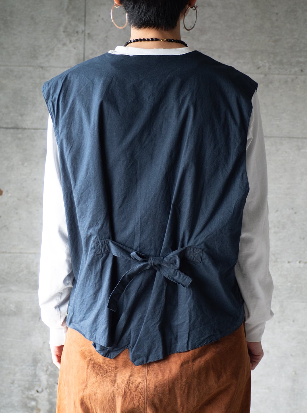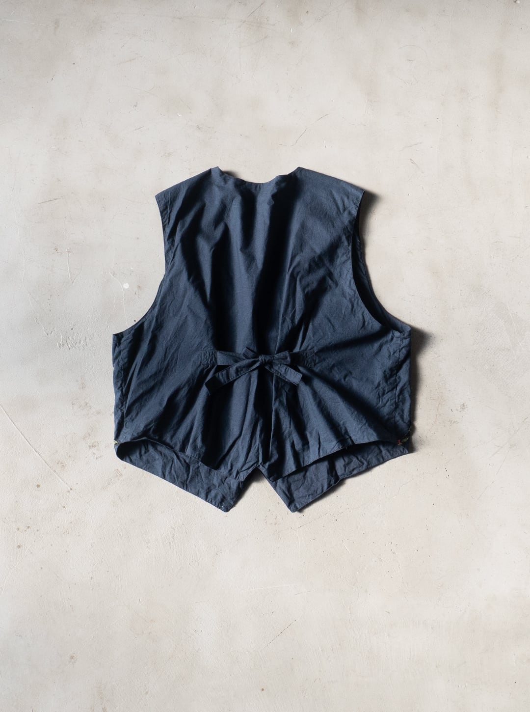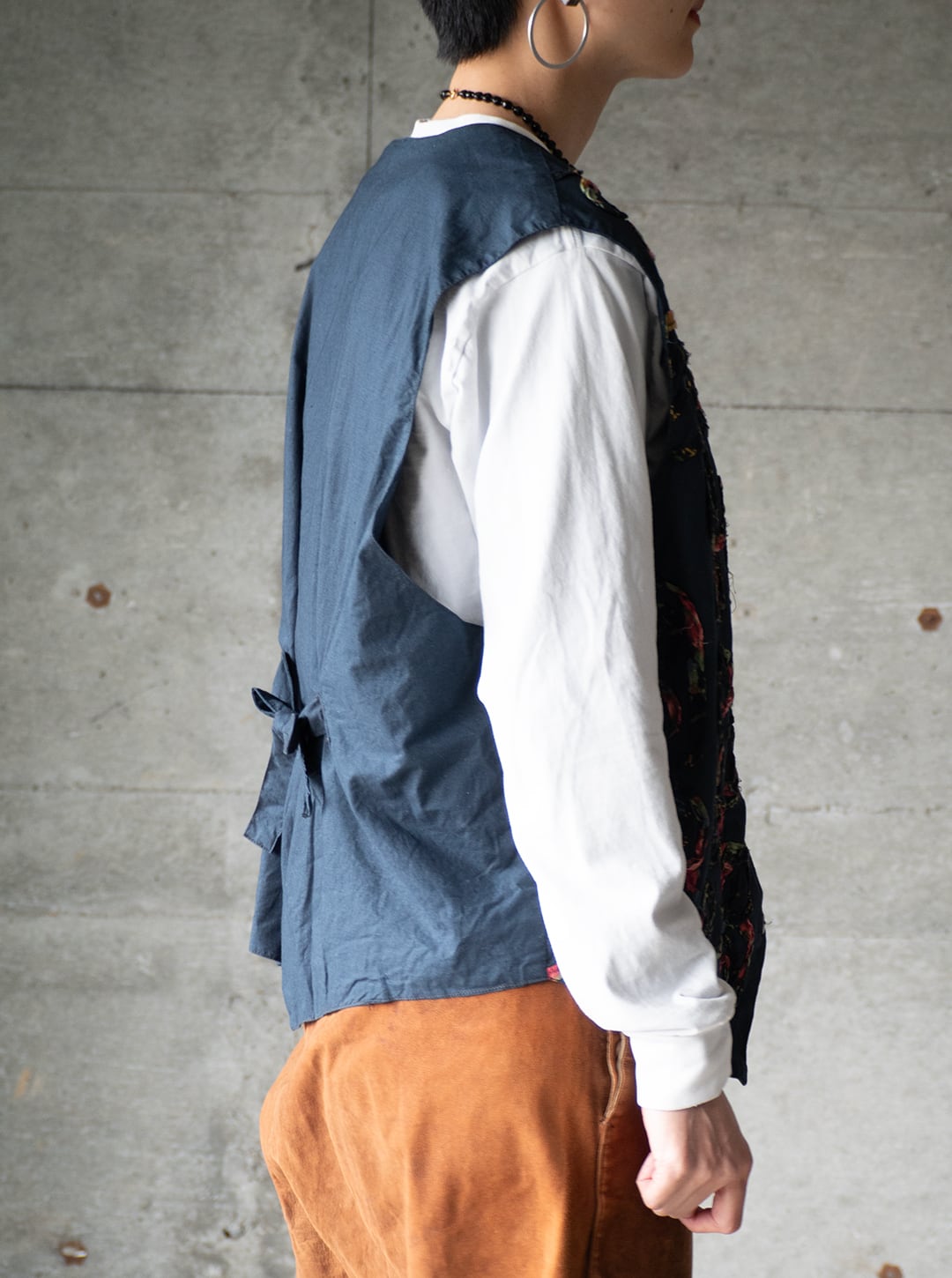 今回の一着は、素材表記タグが欠損しているため推定になりますが、おそらくコットン素材で薄手のポプリンをグランドファブリックおよび裏地にも用いたベスト。渦を巻いた模様を、柄プリントを施したガーゼ素材を丸めるように畳み、ミシンステッチによって縫い留めています。