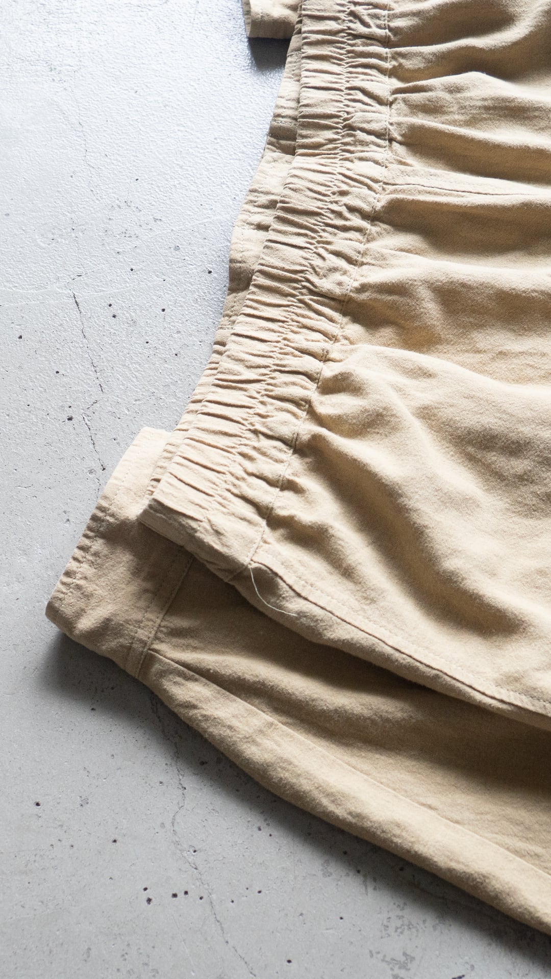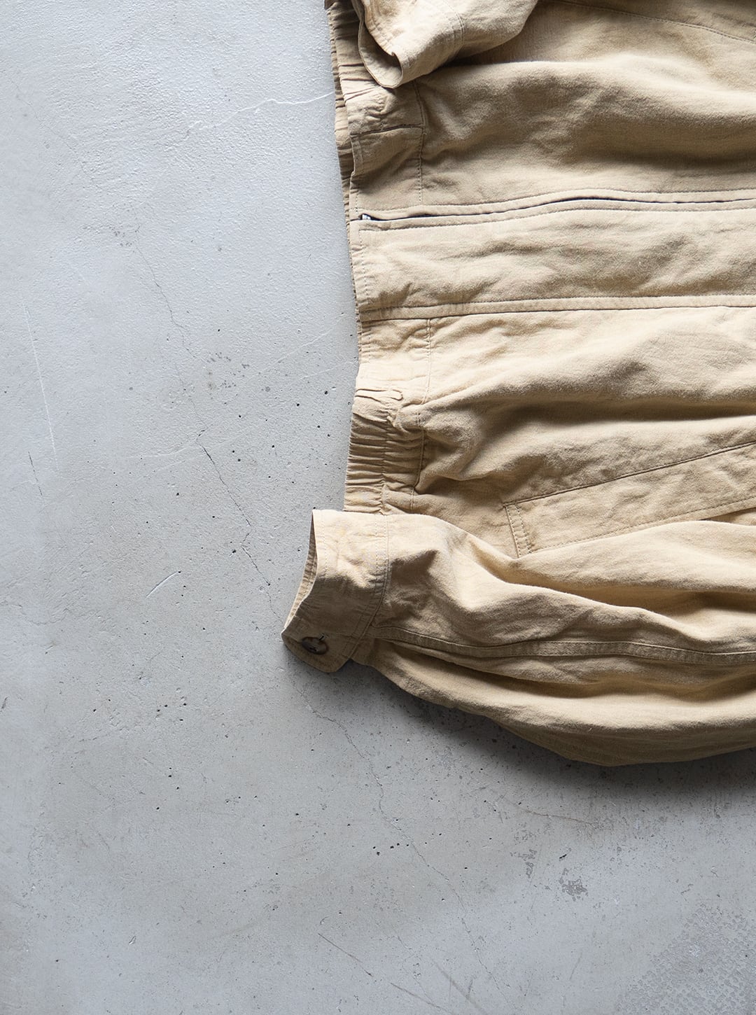 リネン65%、レーヨン20%、コットン15%という三者混により、リネンのシャリ感がありながら、レーヨンのドレープ感とが混ざり合った独特な風合いの生地になります。