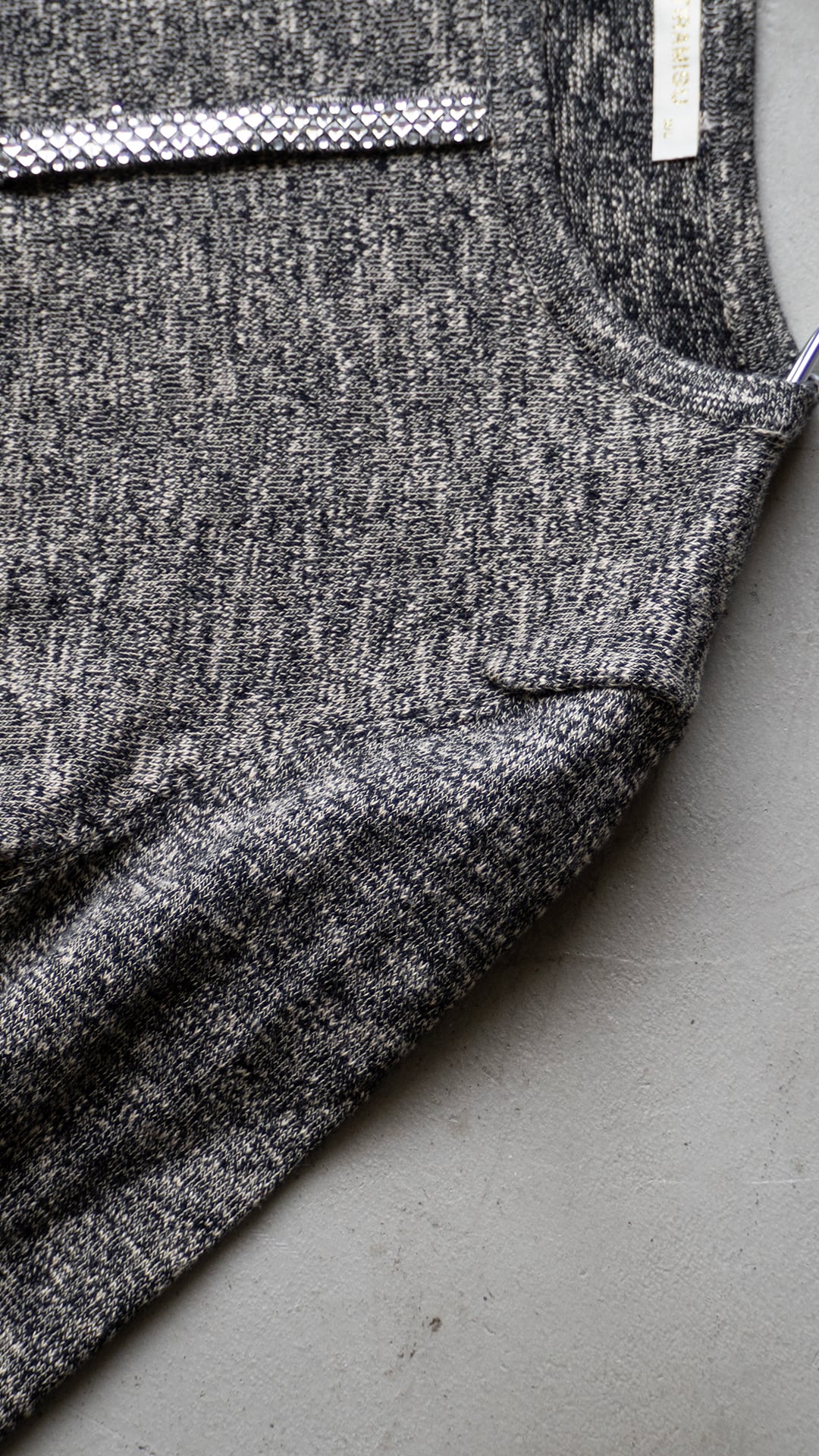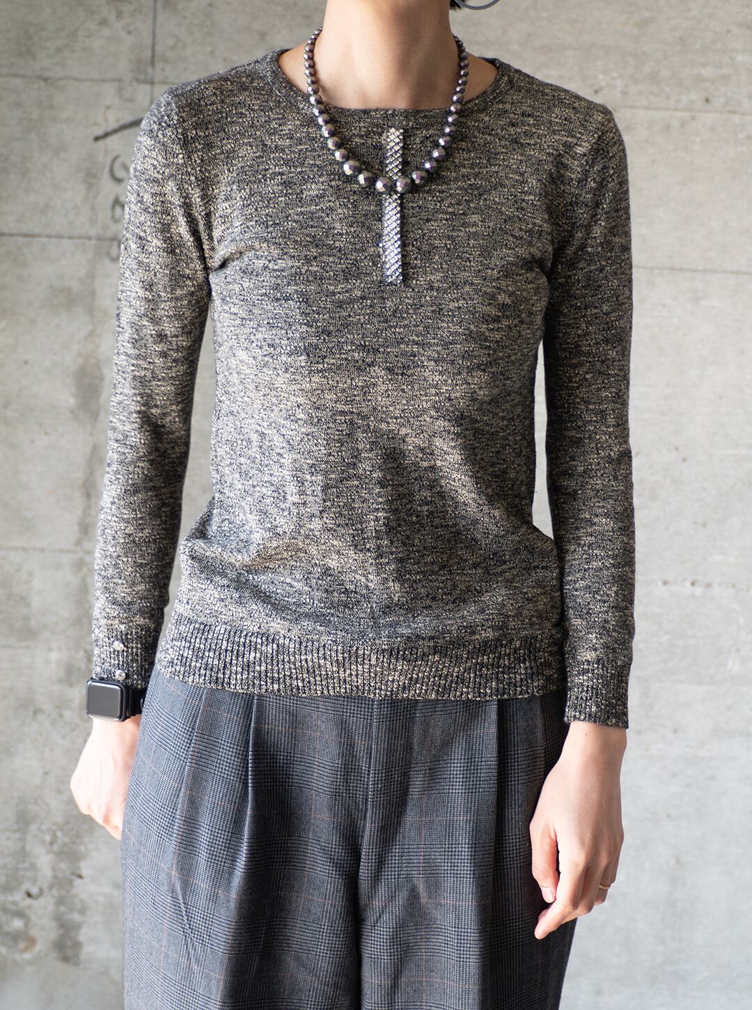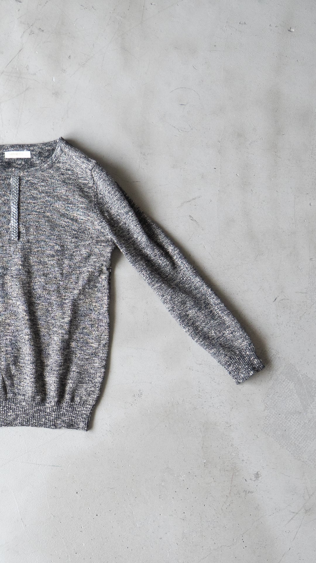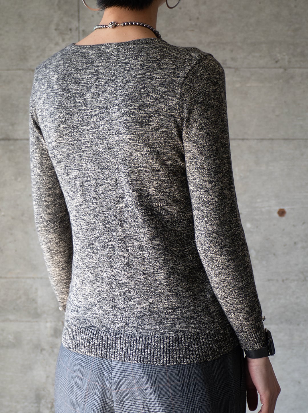 非常にシンプルなクルーネックのボディに、メランジ調の色味に少しだけ馴染むように、それでもしっかりとアクセントになる装飾です。