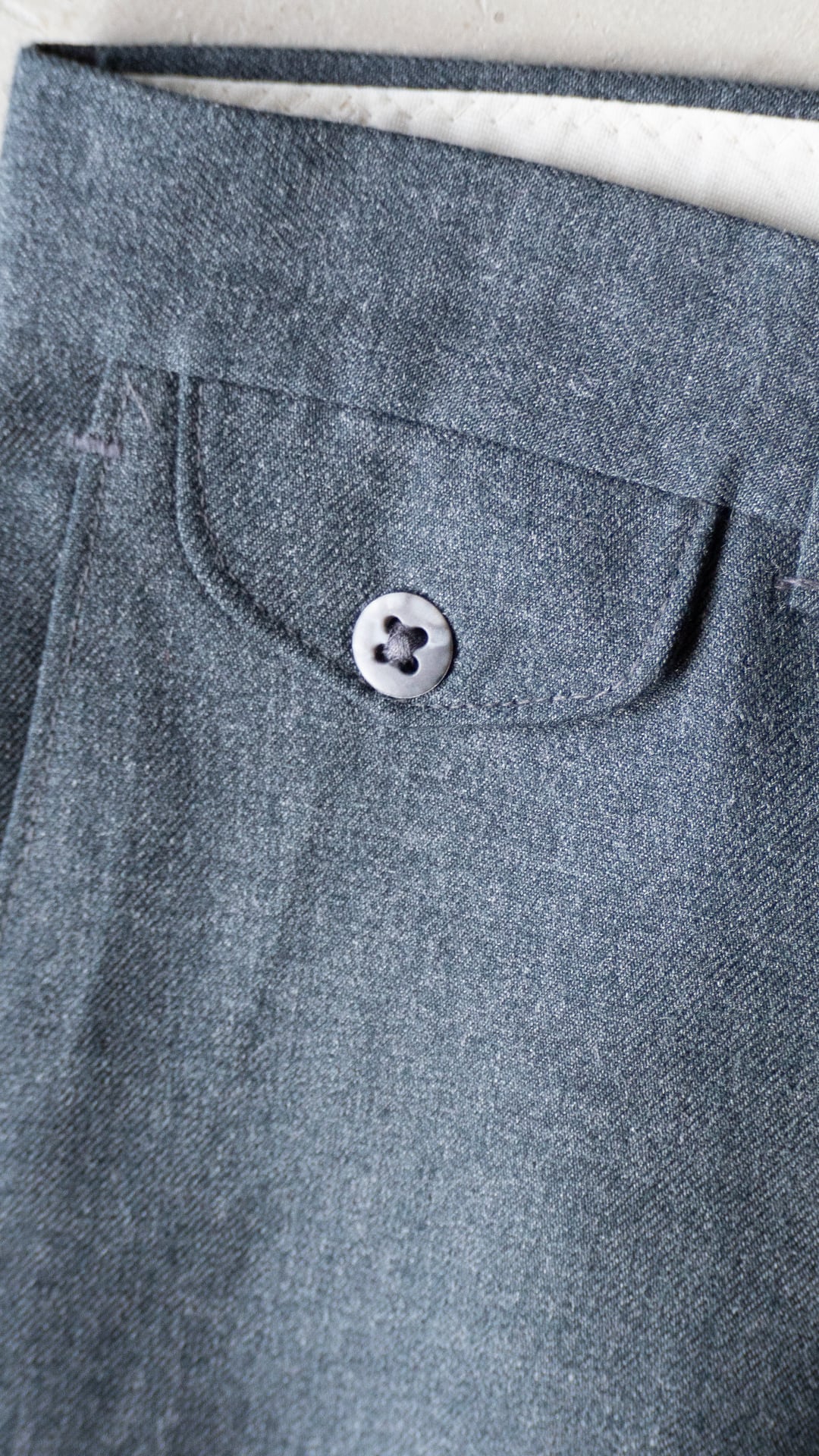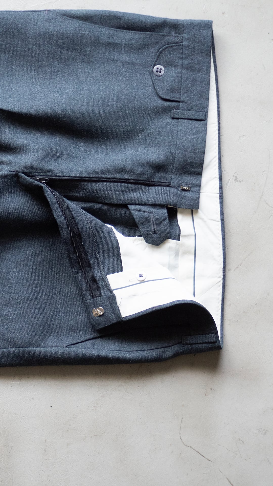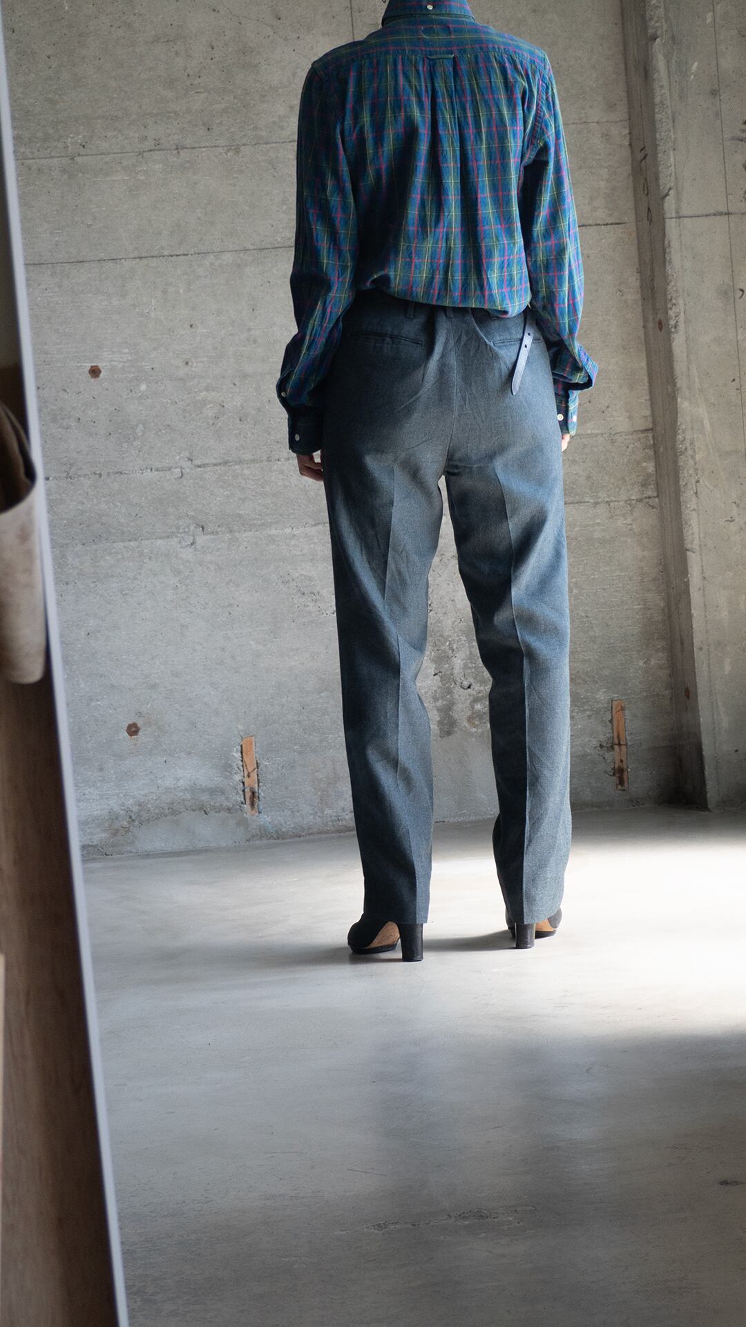 腰帯切り替え、ノータック、コインポケットを配備、内側は天狗、マーベルト仕様の正統派なスラックスです。膝あたりからストレート気味になるシルエットです。