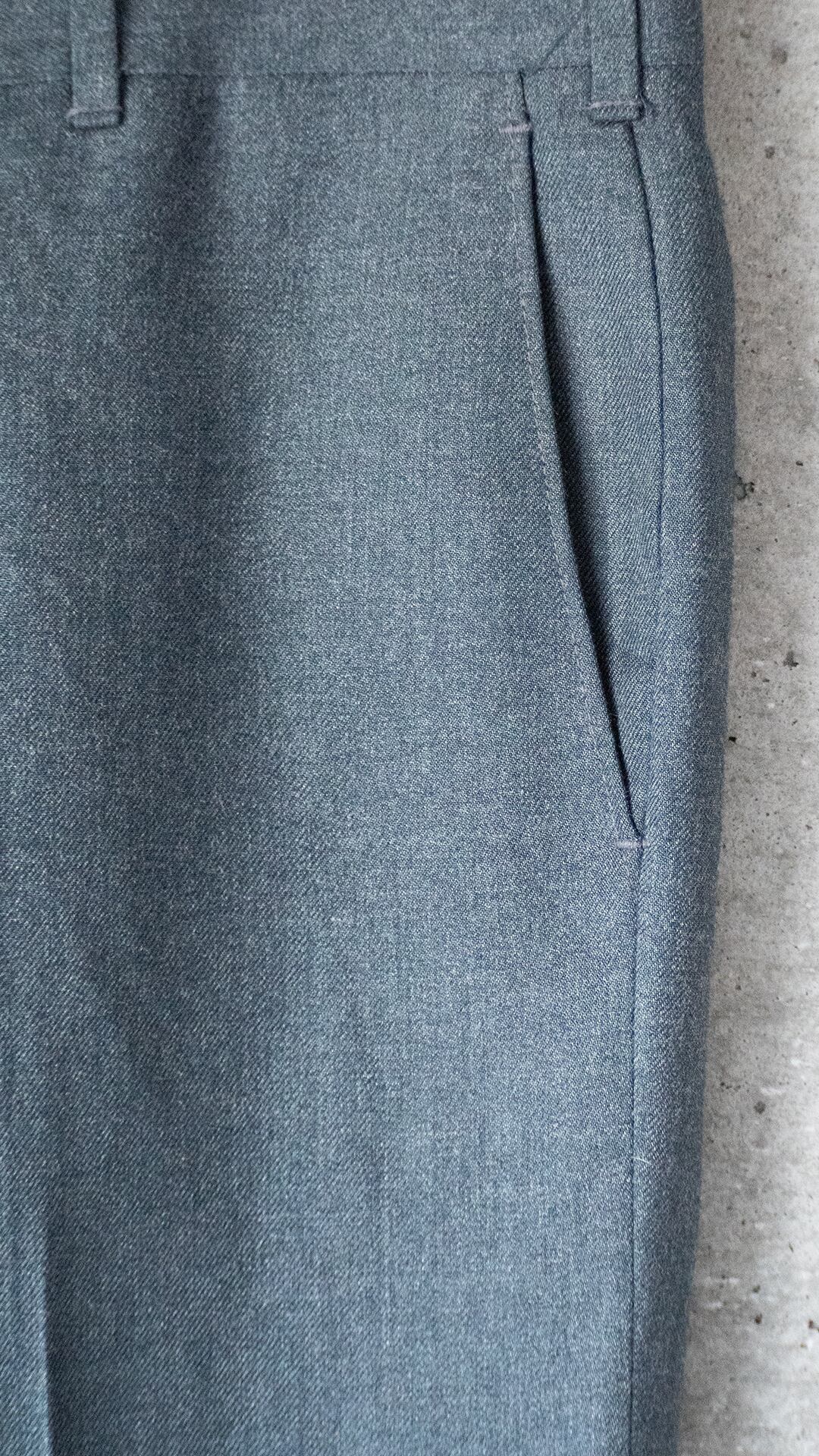 このスラックスの特徴は、ダクロンポリエステルを用いている点。ダクロンとは、アメリカのインビスタ社(旧デュポン社)が開発したポリエステル繊維ダクロンはその高い耐久性や放湿性が強みという素材です。他の化繊繊維と比較して長期間の使用や洗濯、乾燥などによって型崩れしにくいと言われています。