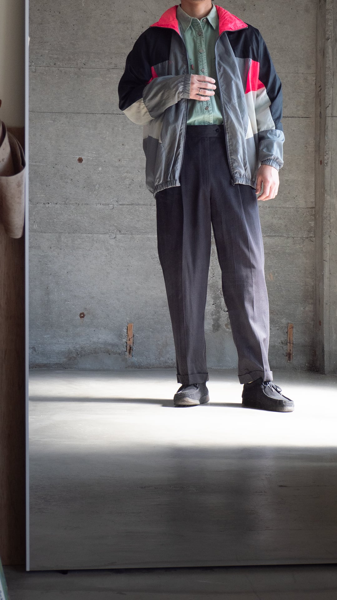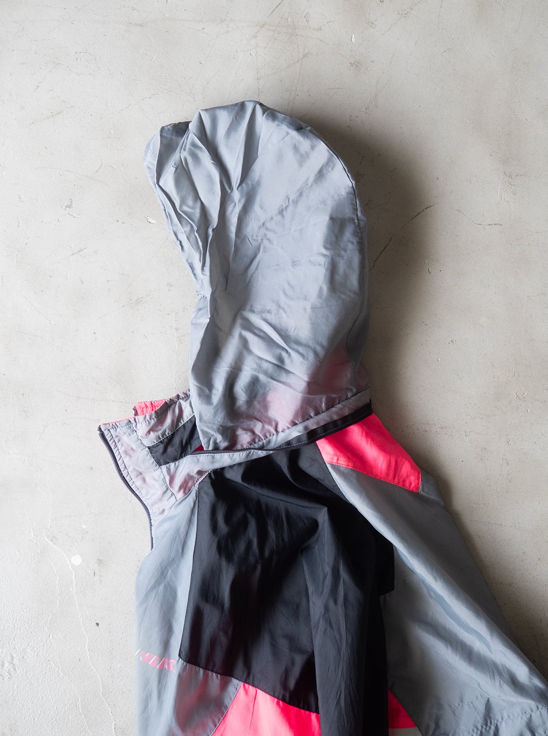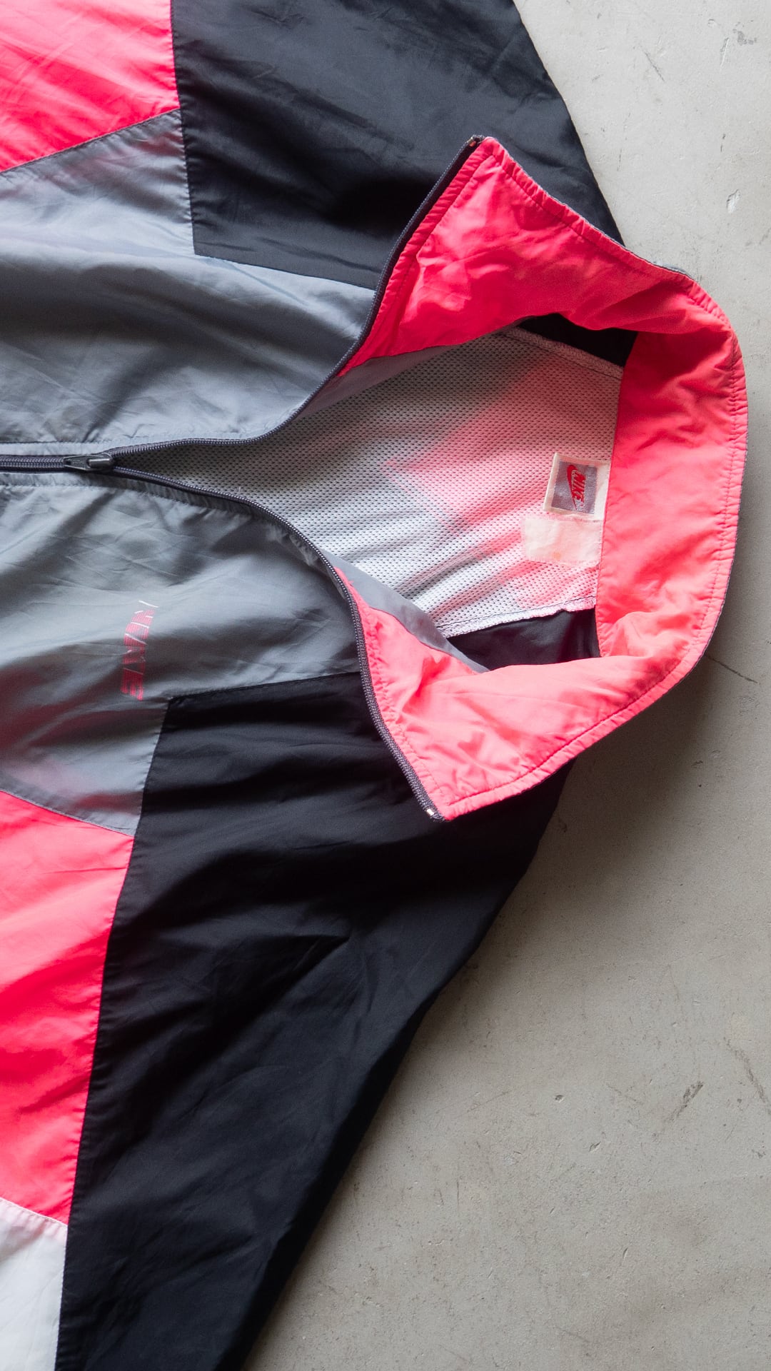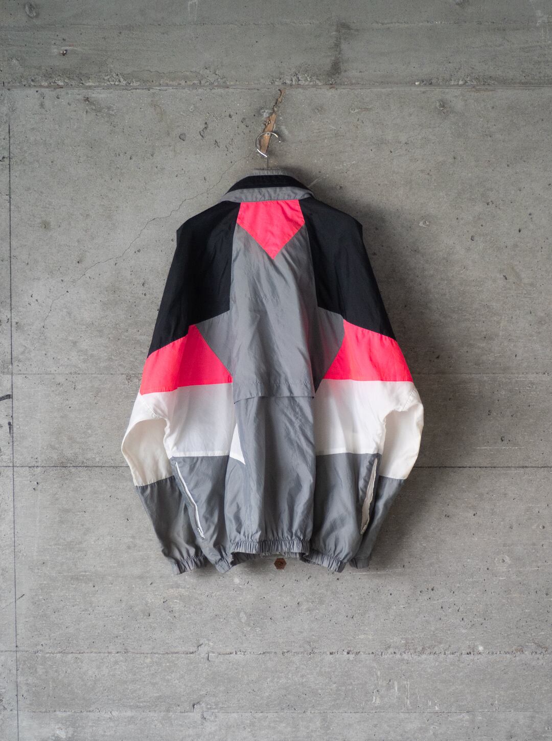 ピンク、ブラック、グレー、ホワイトのカラーブロックが施された、ビッグシルエットのトラックジャケットです。ブランドはNIKE(ナイキ)で90年代製、いわゆる銀タグが付属します。
