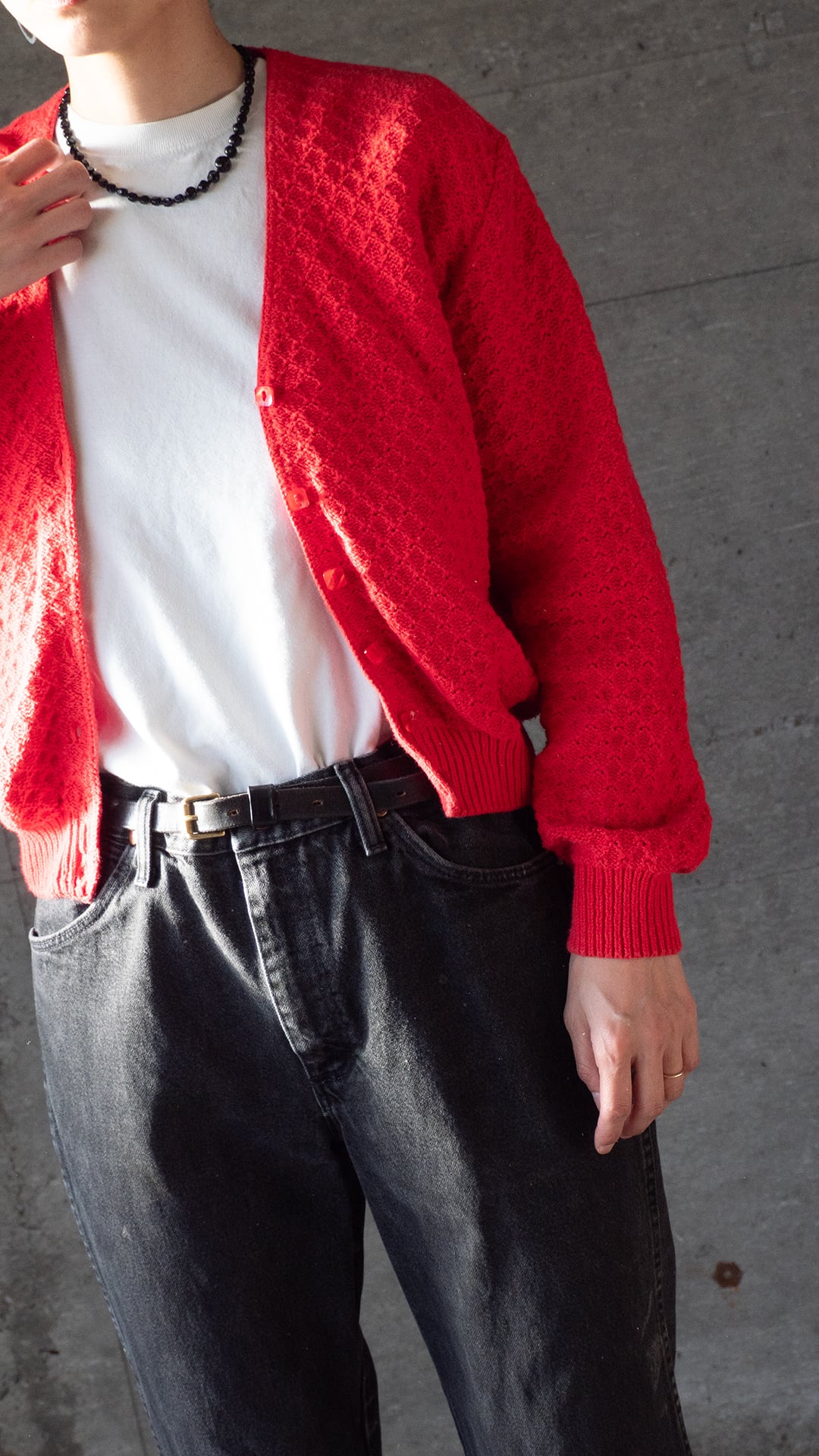 赤いコットン素材のカーディガンです。ブランドは「Lizsport(リズスポーツ)」。Lizsport(リズスポーツ)は、アメリカを代表するファッションデザイナー、リズ・クレイボーン(Liz Claiborne)が1976年に設立したブランド「Liz Claiborne」のスポーツウェア・ライン。リズスポーツは1985年にスタートしています。