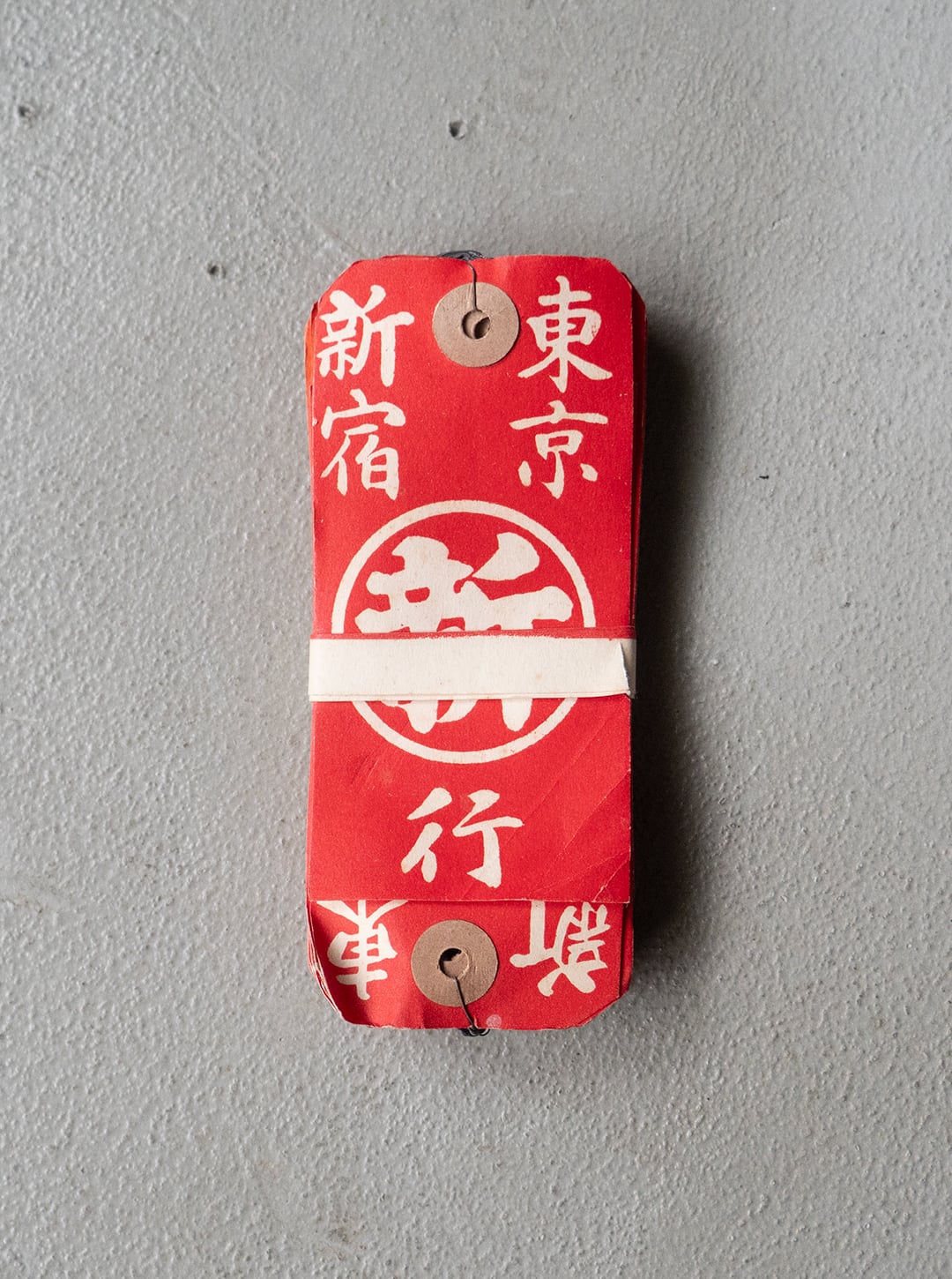 中央の丸い図案の中に書かれた「新」、そして「東京」と「新宿」の文字や、行き先を表す「行」の文字など、はっきりとした用途は不明です、荷札を目的に作られていたものということは間違いないと思います。
